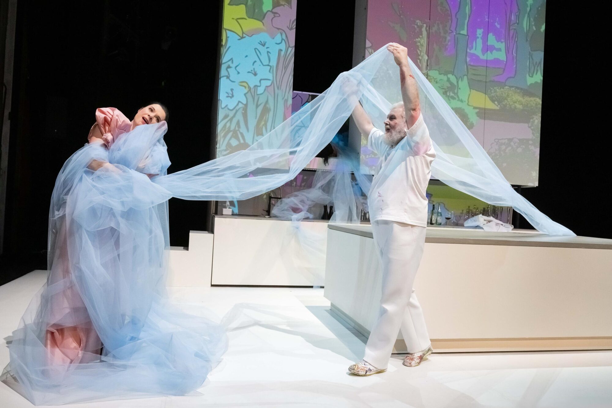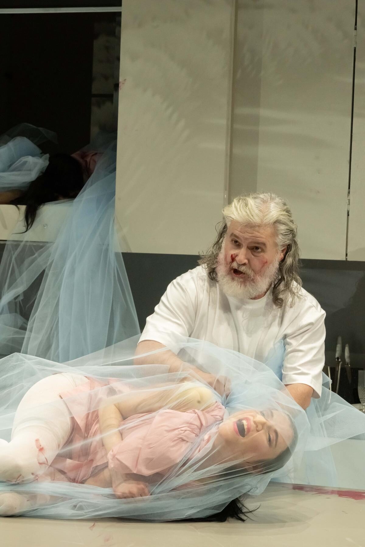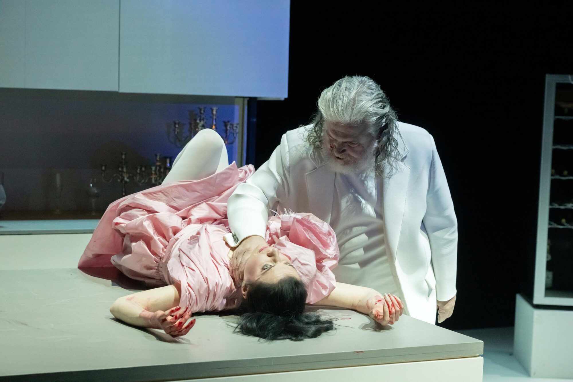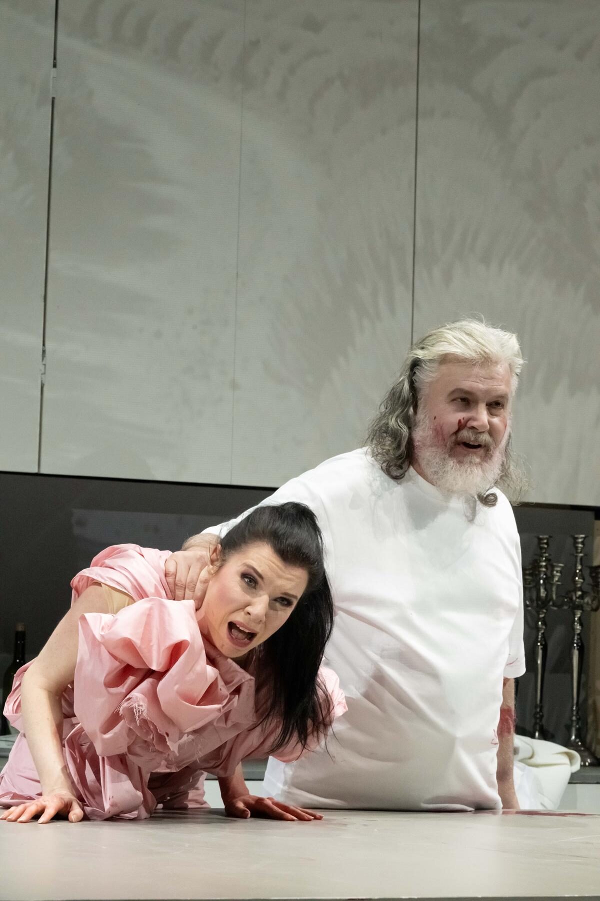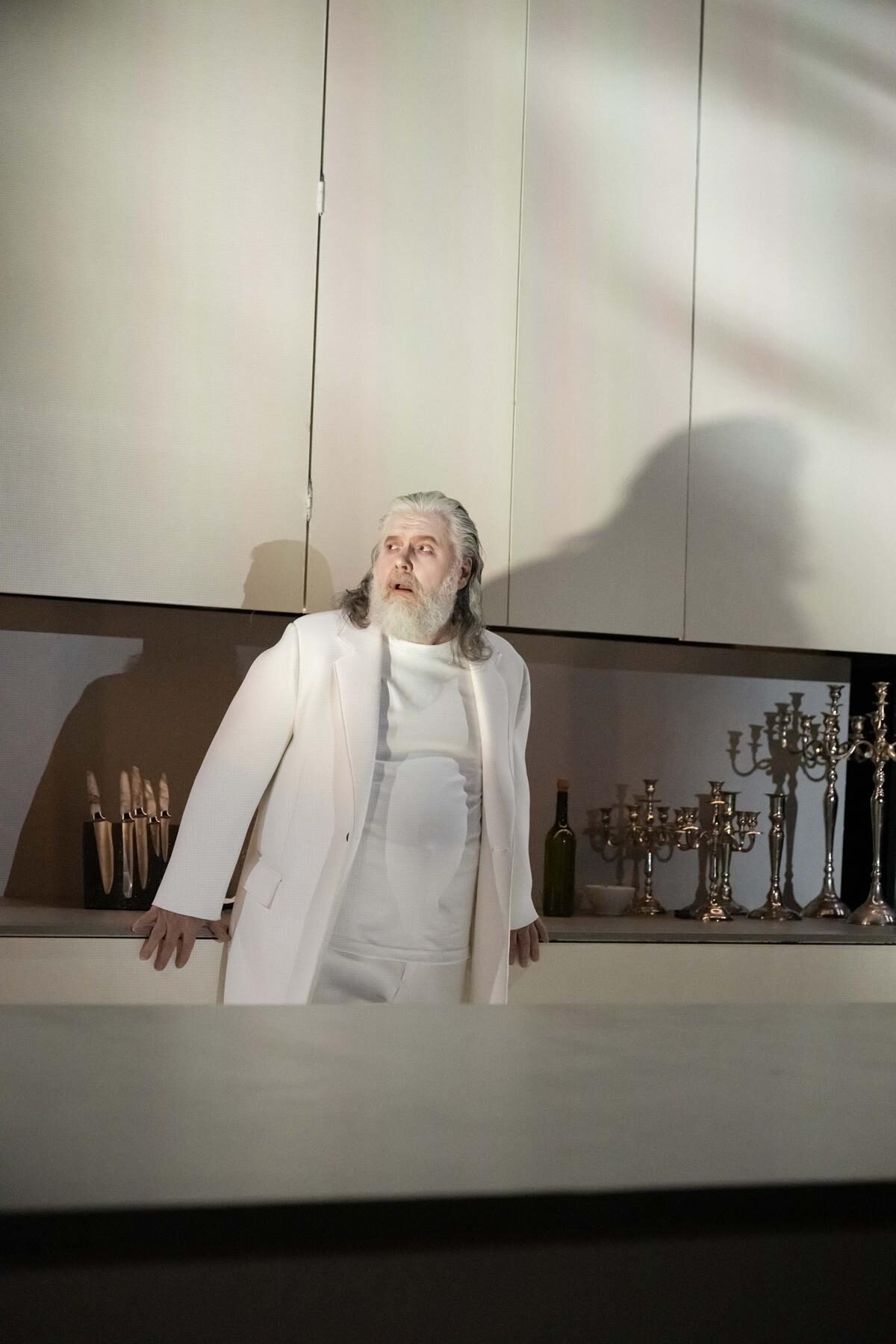 Das Bühnenbild ist fast das gleiche geblieben, nur der Schrank hat sich in gigantische Höhe verlängert. Ein symbolischer Anklang an die Burgmauern des düsteren Frauenmörders. Auch diese Kurzoper handelt von einem Ehekrieg.