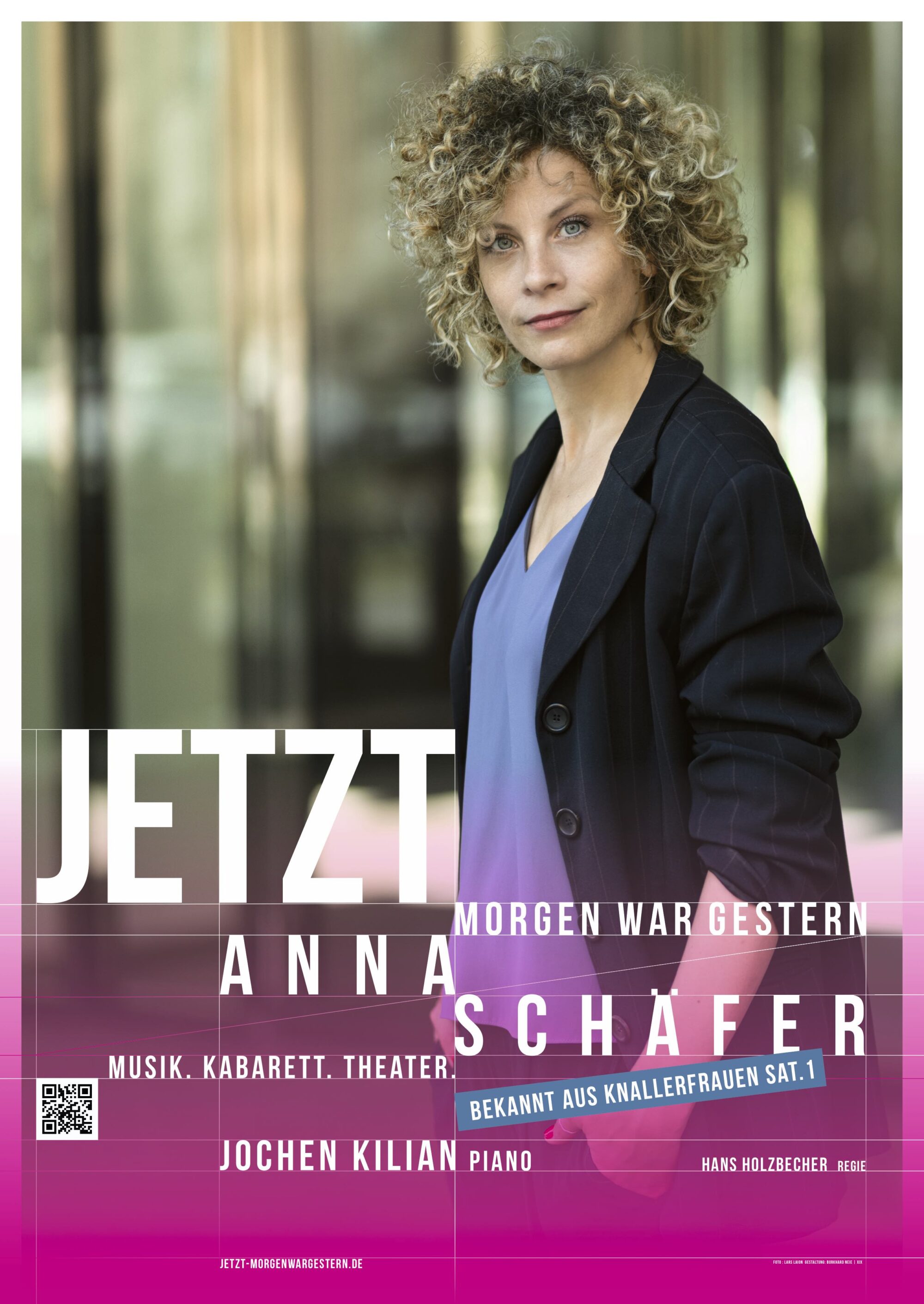 Nachdem sie fünf Jahre lang auf der Suche nach dem „Mann in mir“ durch die Theater und Kabaretts des Landes gereist ist, beschäftigt sich die Schauspielerin, Sängerin und Komödiantin ANNA SCHÄFER in ihrem neuen Abend „JETZT – morgen war gestern“ nun mit keinen geringeren Fragen als: