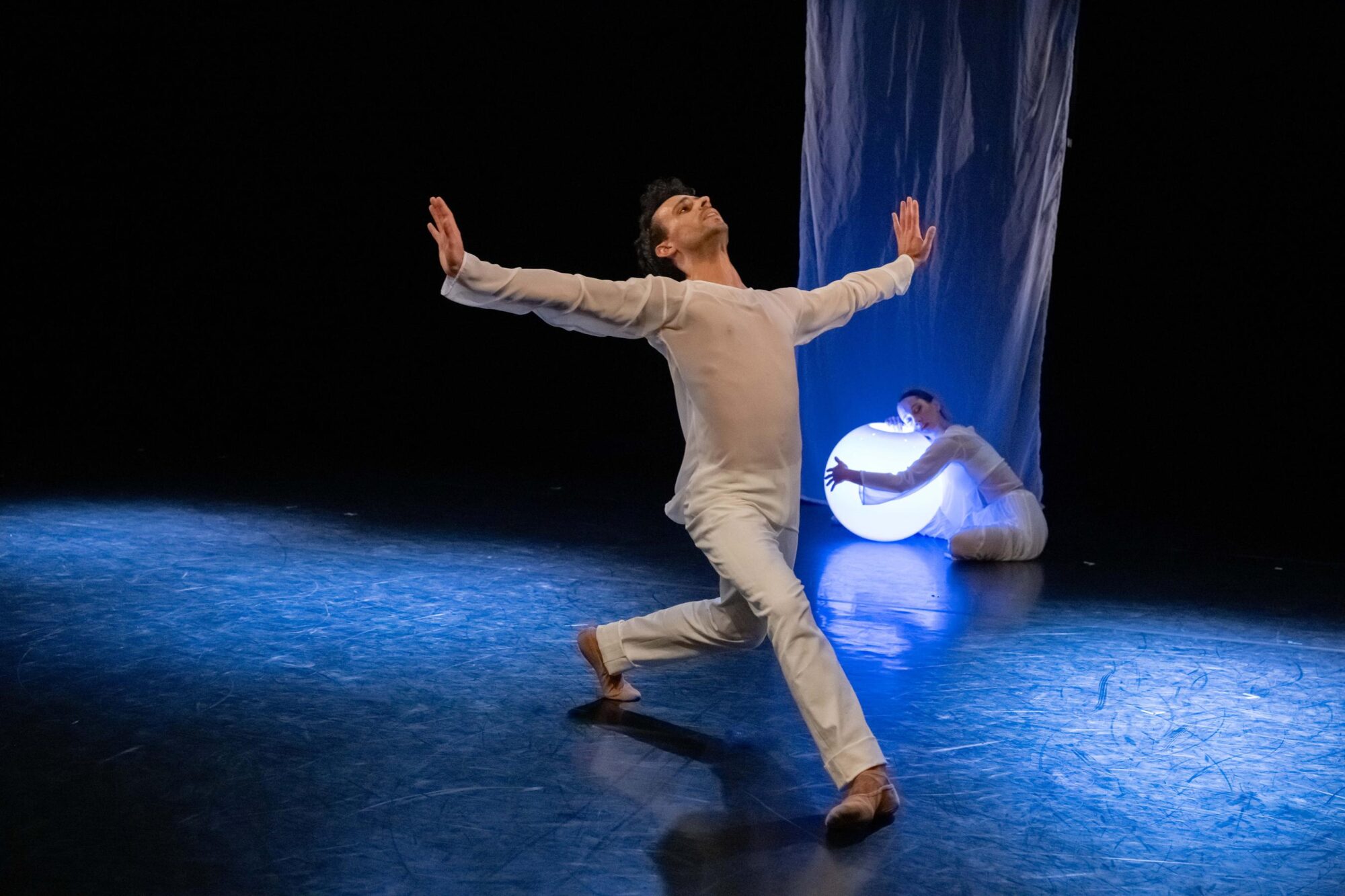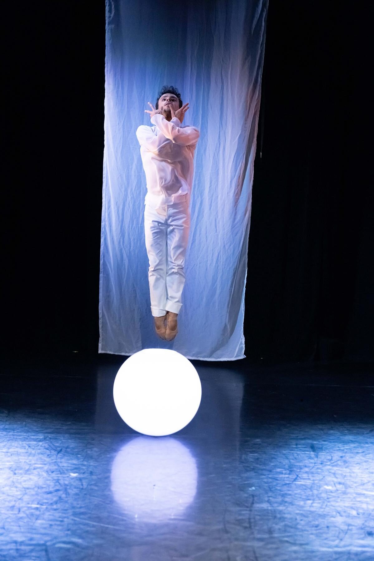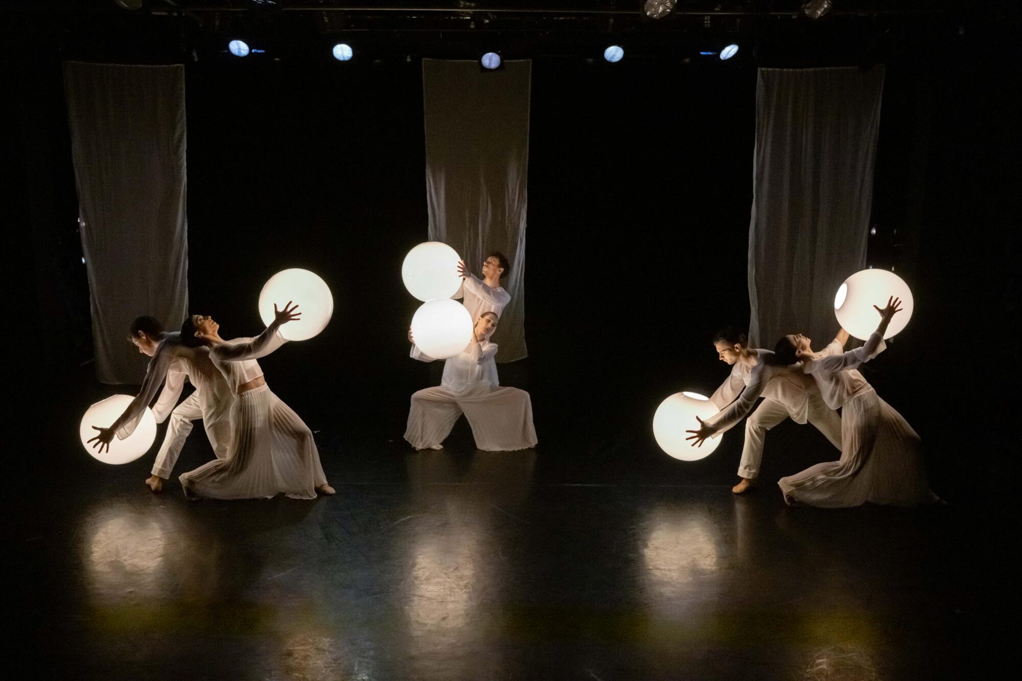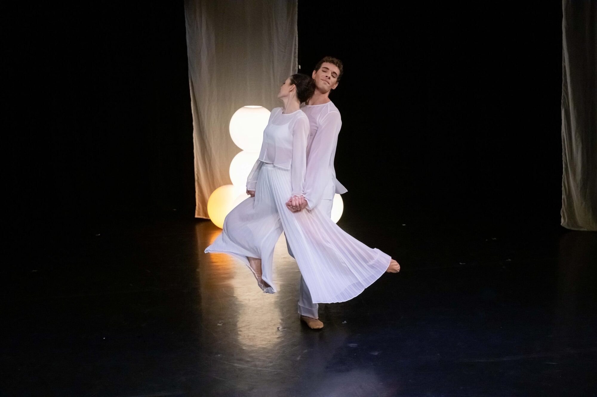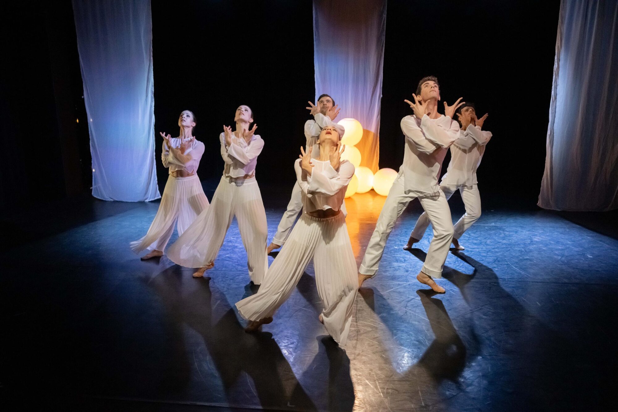 Die zweite Choreografie erzählt von Traumwelten und Empfindungen (…) Die sechs Tanzenden in dieser Choreografie sind weiß gekleidet. Weiß sind ebenso die sparsam gehängten Stoffbahnen. Zentrales Requisit sind Leuchtkugeln als Symbol für eine kleine Welt und einen ersten Funken Licht. Sie sind ein wichtiges Element in der sehr lebendigen und ausdrucksvollen Interaktion der Tanzenden mit dem Raum. Und sie unterstreichen anmutig die Atmosphäre der lyrisch anmutenden Choreografie zu drei Stücken aus Sergej Rachmaninows Klavier- und Kammermusik. Borghesanis Choreografie verbindet Elemente des klassischen Balletts mit der abstrakten Erzählung über mögliche Einflüsse auf die Traumwelt. Das Ensemble überzeugt in der poetisch anmutenden Aufführung mit Einfühlungsvermögen und Können.