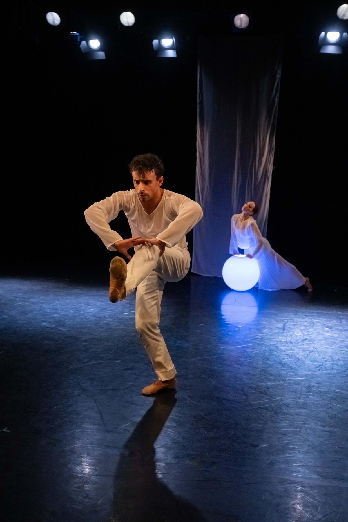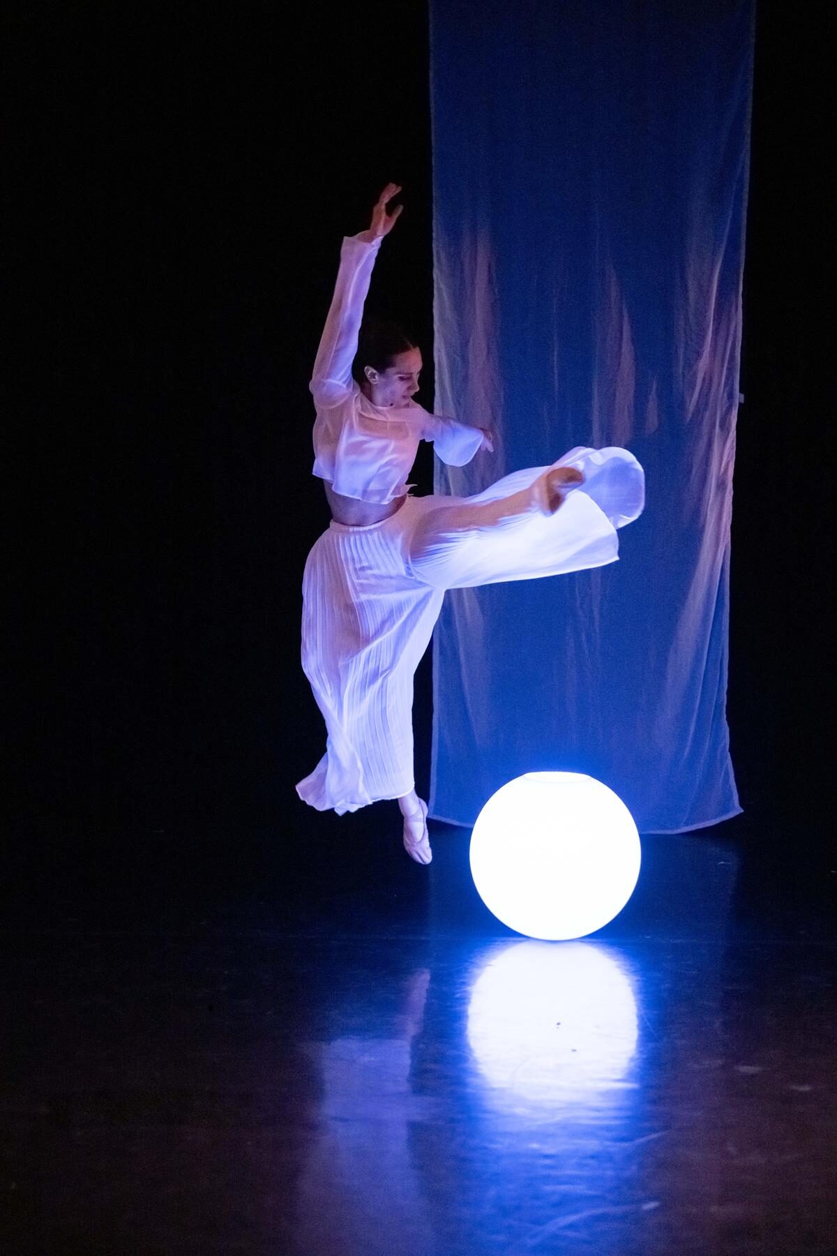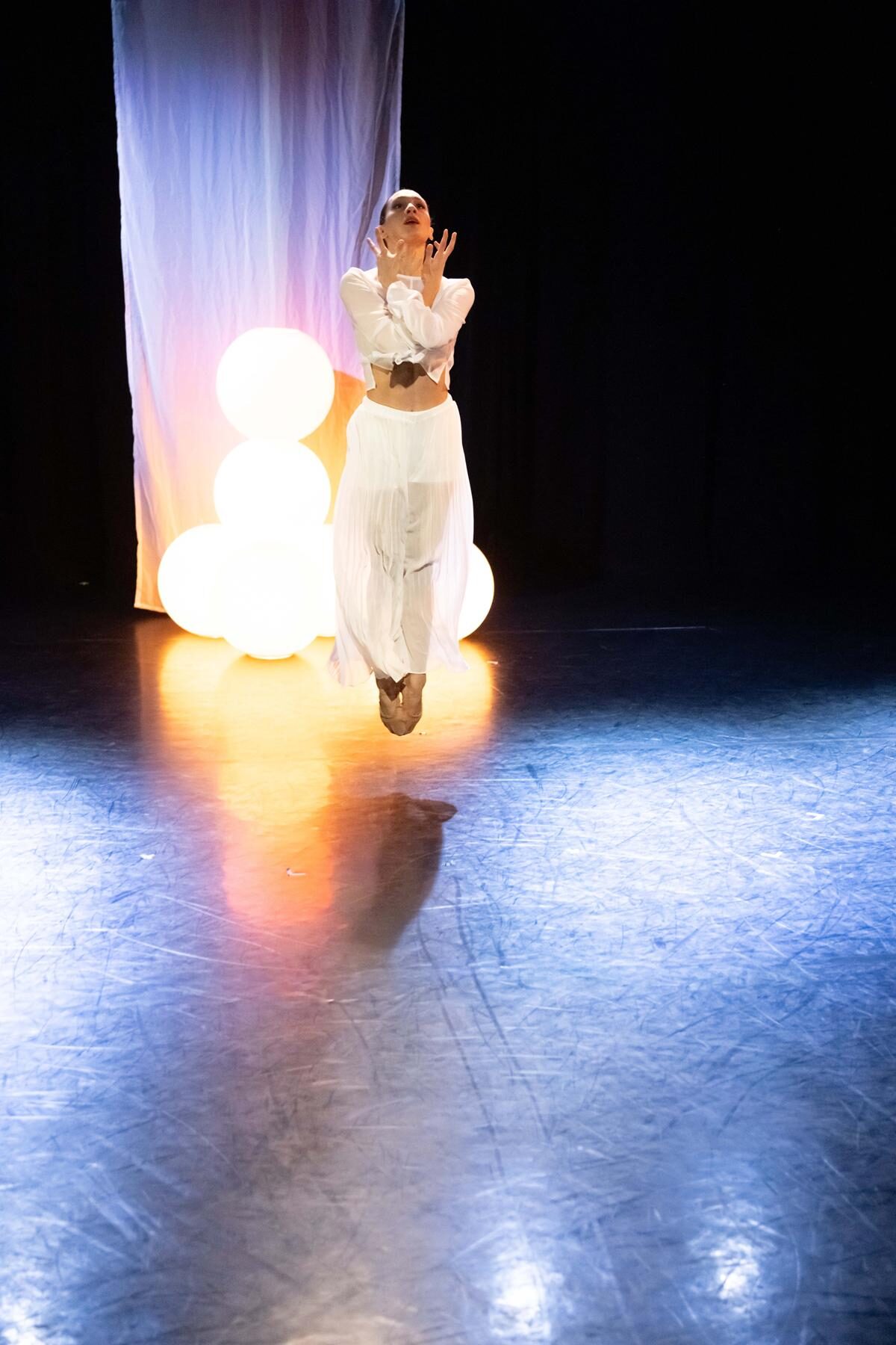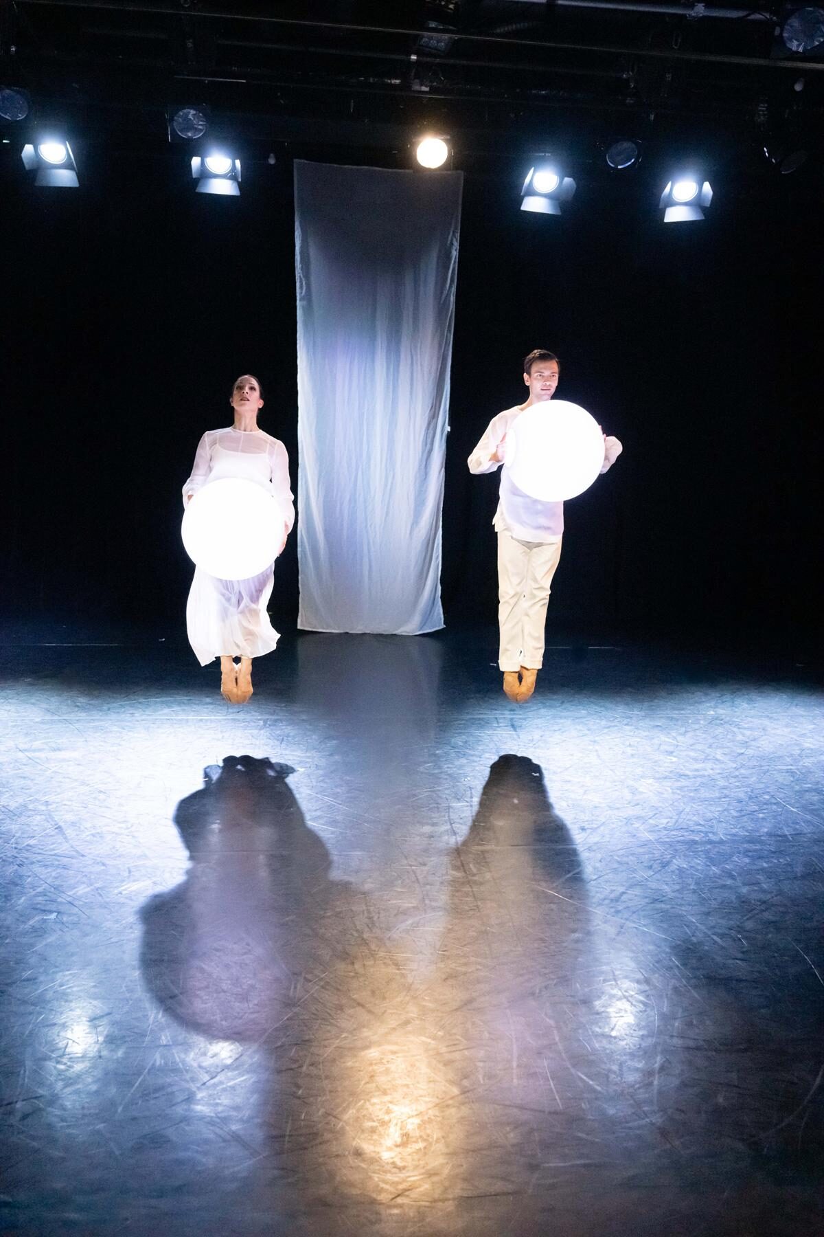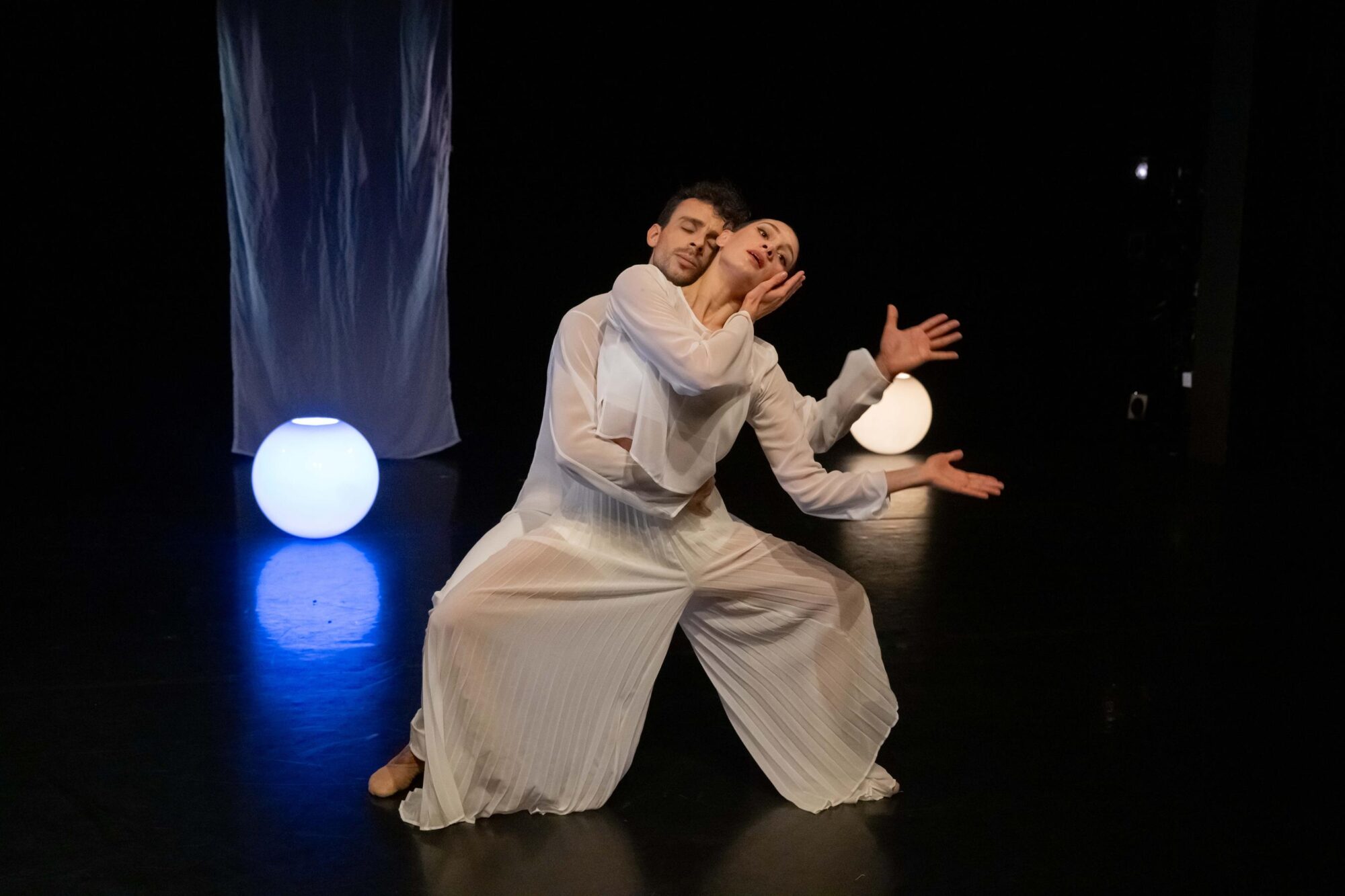 Die zweite Choreografie erzählt von Traumwelten und Empfindungen (…) Die sechs Tanzenden in dieser Choreografie sind weiß gekleidet. Weiß sind ebenso die sparsam gehängten Stoffbahnen. Zentrales Requisit sind Leuchtkugeln als Symbol für eine kleine Welt und einen ersten Funken Licht. Sie sind ein wichtiges Element in der sehr lebendigen und ausdrucksvollen Interaktion der Tanzenden mit dem Raum. Und sie unterstreichen anmutig die Atmosphäre der lyrisch anmutenden Choreografie zu drei Stücken aus Sergej Rachmaninows Klavier- und Kammermusik. Borghesanis Choreografie verbindet Elemente des klassischen Balletts mit der abstrakten Erzählung über mögliche Einflüsse auf die Traumwelt. Das Ensemble überzeugt in der poetisch anmutenden Aufführung mit Einfühlungsvermögen und Können.