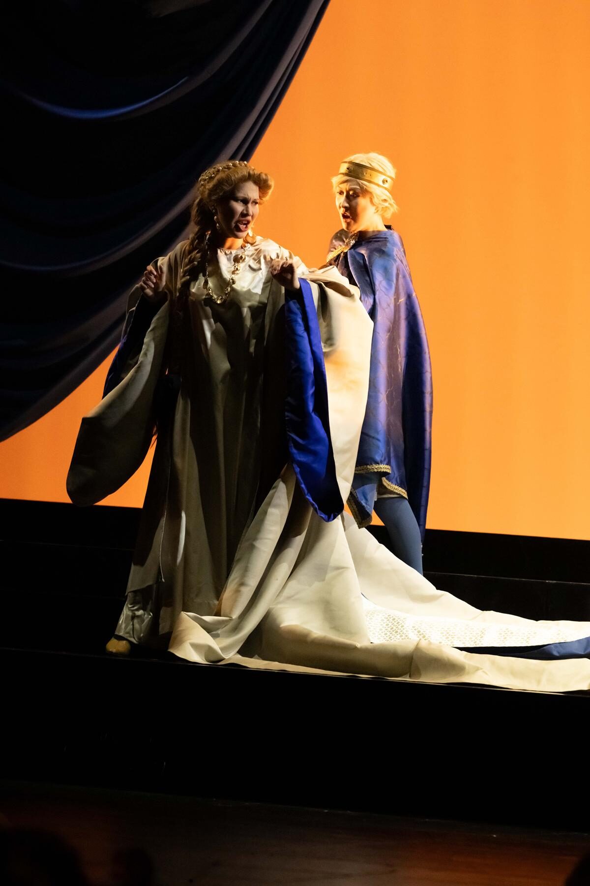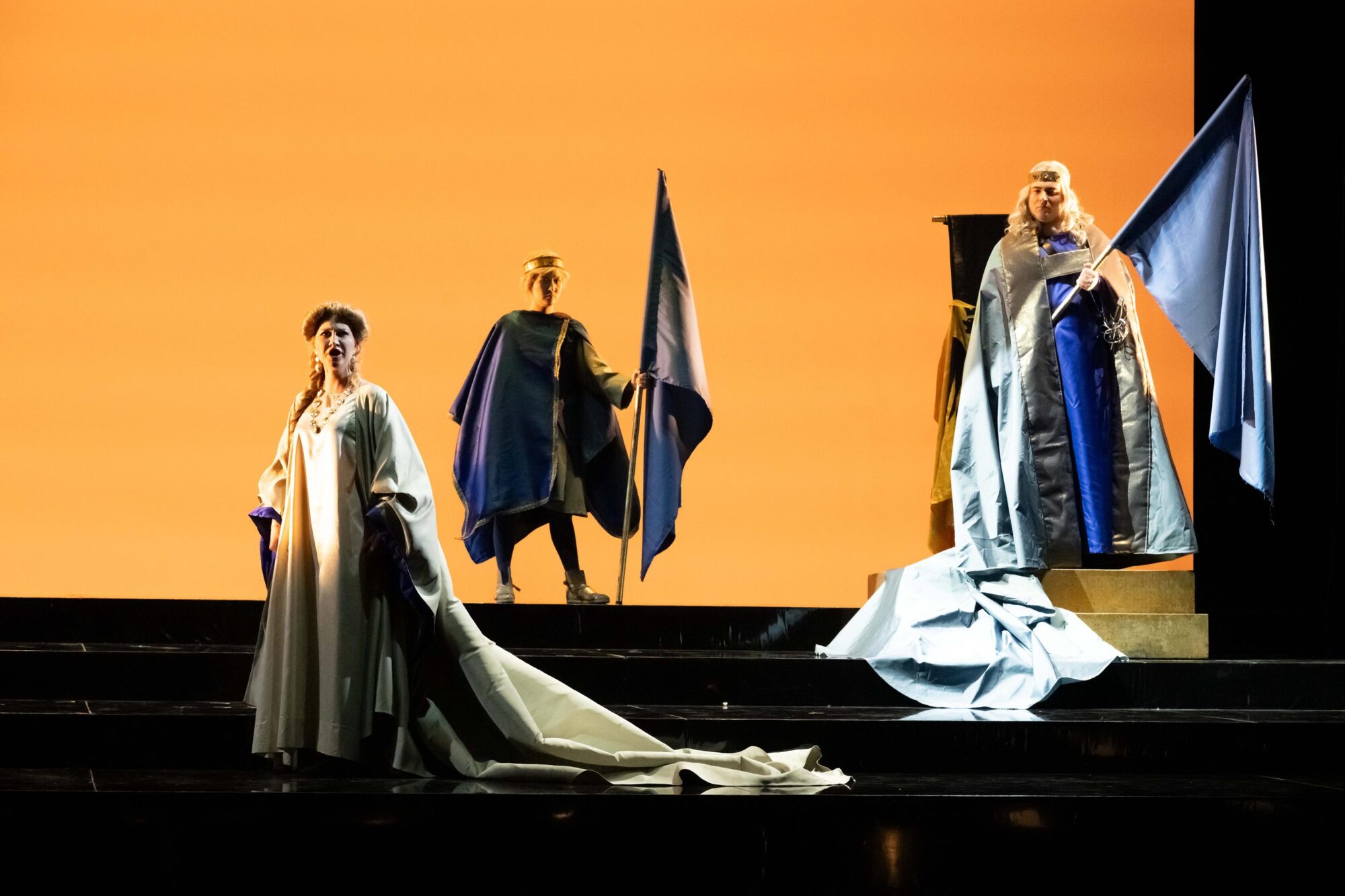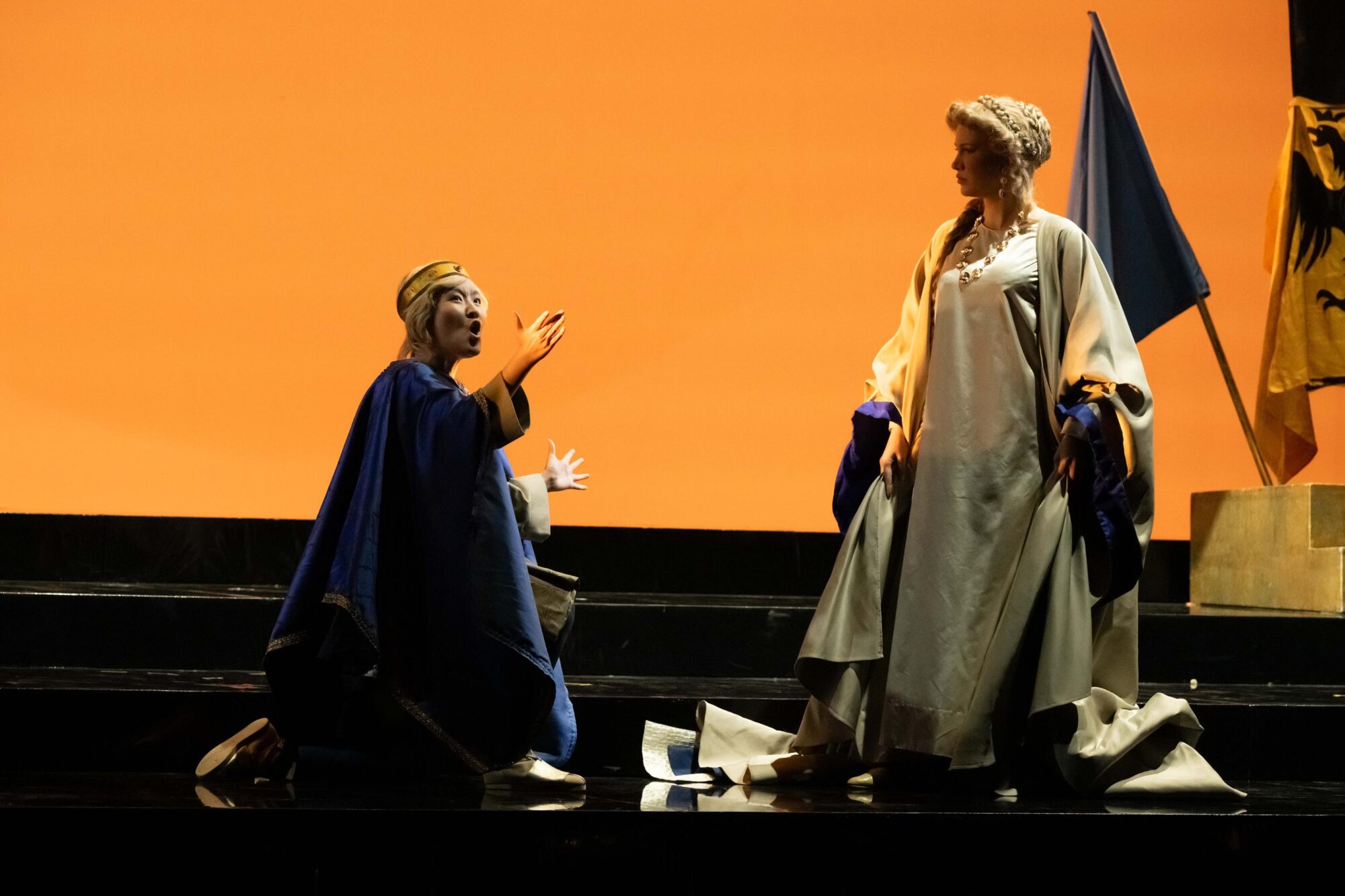 […] Die Produktion entstand als mit der Neu-Edition des Werks verbundenes Aufführungsprojekt des Conservatorio Benedetto Marcello in Venedig mit einem sichtbar größtenteils aus Hochschulkräften gespeisten jungen Ensemble sowohl im “Orchestra Sartorio” als auch auf der Bühne. Neben dem von Fasolis und seinen Spezialisten blendend umgesetzten Fach des bunten Generalbass-Spiels beeindruckte auch die allgemeine Spielfreude bis hin zu den nur wenig, nämlich bevorzugt bei königlichen Verkündigungungen genutzten drei (historischen) Blechbläsern. Beeindruckt hat mich aber vor allem die Kondition und der Ideenreichtum der beiden Cembalisten Alessandro Gonfiantini und Luca Faraci. Größere professionelle Erfahrung merkte man gerade den vier Hauptrollen an. Anastasiia Petrova in der Titelrolle verfügte über genügend angemessenes Volumen, Durchsetzungskraft und Ausstrahlung, um dem häufigen, metaphernreichen Hadern der Figur mit ihrem Schicksal genug königliche Würde und Sympathie zu verleihen. Gloria Ferro als charmantere Konkurrentin Gissilda kontrastierte hervorragend mit ihrer leichteren, gut beweglichen Stimme, mit rhythmisch überaus sicheren, mühelos wirkenden Verzierungen in ihrem vielleicht am meisten auskolorierten Part. Minyoung Park als Adalbert verfügte über nötige Klarheit und markante Führung ihrer durchaus kastratennahen Stimme, um die zwiespältige, aber immer drangvolle Figur angemessen zu charakterisieren, während Silvia Vavassori, eine spürbar schon erfahrenere Sängerin, als Otto den Sopran Petrovas in den Duettpassagen stimmig ergänzte und in ihrer Rolle gestalterisch mit sehr viel Nachdruck aufging. Countertenöre standen offenbar nicht zur Verfügung, bedauerlich aber nur im Falle des Anno von Nina Cuk, für die diese Rolle oft zu tief gelegen erschien mit Auswirkungen auf eine in Farbe und Lautstärke nicht immer zufriedenstellende Tonbildung. Giovanni Baraldi als profunder Basso-König Berengar und Luigi Tinto als dessen Handlanger Lindo überzeugten in den tieferen Lagen, und Matteo Laconi durfte dank eines Helm-Wechsels sowohl Berengar als auch Anno als bemerkenswert wohltönend-einfühlsam artikulierender Tenor-Krieger dienen. Viel zu hören und vielleicht viel zu viel zu schreiben also, doch das Wesentliche war ja, wie begeistert und mit längerem stehenden Applaus das Mönchengladbacher Publikum dieses Wundertüten-Gastspiel angenommen hat. Deshalb gebührt zum Schluss den Verantwortlichen im Theater Krefeld-Mönchengladbach das vielleicht größte Lob, den Mut zu einer Integration einer solchen Sonderveranstaltung in den Spielplan gehabt zu haben, und ein ausdrückliches “Gerne wieder”.