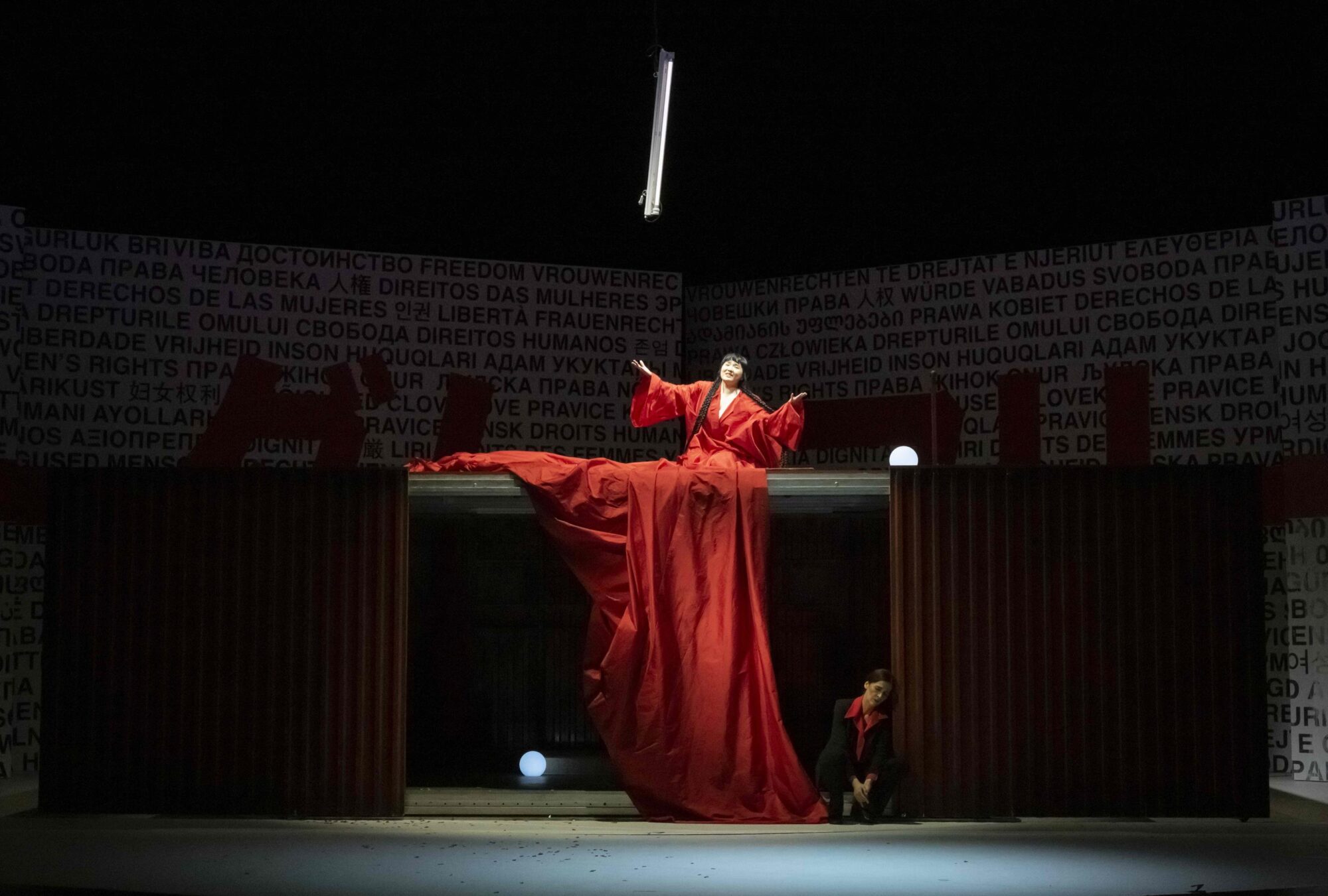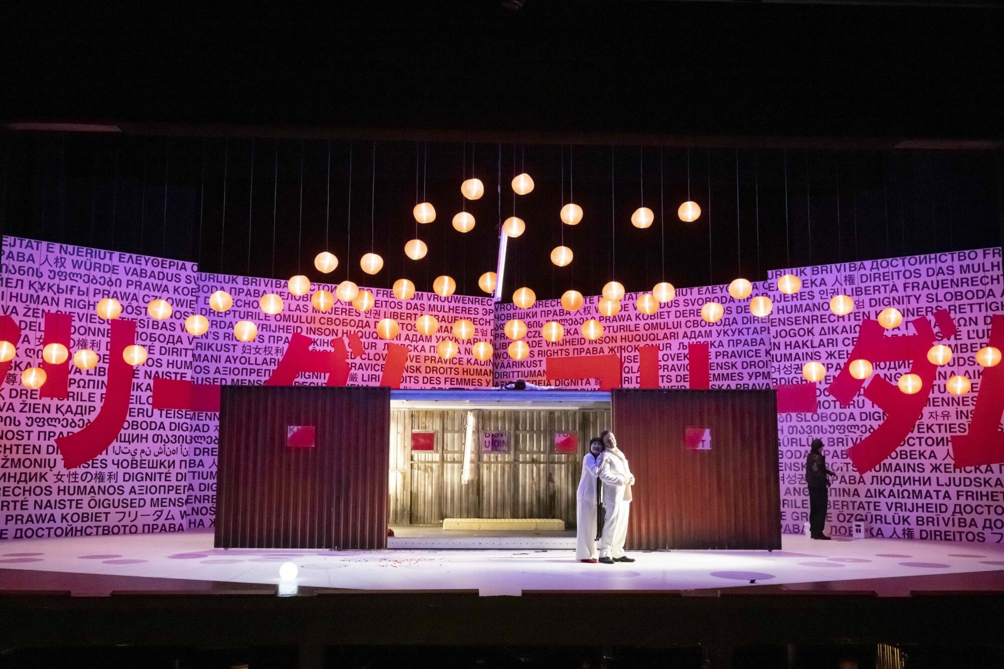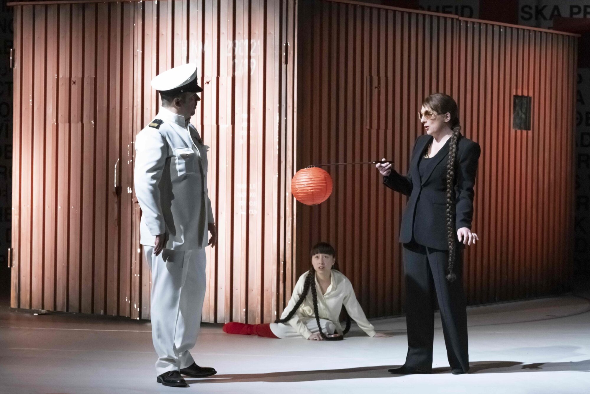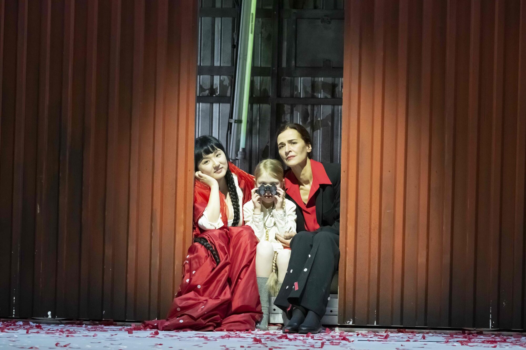 Diese traurige Geschichte über den Missbrauch einer jungen Frau nennt Komponist Giacomo Puccini eine „Japanische Tragödie in drei Akten“. Von den Schwestern Beverly und Rebecca Blankenship wird der ernste Stoff für das Theater Krefeld und Mönchengladbach mit viel Symbolkraft und einem reduzierten Bühnenbild inszeniert. Das Geisha-Haus wird zum Überseecontainer. Die missachteten Frauen- und Menschenrechte sind in vielen Sprachen an die Bühnenwand geschrieben. Sie werden während der Vorstellung zum Teil durch einen Statisten übermalt, also quasi ausgelöscht.