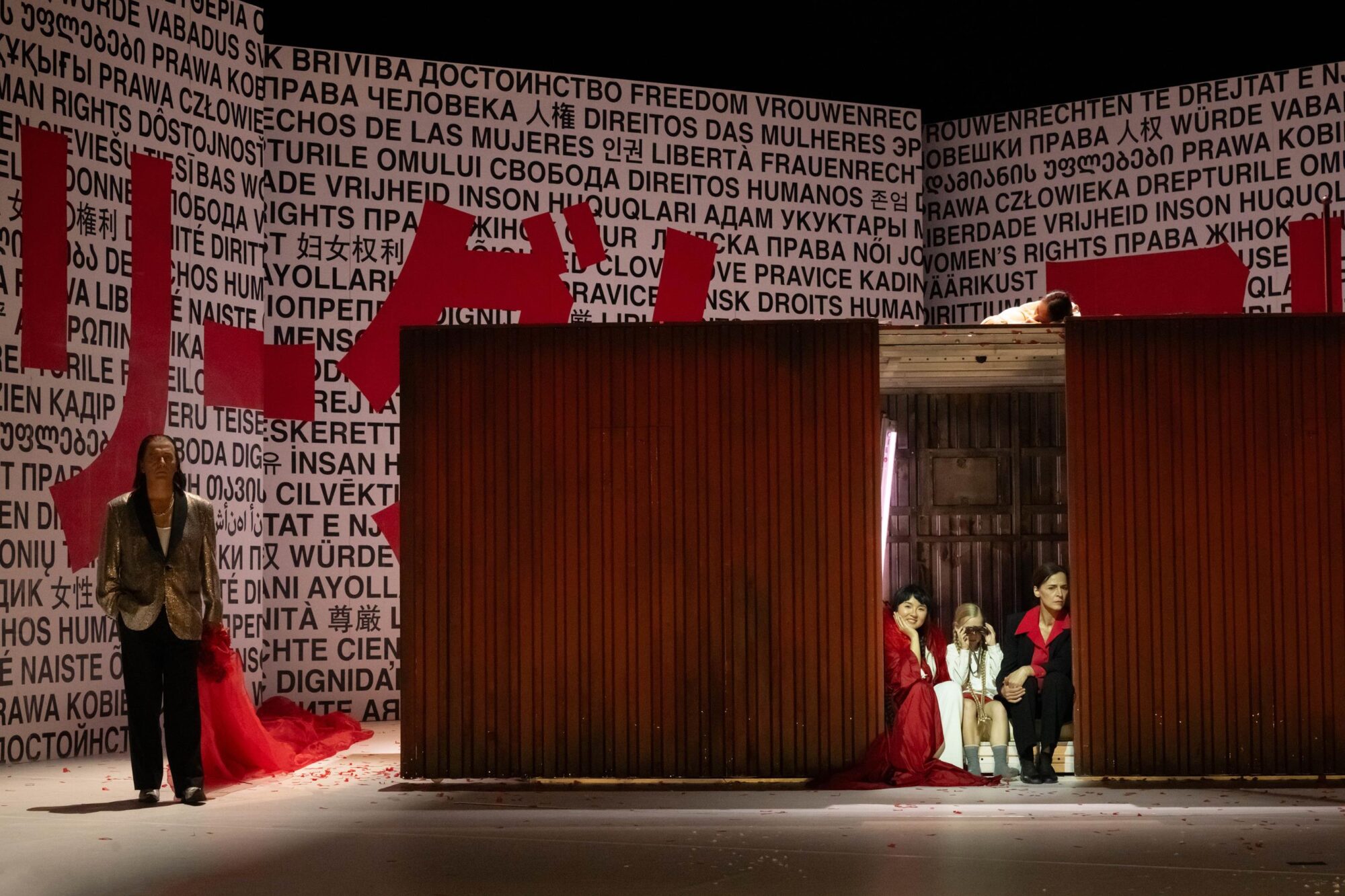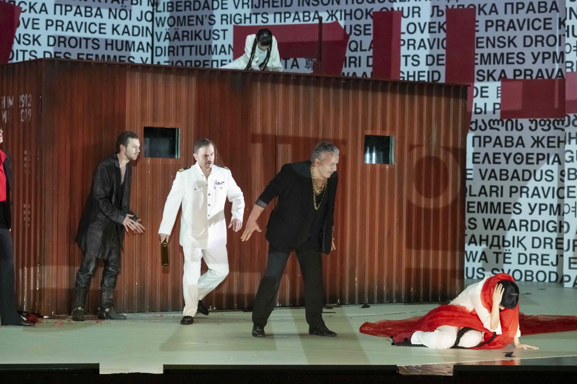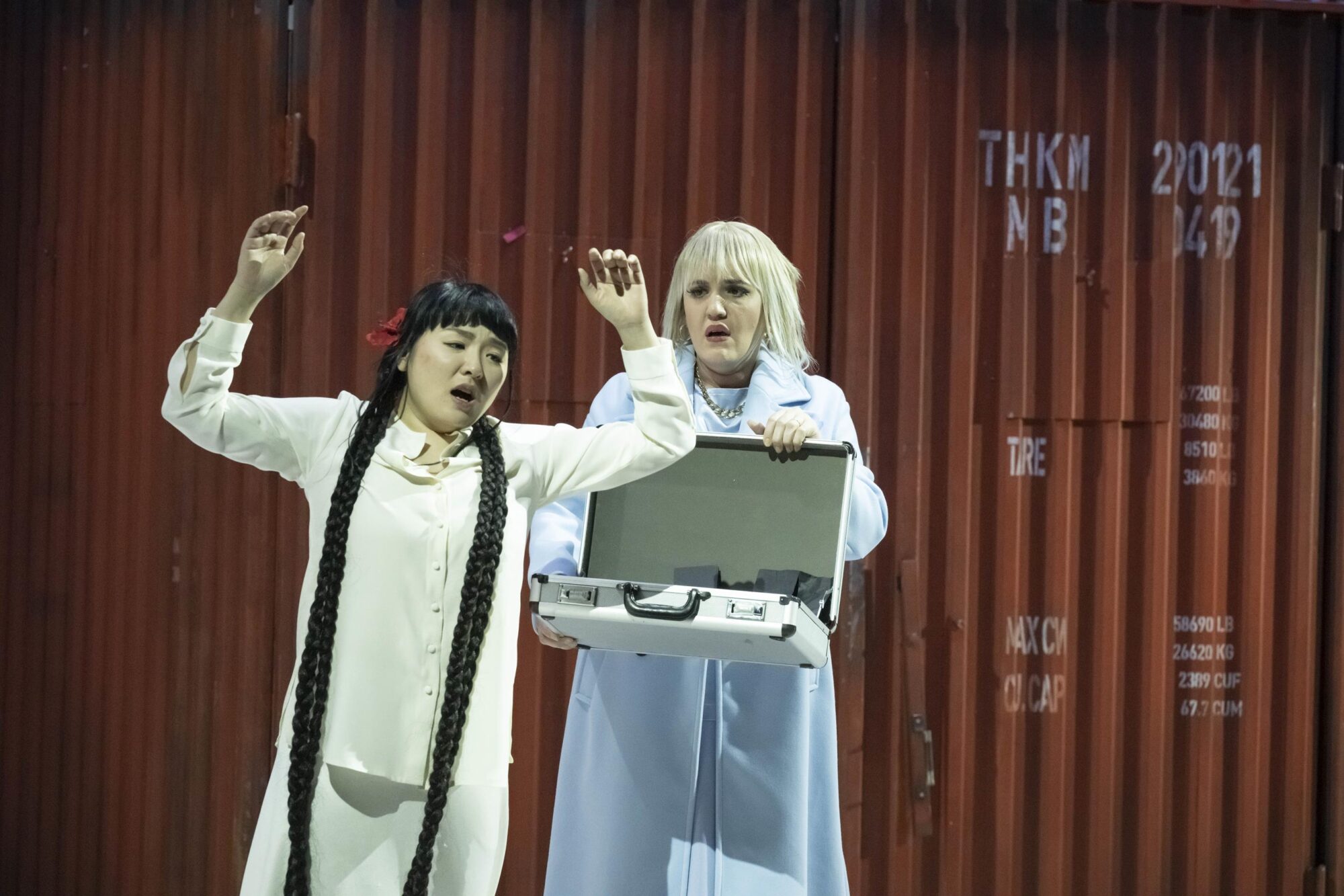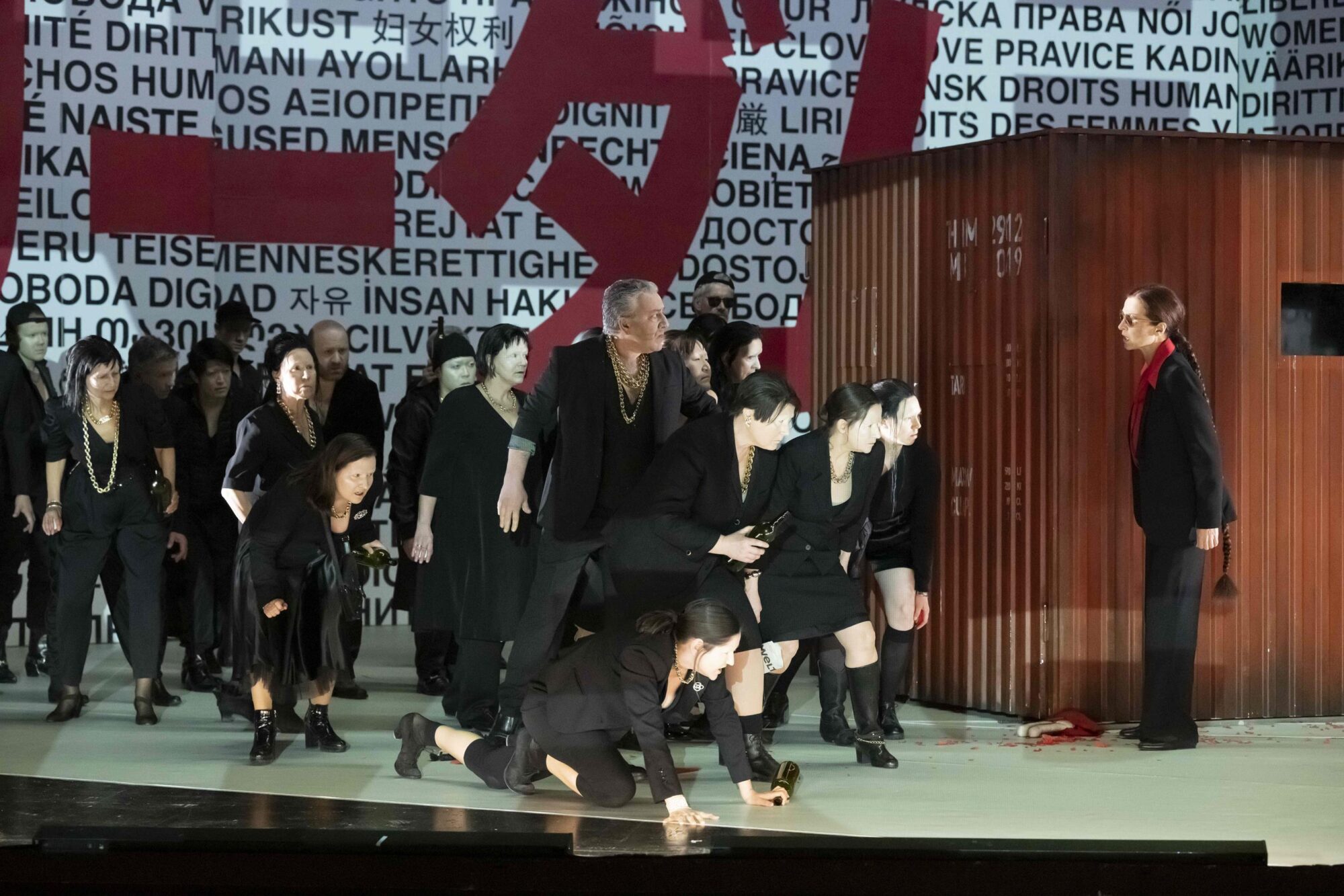 Diese traurige Geschichte über den Missbrauch einer jungen Frau nennt Komponist Giacomo Puccini eine „Japanische Tragödie in drei Akten“. Von den Schwestern Beverly und Rebecca Blankenship wird der ernste Stoff für das Theater Krefeld und Mönchengladbach mit viel Symbolkraft und einem reduzierten Bühnenbild inszeniert. Das Geisha-Haus wird zum Überseecontainer. Die missachteten Frauen- und Menschenrechte sind in vielen Sprachen an die Bühnenwand geschrieben. Sie werden während der Vorstellung zum Teil durch einen Statisten übermalt, also quasi ausgelöscht.