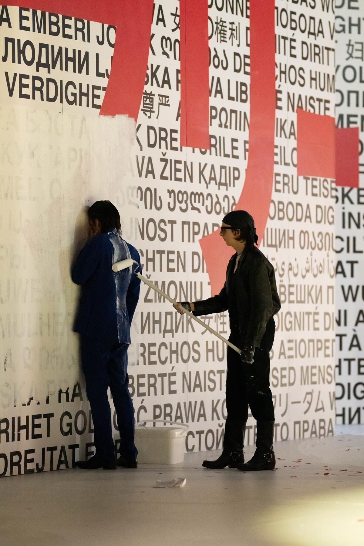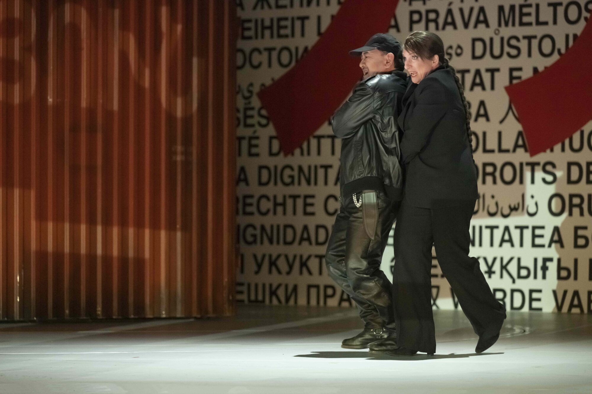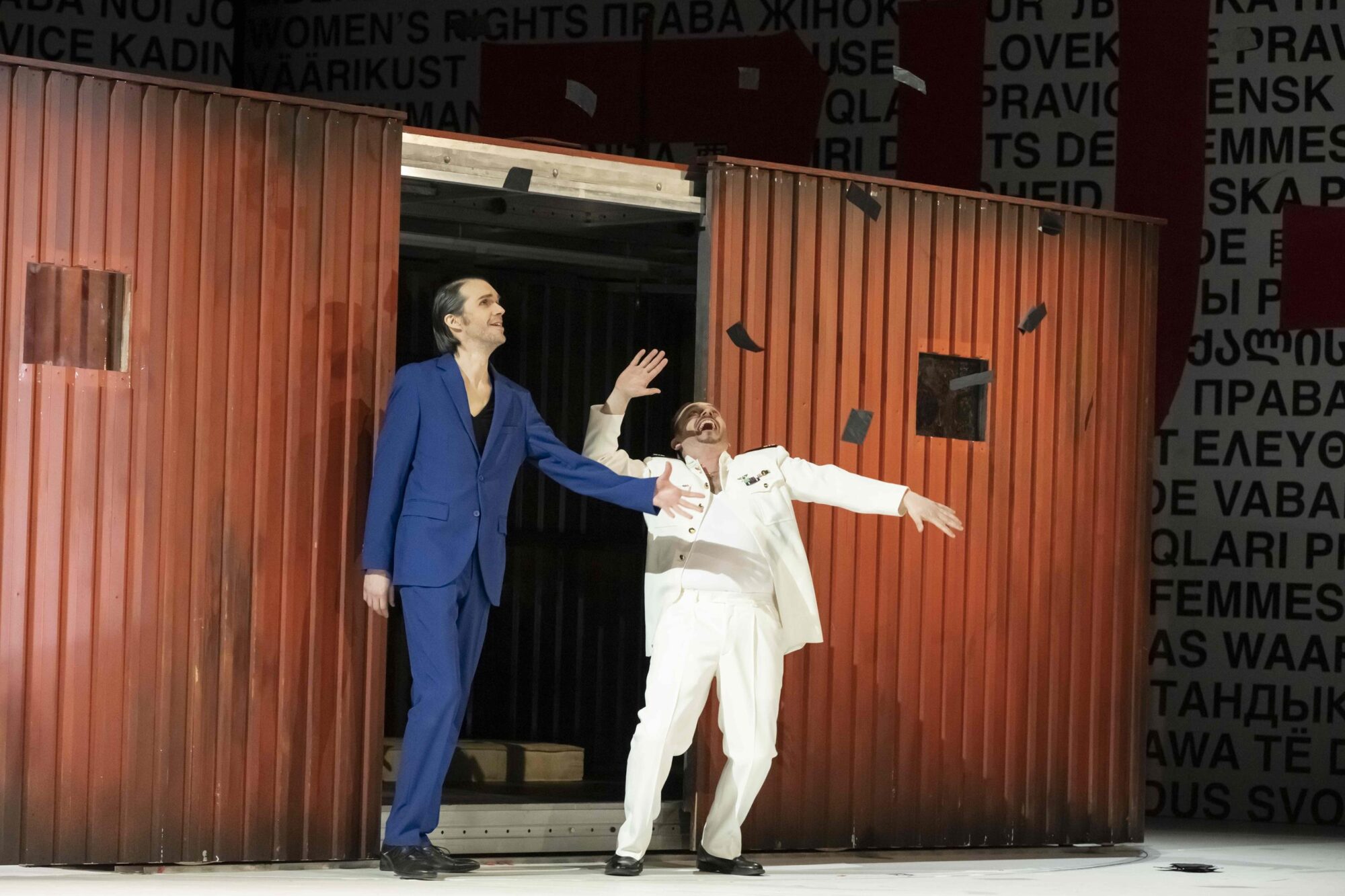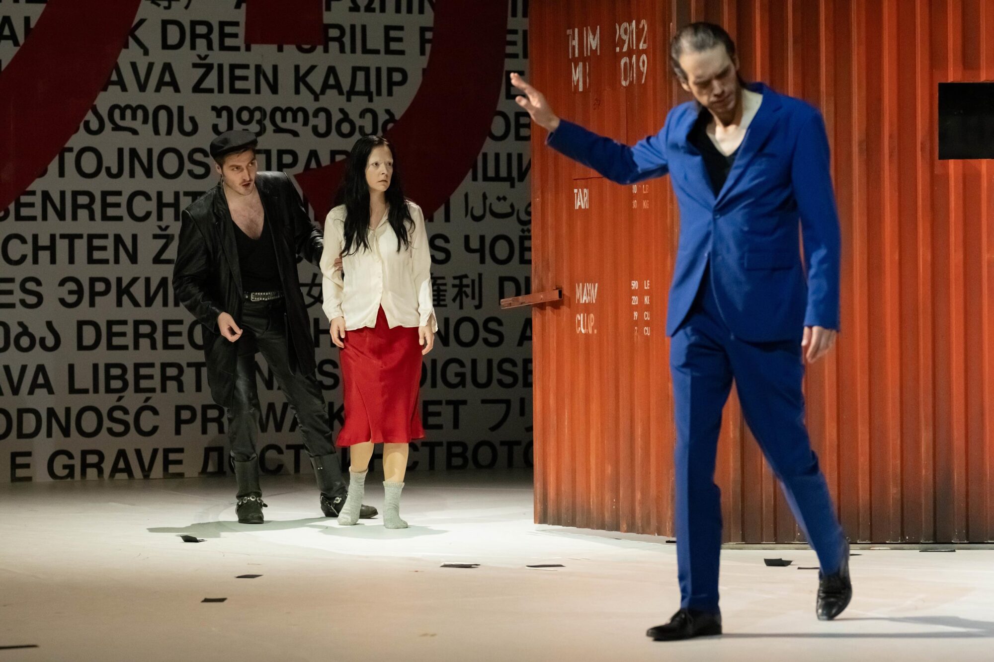 Ein riesiger, schon etwas rostiger Schiffscontainer beherrscht als einziges Requisit die Krefelder Bühne – er ist Stundenhotel, Schmugglerparadies und Rückzugsbereich mit einer Matratze. Begrenzt wird die Bühne von einer hohen Wand, auf der in zahlreichen Sprachen die Begriffe Menschenrechte, Frauenrechte, Würde und Freiheit aufgeschrieben sind.