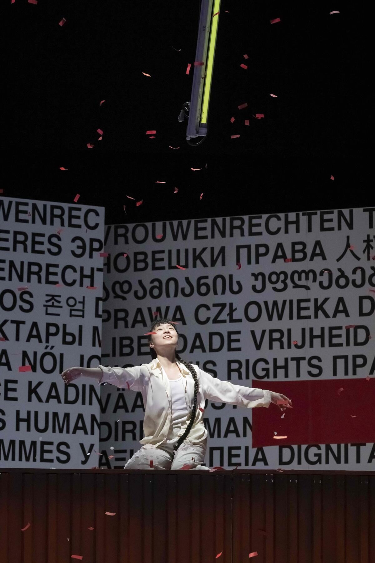 Die Regie hält die Geschichte permanent in der Schwebe zwischen einer immer wieder realistischen Erzählweise und einer deutlichen Abstraktion. Die Bühne wird begrenzt durch Wände, auf denen in diversen Sprachen die Begriffe “Frauenrechte”, “Menschenrechte”, “Würde” und “Freiheit” zu lesen sind; darübergemalt sind die japanischen Schriftzeichen für das Wort “Freiheit”. Das individuelle Schicksal der 15-jährigen Cho-Cho-San wird somit überhöht in eine allgemeine Anklage bestehenden Unrechts. Dass die Auswahl der im Bühnenbild verwendeten Sprachen laut Programmheft die 34 verschiedenen Muttersprachen der Mitarbeiterinnen und Mitarbeiter am den Vereinigten Bühnen Krefeld-Mönchengladbach abbildet, ist mehr als eine nette Geste. Hier positioniert sich ein Theater und definiert sich über eine politische Inszenierung, die aber immer auch sinnlich und emotional erlebbar ist.