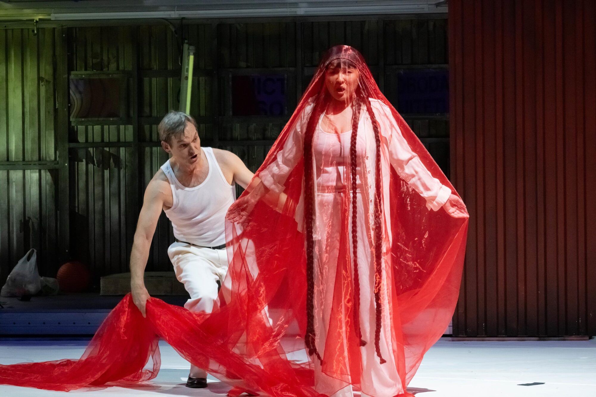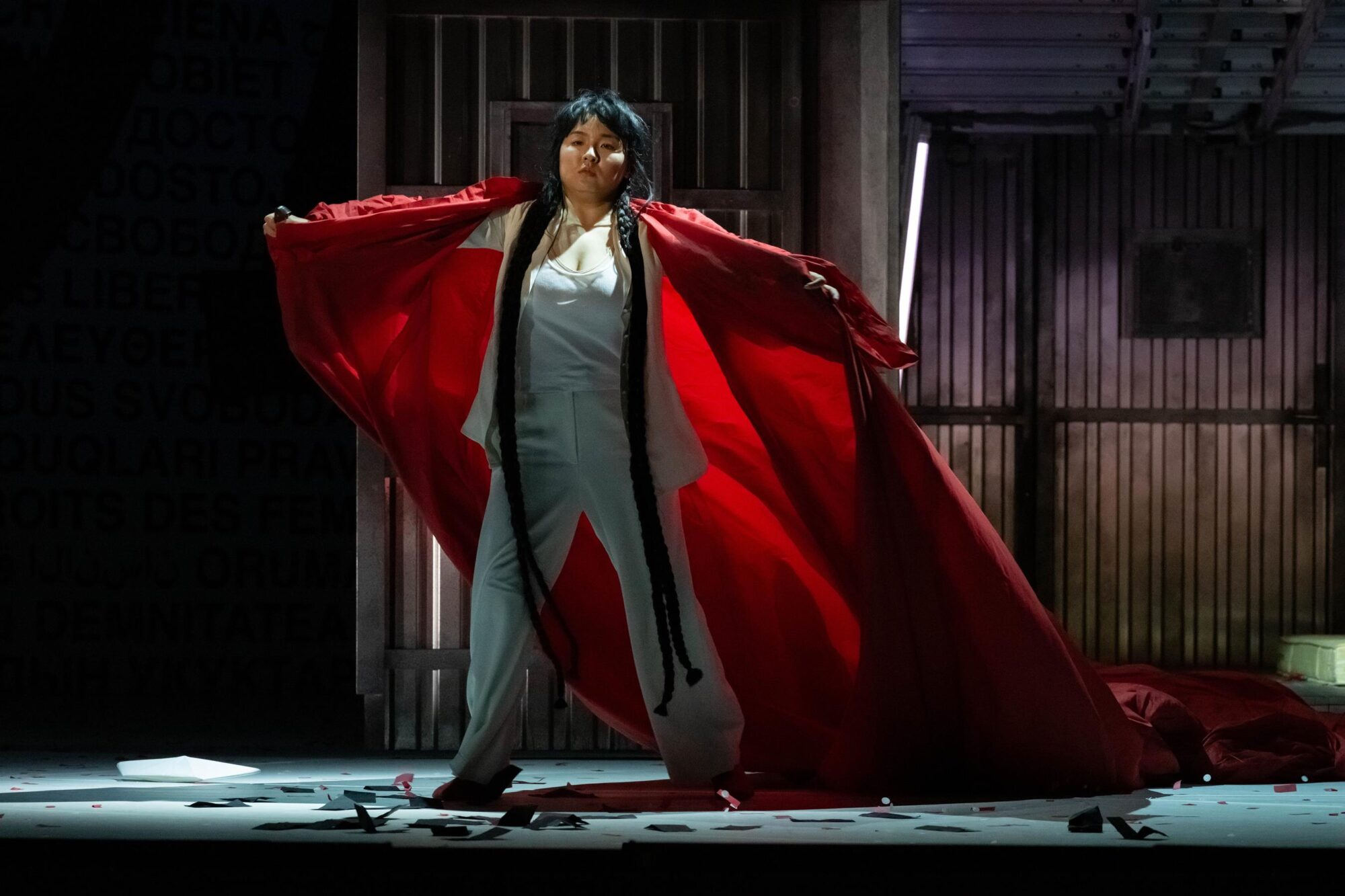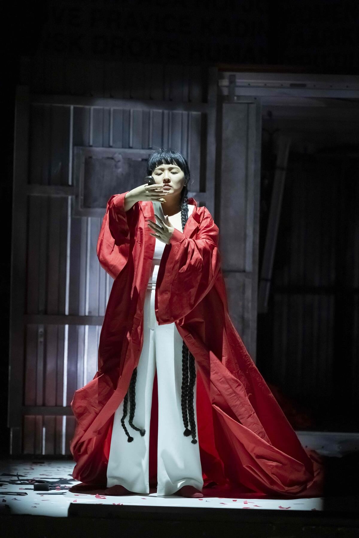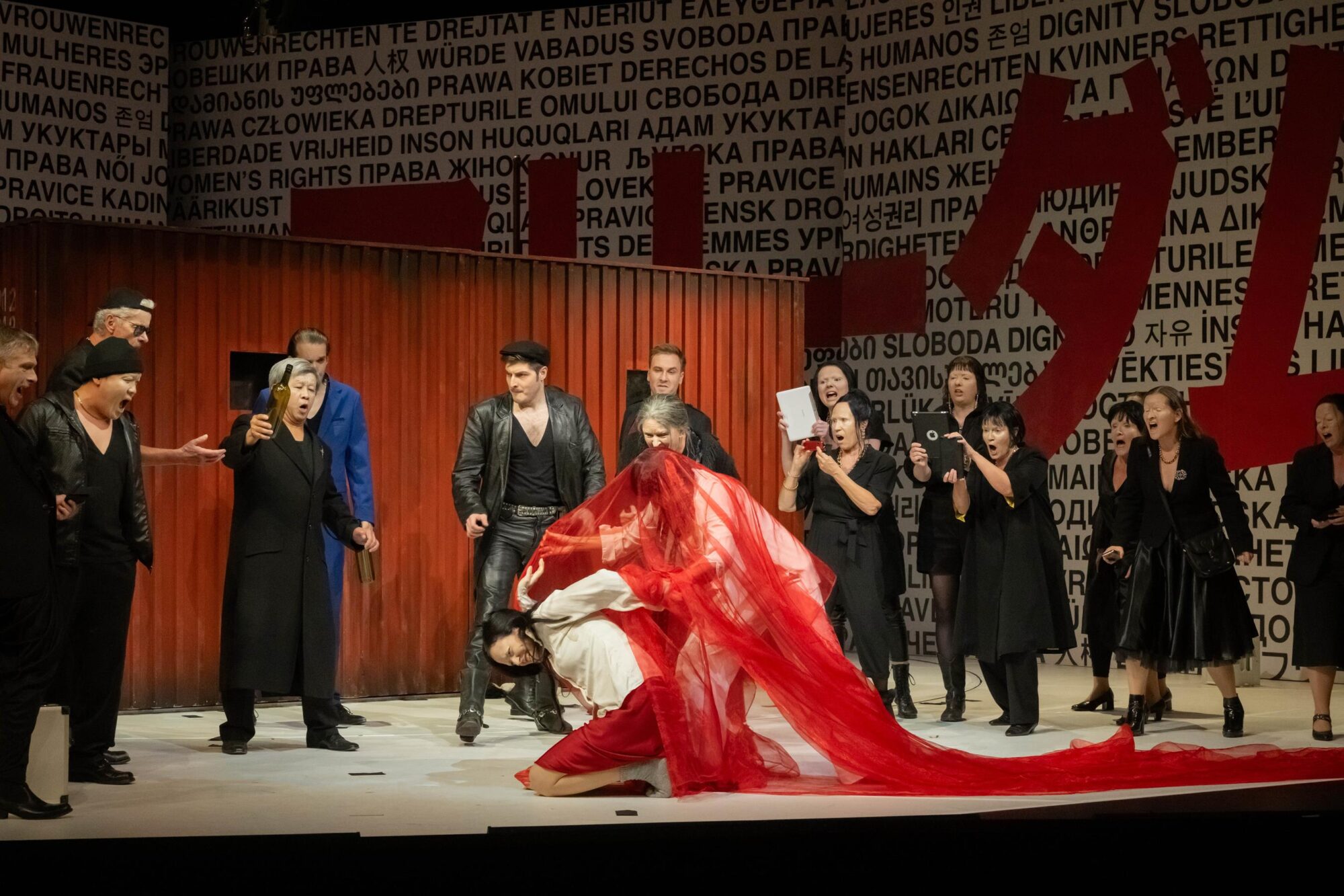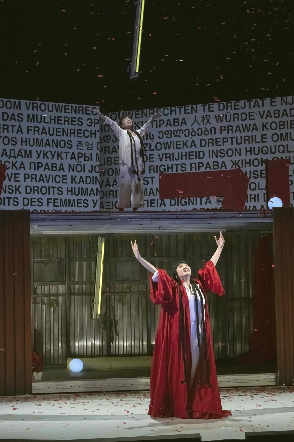 In dieser brutalen und nüchternen Welt bleibt immer noch Platz für Gefühle und Poesie. Dass das Regieteam auch dem Raum gibt und eine Balance dafür findet, ist eine bemerkenswerte Leistung. So schweben beim wunderschönen Liebesduett am Ende des ersten Akts viele rote Lampions herab und tauchen die Szene in ein zauberhaftes Licht. Bei der Hochzeit wird Cho-Cho-San in einen meterlangen roten Schleier gehüllt, der mit seiner Transparenz auch an ein Netz erinnert, in dem sie wie ein Schmetterling gefangen ist. Später liegt sie in einen prächtigen roten Mantel gehüllt oben auf dem Dach ihrer Behausung und wartet auf die Rückkehr des treulosen Geliebten.