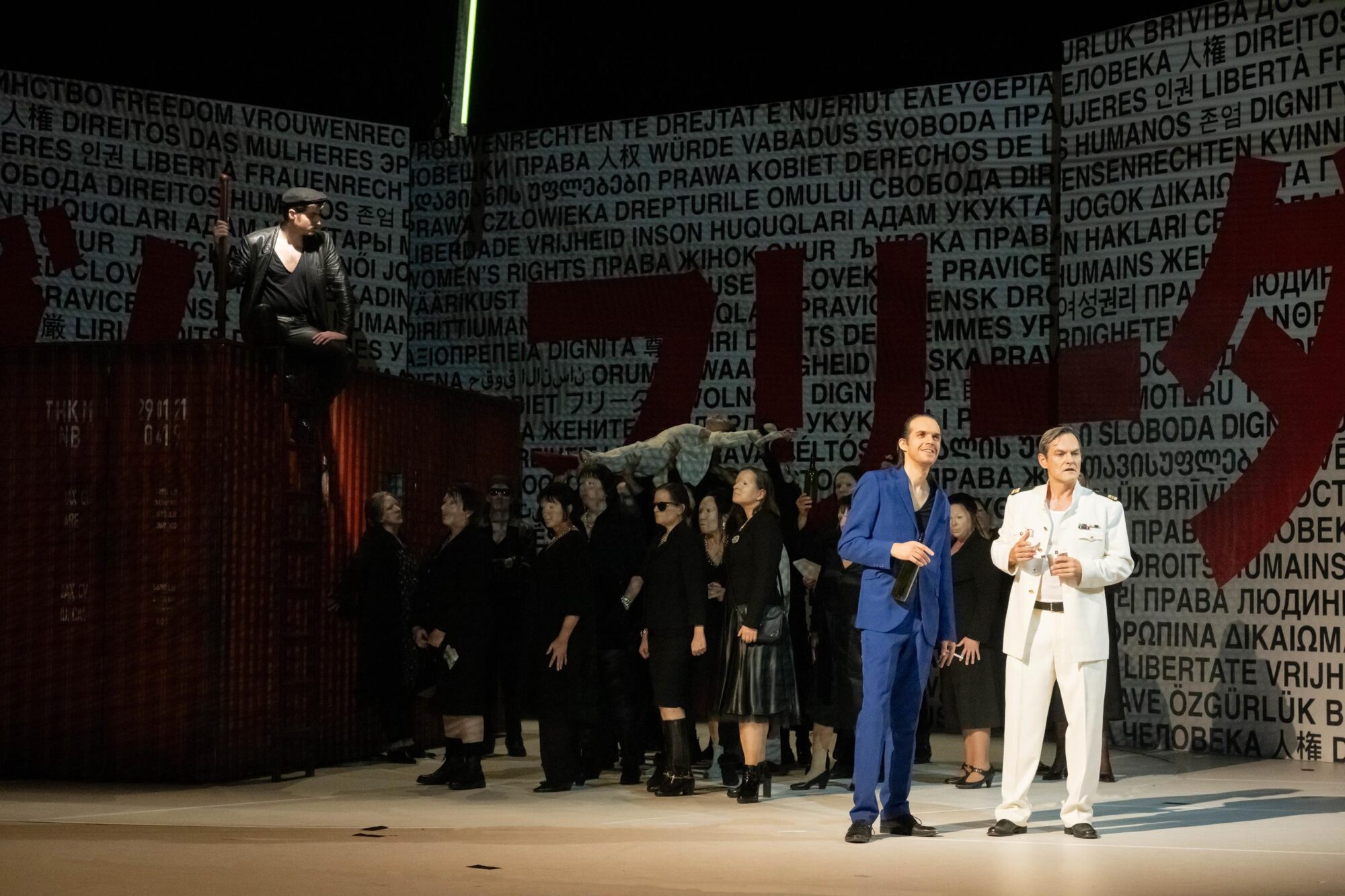 Durch die Ausstatterin Kirsten Dephoff werden im Hintergrund mehrere Wände mit den Worten „Menschenrechte“, „Frauenrechte“, „Würde“ und „Freiheit“ in den verschiedensten Sprachen gezeigt, über denen in großen, roten, japanischen Schriftzeichen zwei Mal das Wort „Freiheit“ geschrieben steht. Hinzu kommt als zentrales Bühnenelement ein großer Übersee-Container, der symbolisch einerseits für den verabscheuungswürdigen Menschenhandel steht und gleichzeitig als billige Wohnunterkunft der Cho-Cho-San dient. Viel mehr bedarf es für den optischen Aspekt auch nicht. Passend auch, dass man die stimmungsvollen japanischen Lampions lediglich als Pinkertons Inszenierung einer stimmungsvollen Hochzeitsnacht deutet, indem sie auf sein Fingerschnippen von der Decke herabfahren.
