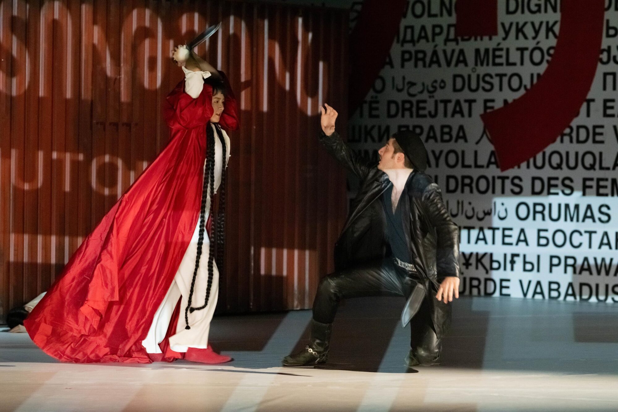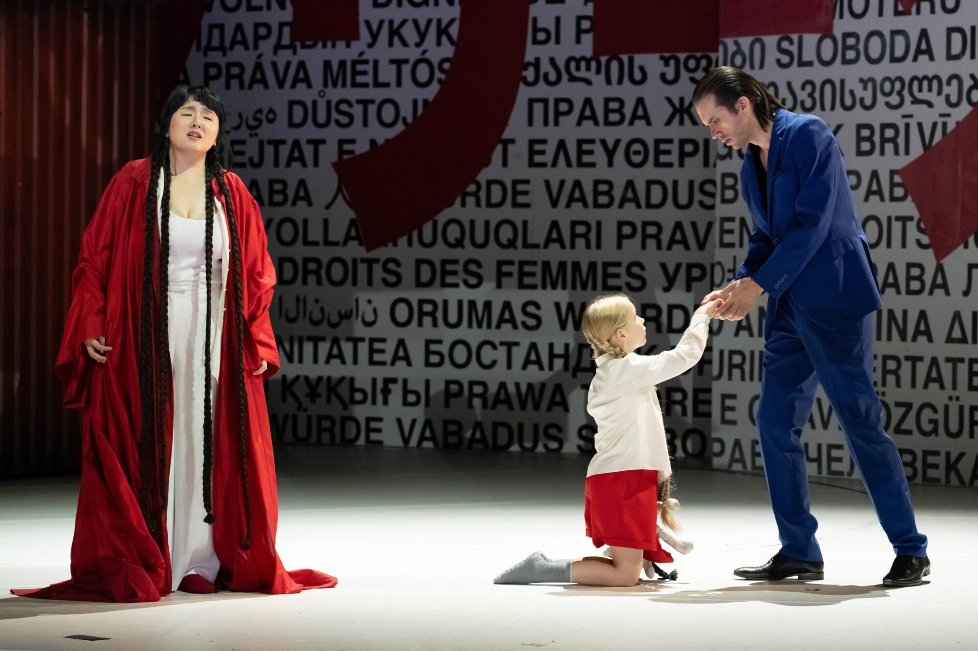 In großen roten japanischen Schriftzeichen steht über allen Begriffen das Wort „Freiheit“. Damit hat die Bühnenbildnerin Kirsten Dephoff, die auch die Kostüme entwarf, auf gut nachvollziehbare Weise den Raum für die bedrückende, auf einer wahren Geschichte beruhende Tragödie der Geisha Cho-Cho San geschaffen. Die 15-Jährige wird von ihrer geldgierigen Verwandtschaft an den in Nagasaki stationierten amerikanischen Militärleutnant Pinkerton verkauft. Dieser heiratet um des seriösen Scheins willen den an die wahre Liebe glaubenden, sogar seine Religion ändernden „Schmetterling“, reist nach Amerika und kommt nach Jahren mit seiner „richtigen“ Frau zurück. Er nimmt sich das Recht, das inzwischen geborene Kind mitzunehmen, und Cho-Cho San sieht nur den Freitod als Ausweg. Durch die recht realistische Darstellung auf der Bühne soll dem Publikum die oft kaschierte Frauenfeindlichkeit, die es in allen Lebensbereichen und nicht nur in Japan gibt, nachdrücklich vor Augen geführt werden. Goro, der skrupellose Kuppler (Tenor Kairschan Scholdybajew in einer Paraderolle), der schmierige Fürst Yamadori (Markus Heinrich), der Butterfly mit seinem Reichtum locken möchte, oder der ob des „Verrats der Religion“ furchterregend polternde Onkel Bonze (Hayk Deinyan) stehen für die immer noch vorherrschende Männerdominanz. Lediglich der Pinkerton begleitende, einfühlsamere Konsul Sharpless sieht tiefer und warnt – allerdings vergeblich – den Leutnant davor, „dem Schmetterling die Flügel zu brechen.“ Bariton Rafael Bruck singt mit Ansage trotz einer vokalen Indisposition – steht aber seinen anspruchsvollen Part stimmlich und darstellerisch bewunderswert durch.