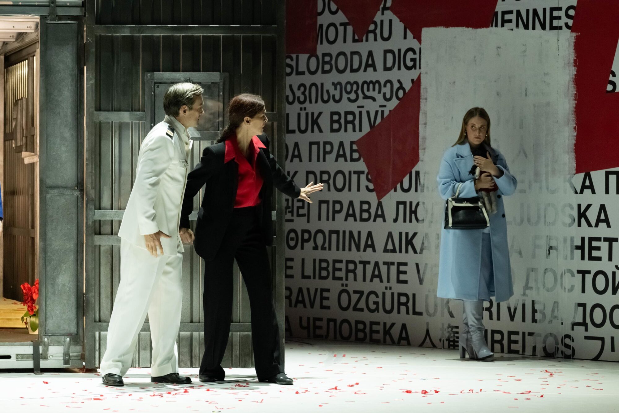 „Eine japanische Tragödie“ hat auch Puccini, der sich sehr mit dem Leid seiner Titelheldin identifizierte, sein Stück genannt. Mit dem persönlichen Schicksal der jungen Geisha Cho-Cho-San, die sich ein amerikanischer Leutnant auf Zeit nimmt, dann fallen lässt und sie damit in den Selbstmord treibt, wird nicht nur eine Liebesgeschichte mit tragischem Ausgang erzählt, es wird auch Sozialkritik geübt. […] Darüber hinaus ist es gelungen, die Geschichte aus dem historischen Kontext hinaus in die heutige Zeit zu holen. Wie wird mit Frauen- und Menschenrechten, mit Freiheit und Würde umgegangen. Diese vier Begriffe sind in verschiedenen Sprachen auf den Wänden, die den Bühnenraum einrahmen, zu lesen. Darüber breiten sich große japanische Schriftzeichen in Rot aus, die ebenfalls Freiheit bedeuten. Auf diese drei Farben Schwarz, Weiß und Rot beschränken sich Bühnenbild und Kostüme fast ausnahmslos (Ausstattung Kirsten Dephoff). Cho-Cho-Sans Verwandtschaft, die sie skrupellos an den amerikanischen Leutnant Pinkerton verkauft, erinnert in ihrem Auftreten an die Mafia. Schwarze Anzüge und massive Goldketten stehen für den entsprechend westlich orientierten Lebensstil der Unterwelt. In Rot und Weiß erscheint dagegen Butterfly, die als Einfall der Regie in vielen Szenen noch eine stumme Doppelgängerin an ihrer Seite hat. Es ist die Tänzerin Tzu-Yin Liou, die glaubhaft und sehr berührend das 15-jährige Mädchen verkörpert, das Butterfly im Stück ja erst ist. Dominantes, aber wandlungsfähiges Element auf der Bühne ist ein rötlich gefärbter Container. Er dient mal als Haus, in dem Butterfly zunächst noch mit Pinkerton und dann später alleine lebt, mal als Bordell, das der Mafia-Clan betreibt.