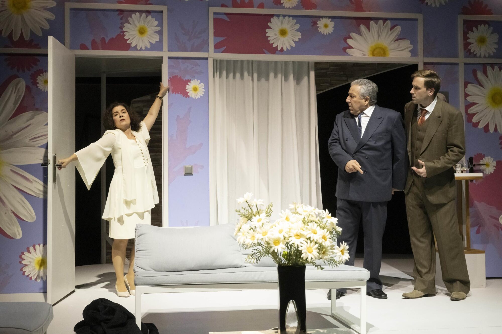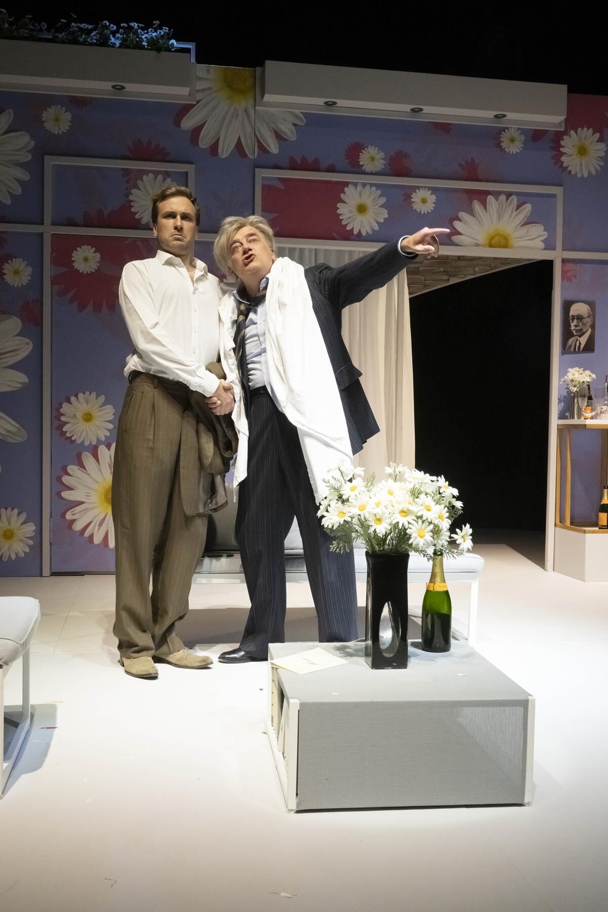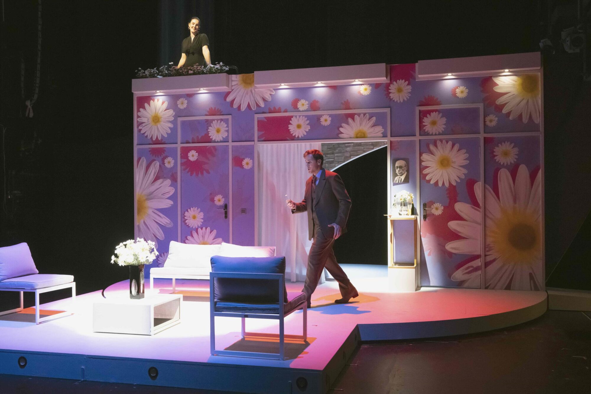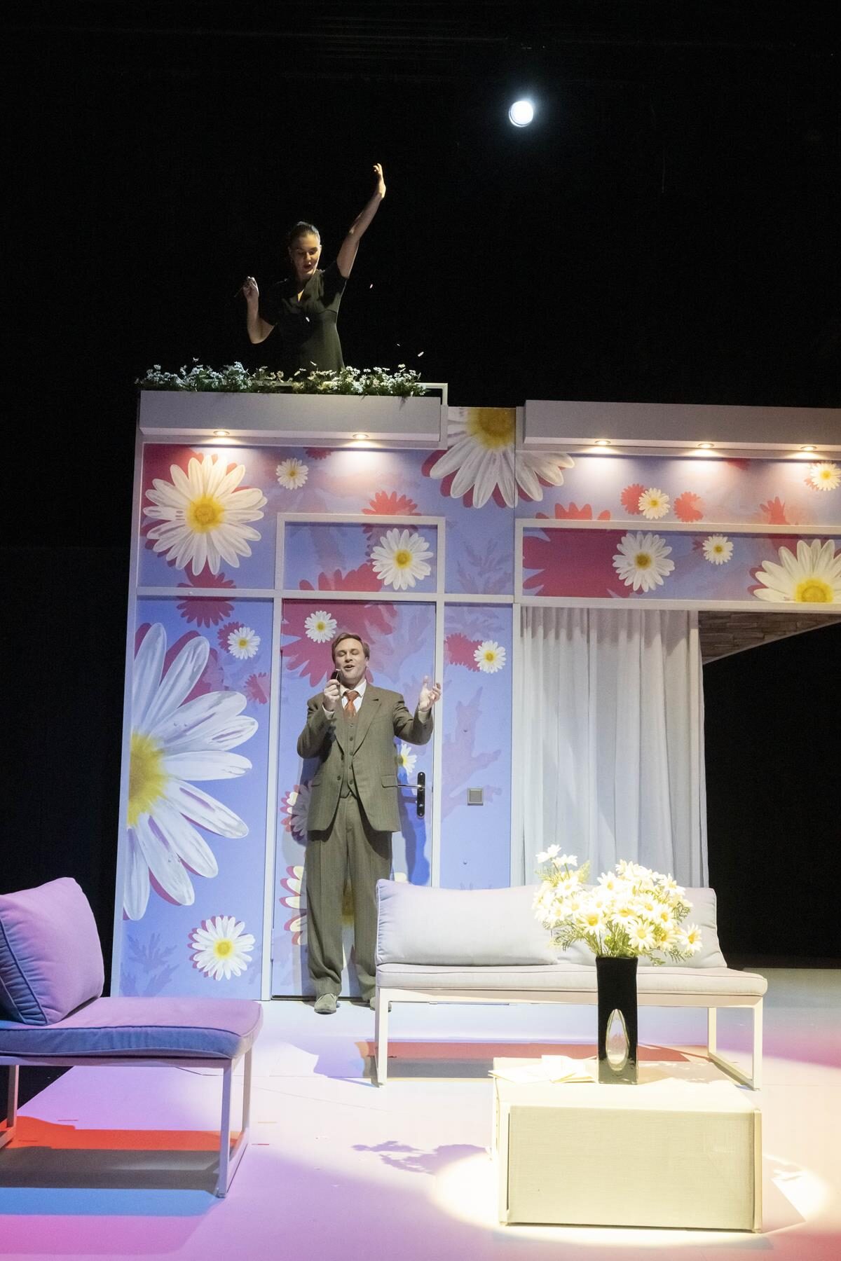 Christine Knoll sorgt mit geschmackvollen Kostümen und lichter Bühnenausstattung – zunächst im Hintergrund die Yacht Arabella, später eine Wand, übersät mit Margeriten (als Hommage an die „verwandelte“ Ehefrau), für eine sehr freundliche Optik.