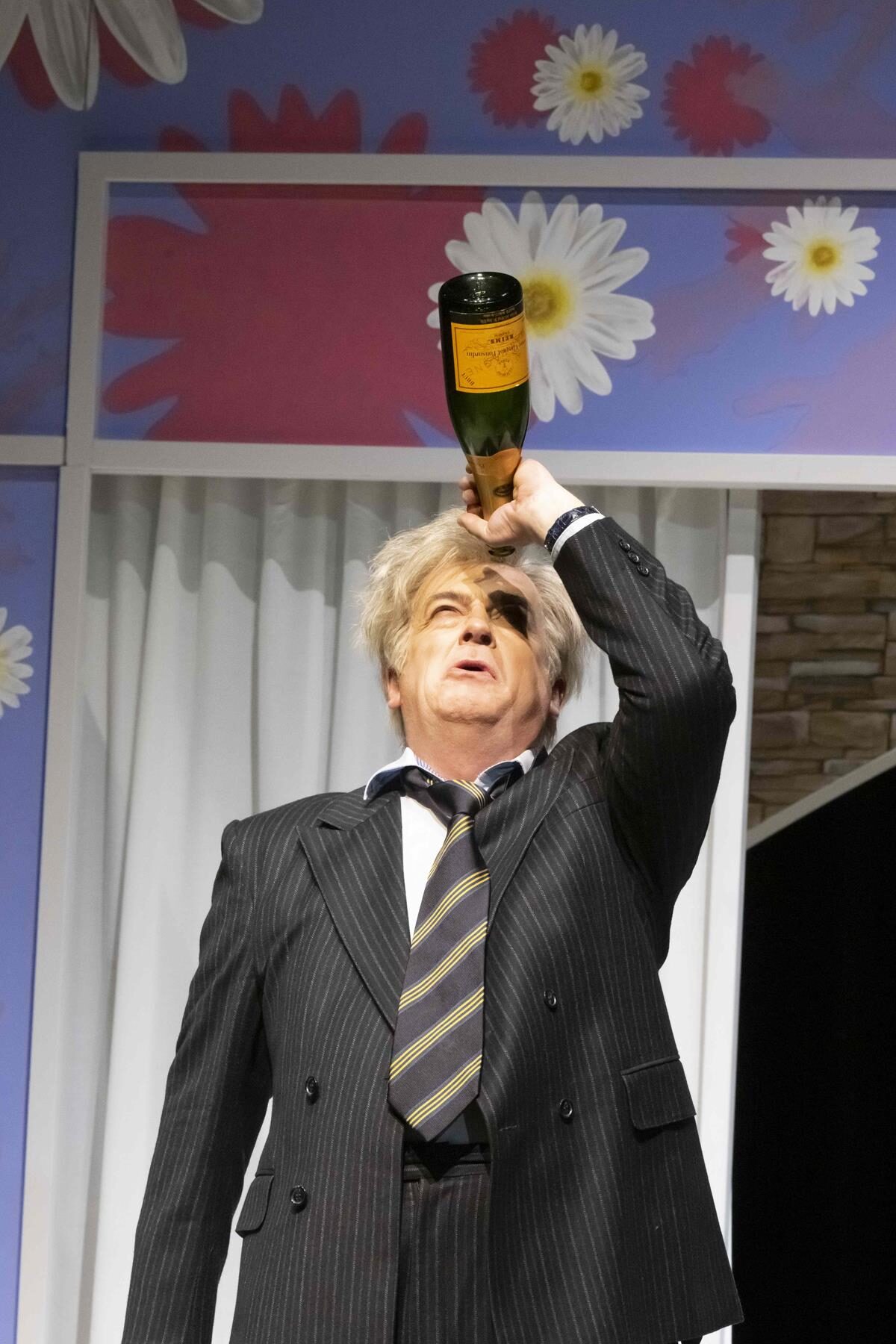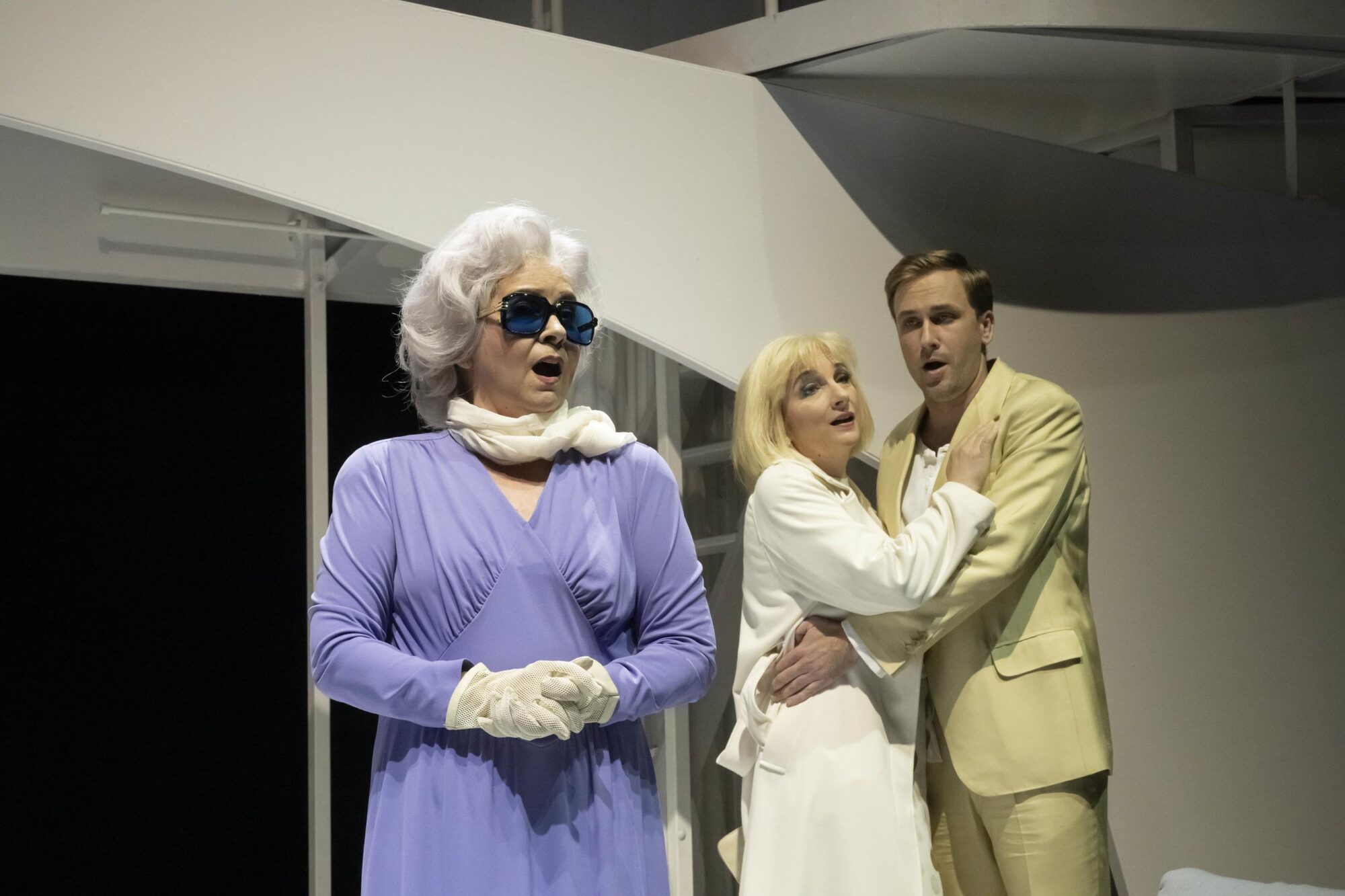 Wie Markus Heinrich die Arroganz und Überheblichkeit des millionenschweren Geschäftsmanns Stevenson verkörpert und im letzten Akt auch noch den Betrunkenen mimt, muss ihm erst einmal jemand nachmachen. Gabriela Kuhn gibt seine liebenswerte Frau Ketty mit keusch-klarem Sopran, macht sich auch, wie vom Mann verordnet, mit weißer Perücke und blauer Brille 30 Jahre älter und trifft dennoch – ohne Verkleidung – zufällig auf den französischen Charmeur Robert, der sich gleich in sie verliebt. Umwerfend attraktiv gibt Miha Brkinjač diesen Strahlemann.