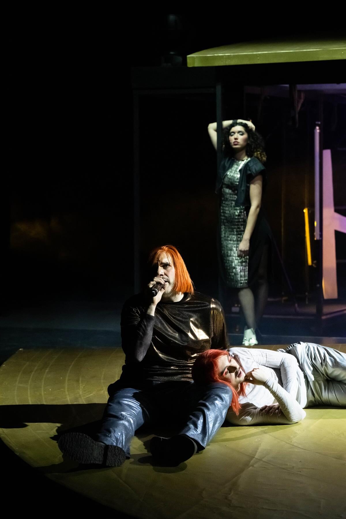 “Hier treffen deutscher Schlager und Hardrock fetzig und gnadenlos aufeinander. Oliver Kostecka hat für diesen furiosen Tanz auf dem Vulkan ein mehrstufiges Bühnenbild geschaffen, das raffiniert mit Raumebenen spielt und auch noch Platz lässt für die Live-Band um den musikalischen Leiter Jörg Wockenfuß am Keyboard. […] Das Theaterensemble agiert in Christoph Roos‘ Inszenierung temporeich, energiegeladen, gerne auch einmal bis an den Rand des Aberwitzigen. Dabei zeigen die Schauspieler ihre musikalischen Qualitäten, peppen ihre Auftritte nach Ralph Freys Choreografie mitreißend auf. Adrian Linke mimt temperamentvoll im Showgestus und Abfeuern deutscher Schlager das Streben und Sehnen des Komponisten Kugel. Der lässt sich ein mit Mephisto, der in diesem Stück der personifizierte Iggy Pop ist, einst gefeierter „Godfather des Punkrock“. Das Quartett Paul Steinbach, Lorenz Grabow, Bruno Winzen und Marie Eick-Kerssenbrock mimt ABBA, den Chor der Engel und die vierfache Katja Ebstein, mehrfache Siegerin des zweiten und dritten Platzes beim Song Contest. Die vier sind stimmlich und choreographisch gut drauf. Iggy Pop nimmt die komplette, bestens aufgelegte Belegschaft mit auf eine Reise zu den legendären Clubs des Punkrock in New York, London und Düsseldorf.