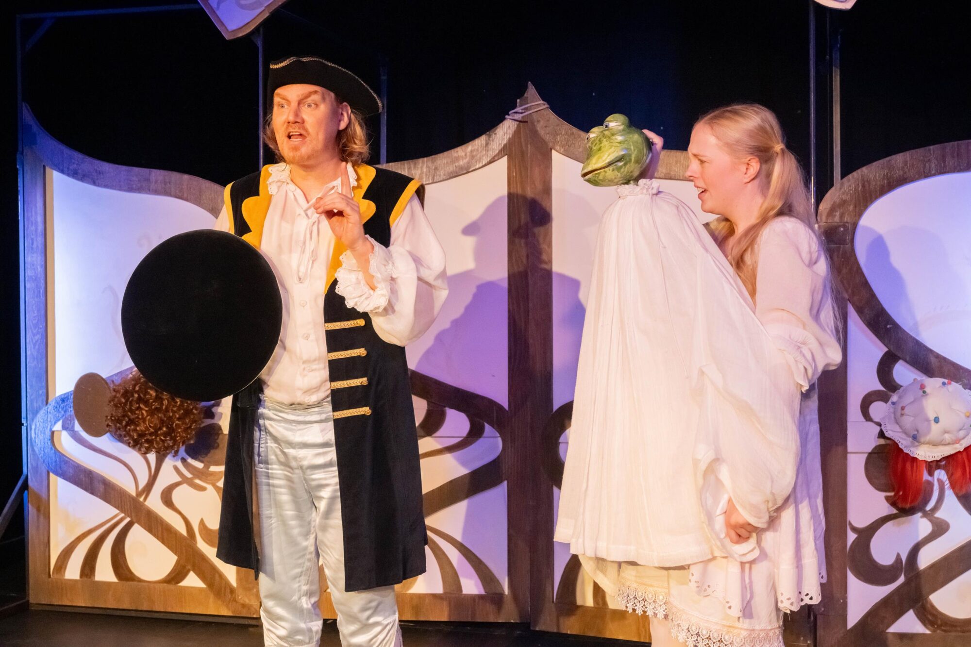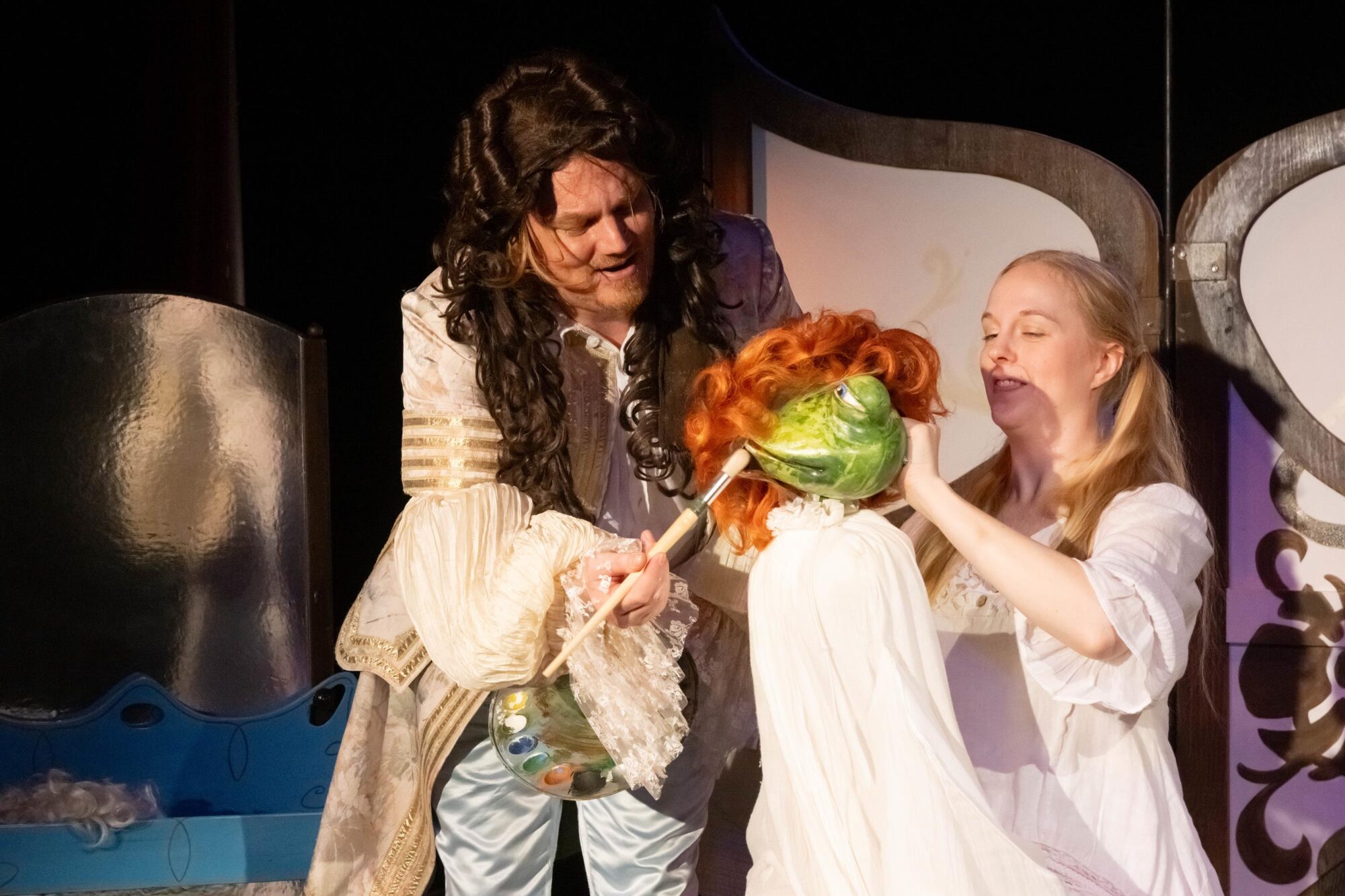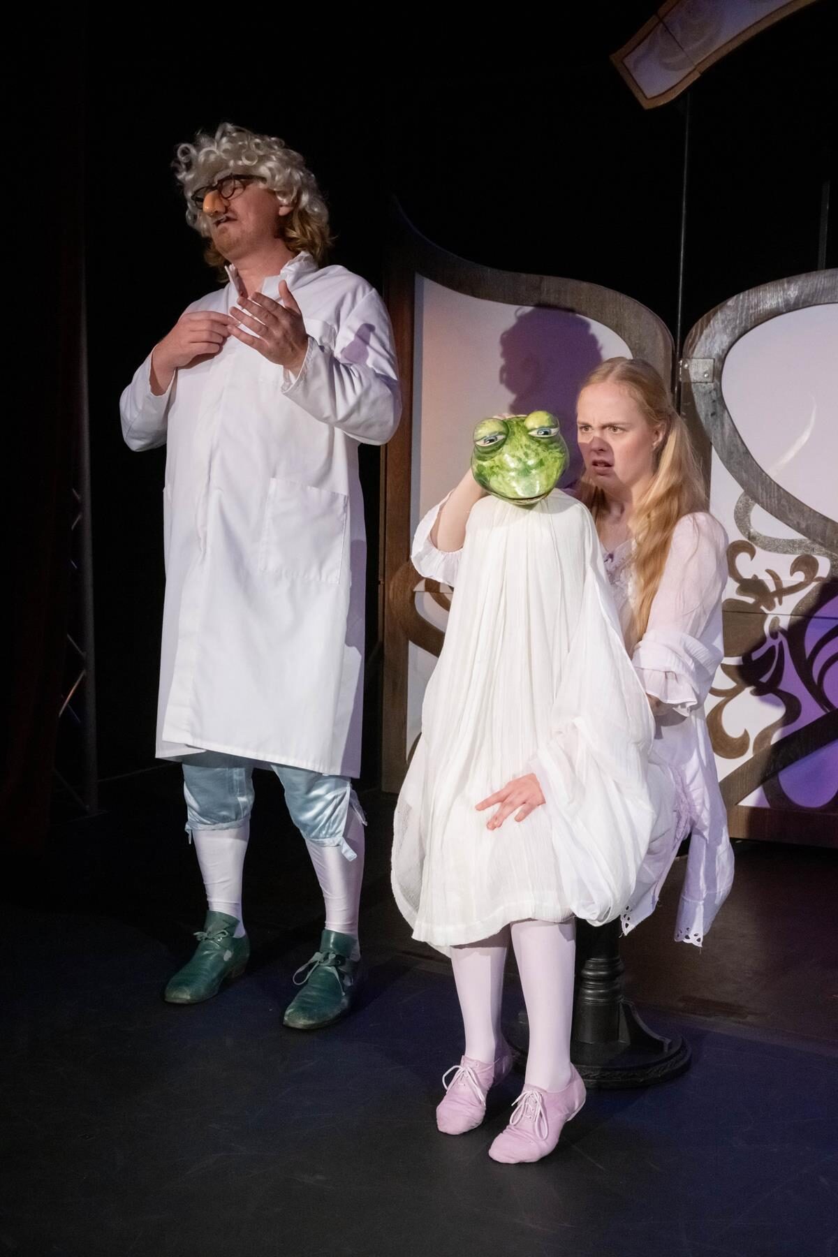 Das will der König nicht länger dulden! Er befiehlt seiner Tochter, an der frischen Luft spazieren zu gehen – und vor Schreck gehorcht die Prinzessin. Als sie am Froschteich die vielen grünen Frösche sieht, hat sie eine Idee: Aus der Froschhaut ließe sich bestimmt ein grünes Hütchen machen. Sogleich schickt sie den Reitknecht aus, um Frösche zu fangen – doch der Froschkönig zaubert der Prinzessin zur Strafe einen Froschkopf.