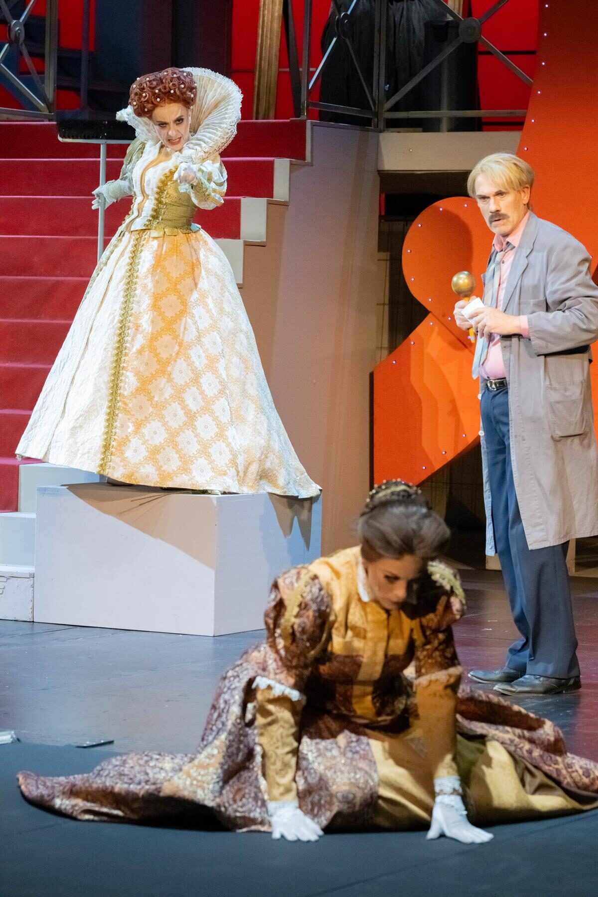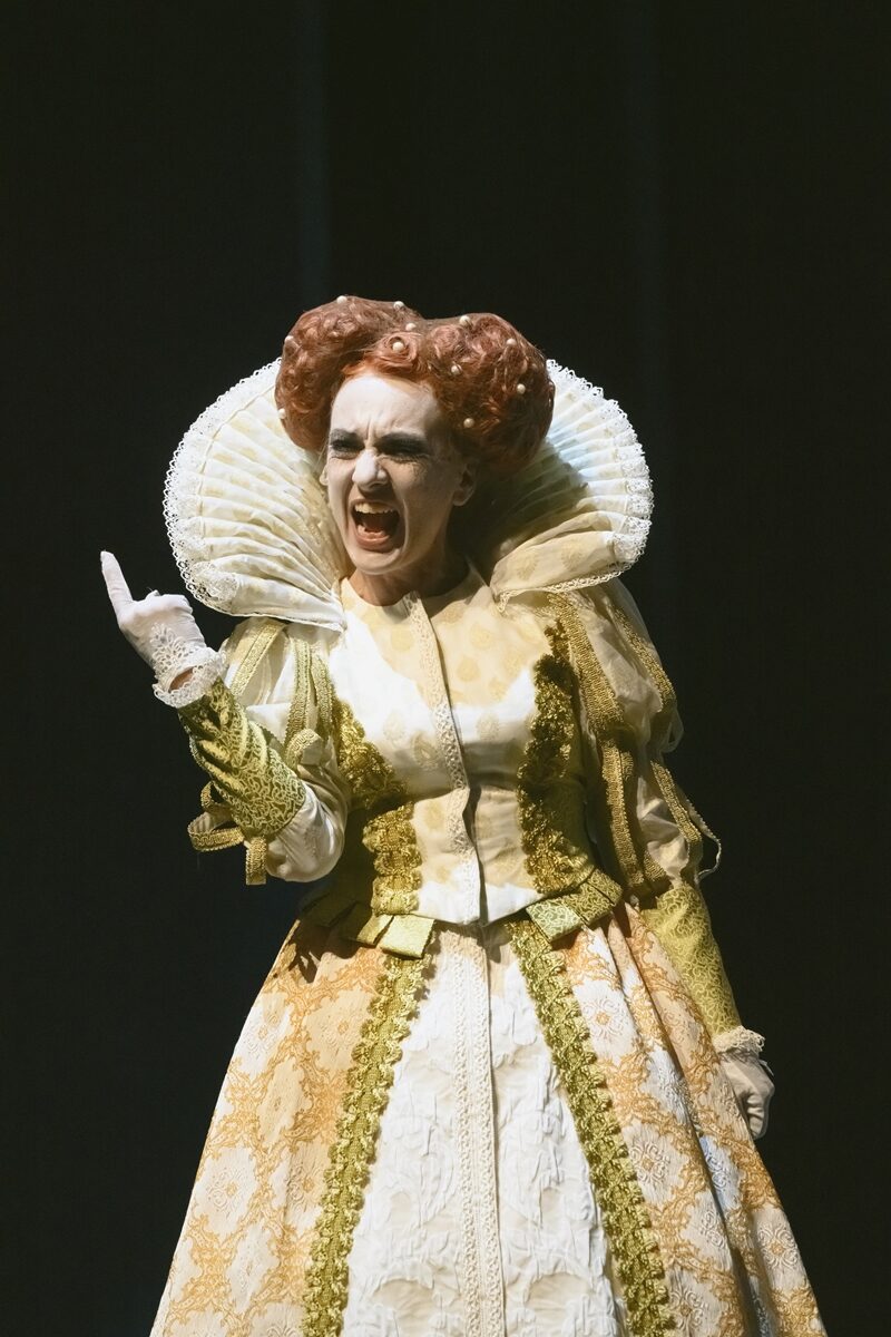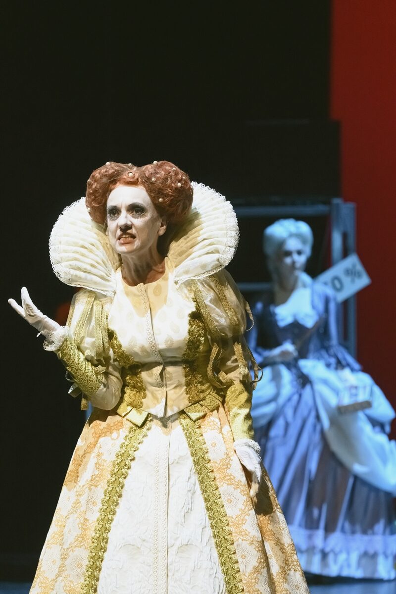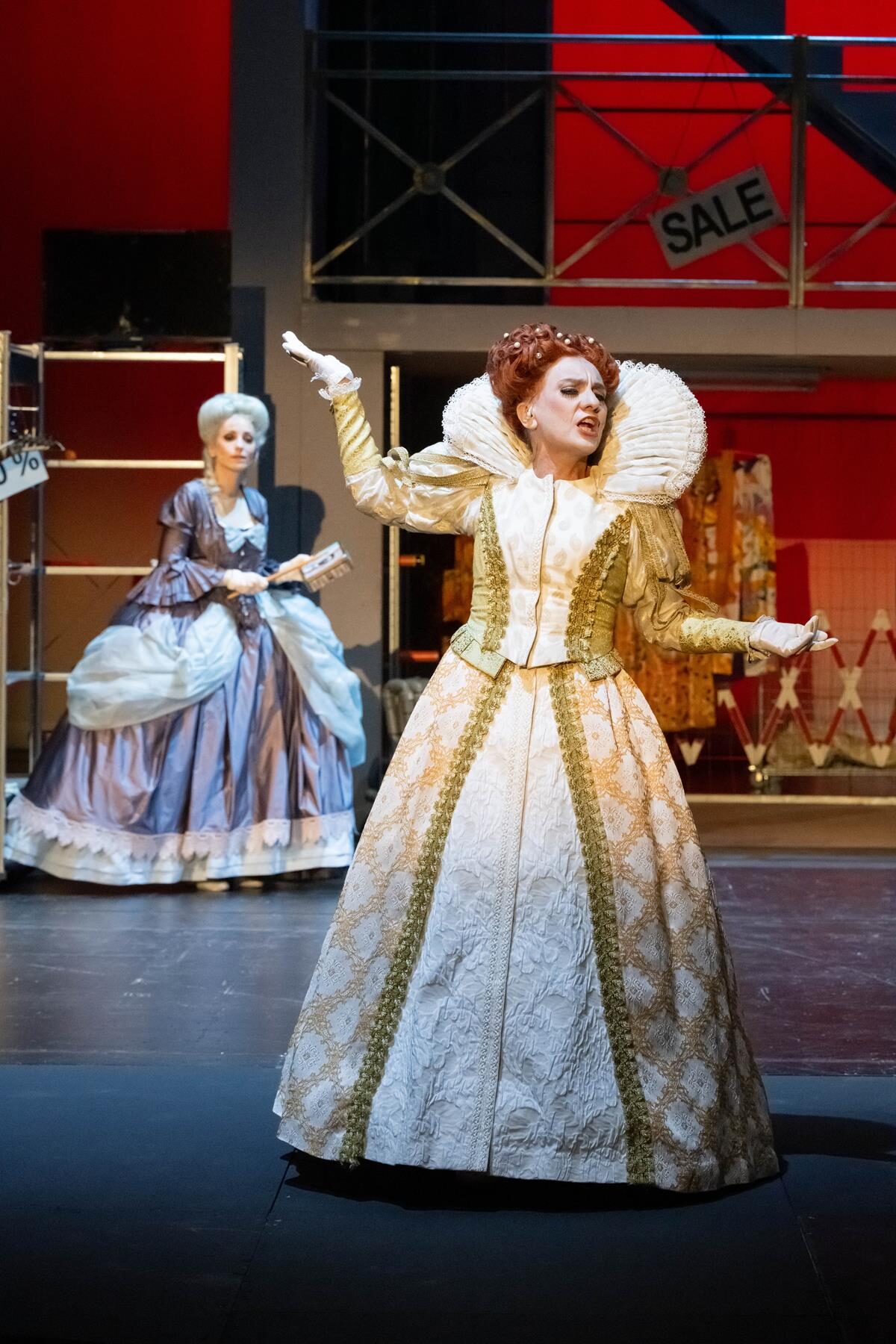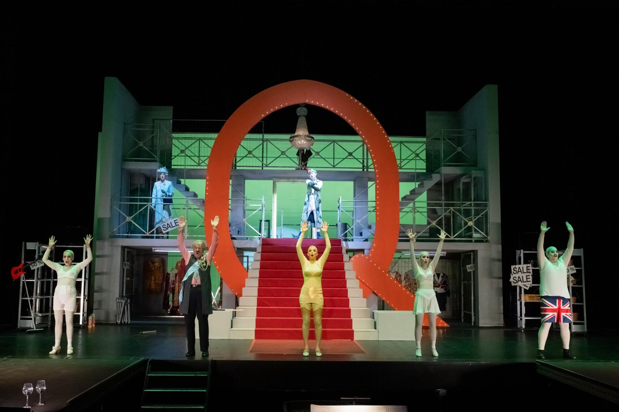 Das ist ihnen so außerordentlich gut gelungen, weil sie sich mit der Musik und den Inhalten der Songs der berühmten Gruppe Queen aufs Genaueste befasst haben, weil sie eine magische Geschichte dazu entwickelt haben und weil sie die Schauspieler je nach Stimme und Talent in ihre Rollen eingesetzt haben. Es fängt mit einer Durchsage des Geschäftsführers im Kaufhaus „Queen’s“ an: „Wir schließen zum letzten Mal.“ […] Der traurige Nachtpförtner (Bruno Winzen) schlurft an einem überdimensionierten ‚Q‘ vorbei, das eine Treppe mit rotem Teppich einrahmt. Am Fuß der Treppe stehen auf zwei Podesten seine Königinnen Maria Stuart und Elisabeth I.: Es sind Schaufensterpuppen in historischen Gewändern. Die anderen längst verblichenen Schwestern sind Viktoria und Maria Antoinette. Der Pförtner versichert sie seiner Zuneigung und drückt auf den Knopf am Schaltkasten. Eine wundersame Verwandlung mit Blitz und Donner setzt ein: Die Figuren werden lebendig. Und tragen ihre Fehden aus, in wohlgesetztem Theater-Englisch. Kilian im Amadeusgewand, benannt Rapid Roy, die Rockratte im Keller des Kaufhauses, hat seinen Orchestergraben bezogen und gibt den Ladys einen barocken Auftakt, verortet in ihrer Lebenszeit. Und dann gehen sie über zum ersten Song „Save Me“.[…] Die inhaltliche Fülle in diesen Liedern ist faszinierend. Es ist alles drin und für jeden was für die derzeitige Lage: Liebe, Eros und Tod und sämtliche anderen Fragen des Lebens. […] Esther Keil ist eine majestätische Elisabeth und zeigt wieder einmal, was sie kann. Szenenapplaus nicht nur einmal. Jannike Schubert ist ihre Gegenspielerin und überrascht später mit dem swingenden „My Melancholy Blues“. Carolin Schupa lässt ihren Reifrock kokett schwingen und ist nachher eine sehr junge anrührende Greta. Paul Steinbach mit Freddy-Mercury-Schnauzbart gibt eine herrlich grantige Viktoria und Ronny Tomiska ist ein dynamischer Superman. Überraschung: Adrian Linke bestens aufgestellt als Elisabeth II mit Hut und Handtasche und grünen Handschuhen. Alle bewegen sich nach einer Choreographie (Kerstin Ried), die man kaum bemerkt: Es gehört alles so, wie es geschieht. […] Großes Lob hat der Bühne und den Kostümen zu gelten: Anne Weiler hat mit Kennerschaft und Humor und Liebe zum Detail eine große Pracht entfaltet. […] Das Publikum dankte im Stehen (und mit Maske) mit minutenlangem Beifall für den anregenden, schwingenden, heiteren und auch besinnlichen Abend mit enormem Kultpotential.