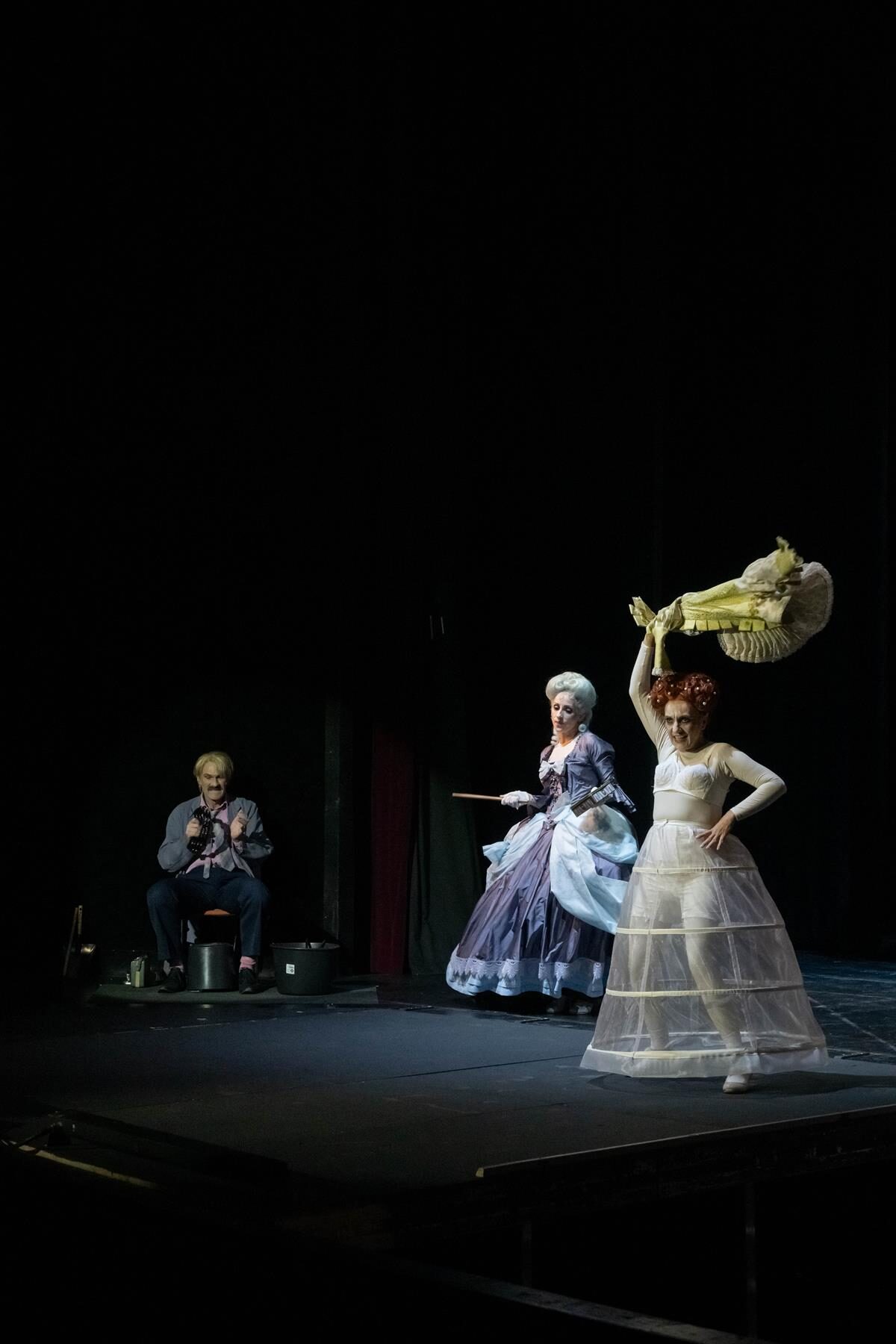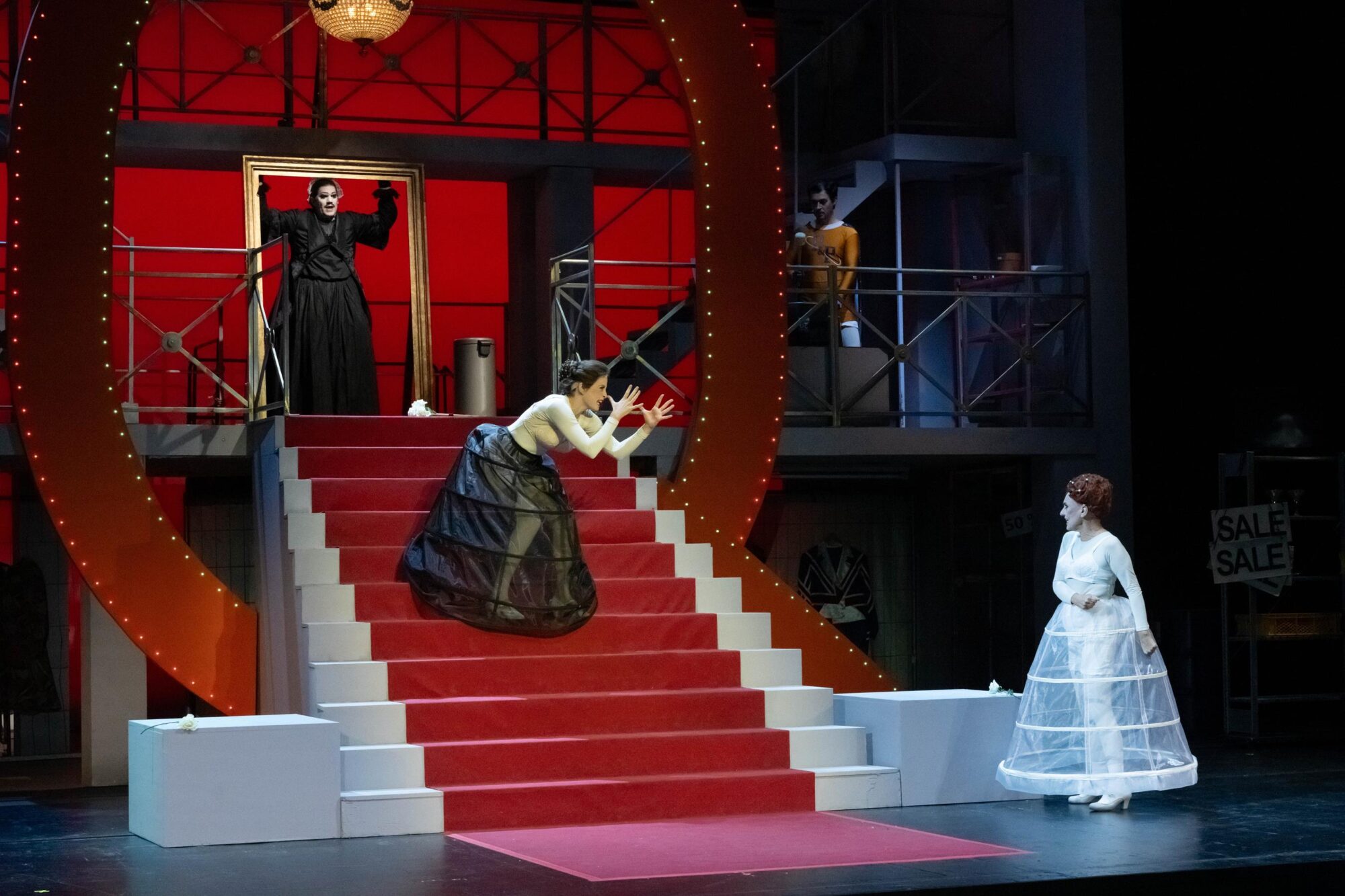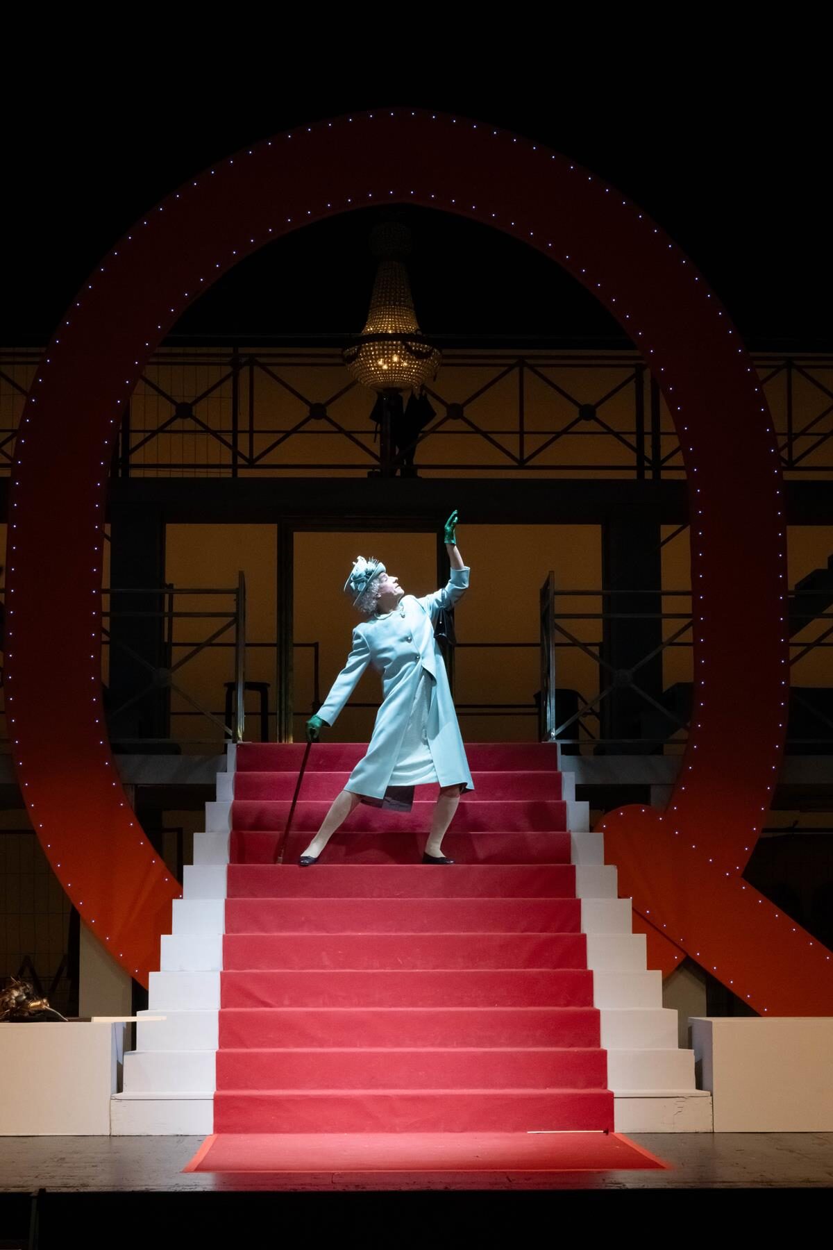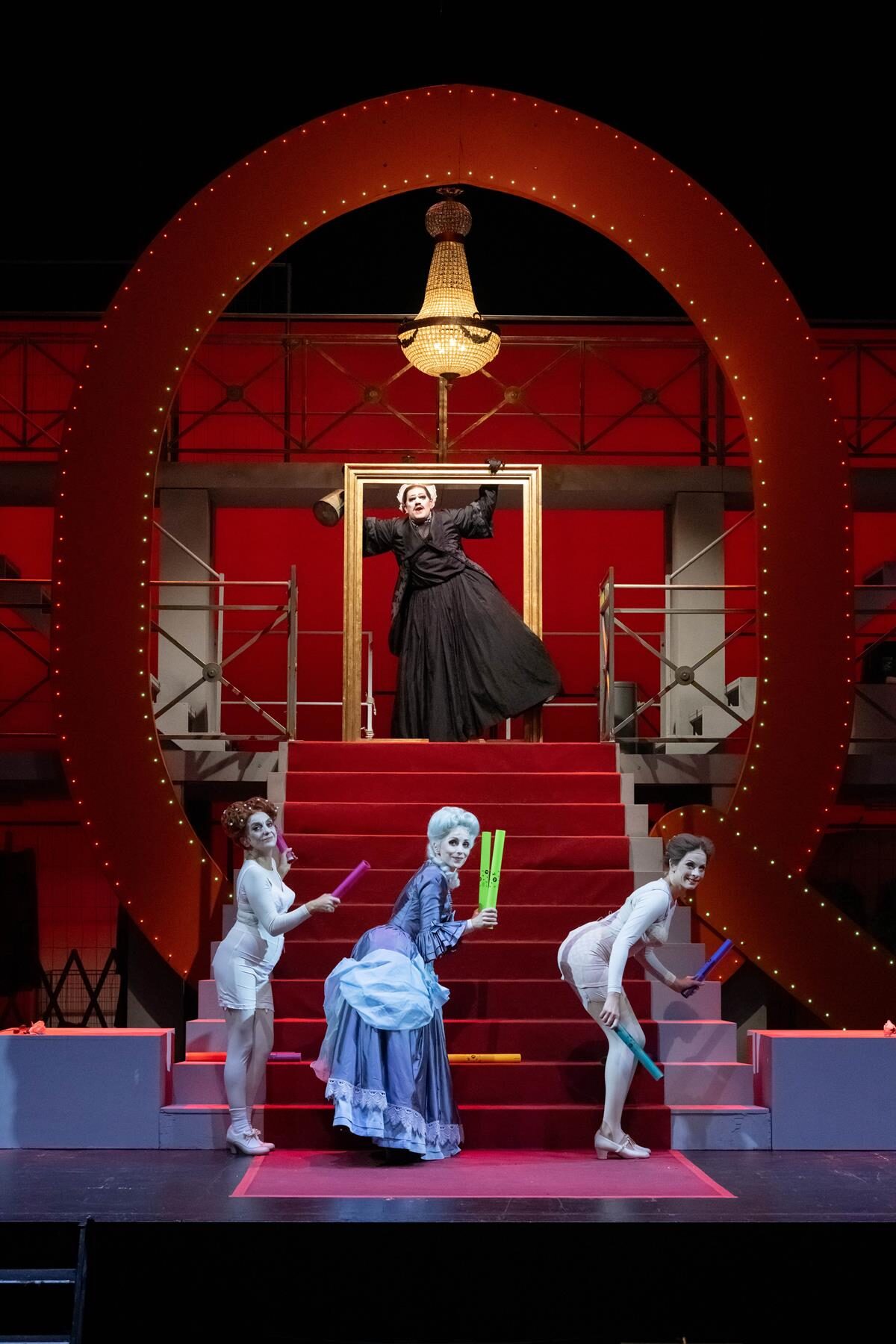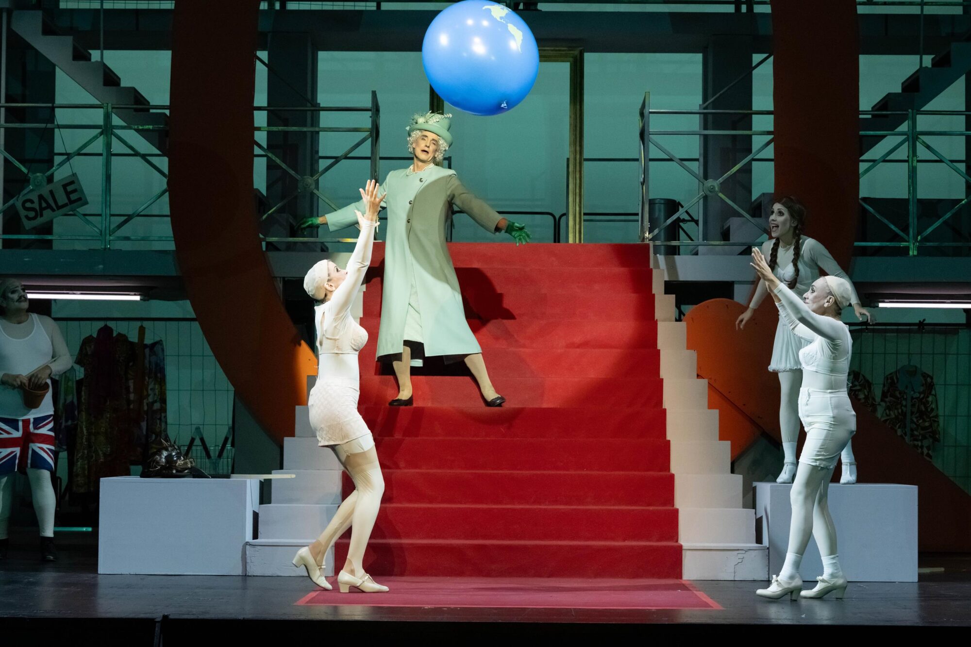 Das ist ihnen so außerordentlich gut gelungen, weil sie sich mit der Musik und den Inhalten der Songs der berühmten Gruppe Queen aufs Genaueste befasst haben, weil sie eine magische Geschichte dazu entwickelt haben und weil sie die Schauspieler je nach Stimme und Talent in ihre Rollen eingesetzt haben. Es fängt mit einer Durchsage des Geschäftsführers im Kaufhaus „Queen’s“ an: „Wir schließen zum letzten Mal.“ […] Der traurige Nachtpförtner (Bruno Winzen) schlurft an einem überdimensionierten ‚Q‘ vorbei, das eine Treppe mit rotem Teppich einrahmt. Am Fuß der Treppe stehen auf zwei Podesten seine Königinnen Maria Stuart und Elisabeth I.: Es sind Schaufensterpuppen in historischen Gewändern. Die anderen längst verblichenen Schwestern sind Viktoria und Maria Antoinette. Der Pförtner versichert sie seiner Zuneigung und drückt auf den Knopf am Schaltkasten. Eine wundersame Verwandlung mit Blitz und Donner setzt ein: Die Figuren werden lebendig. Und tragen ihre Fehden aus, in wohlgesetztem Theater-Englisch. Kilian im Amadeusgewand, benannt Rapid Roy, die Rockratte im Keller des Kaufhauses, hat seinen Orchestergraben bezogen und gibt den Ladys einen barocken Auftakt, verortet in ihrer Lebenszeit. Und dann gehen sie über zum ersten Song „Save Me“.[…] Die inhaltliche Fülle in diesen Liedern ist faszinierend. Es ist alles drin und für jeden was für die derzeitige Lage: Liebe, Eros und Tod und sämtliche anderen Fragen des Lebens. […] Esther Keil ist eine majestätische Elisabeth und zeigt wieder einmal, was sie kann. Szenenapplaus nicht nur einmal. Jannike Schubert ist ihre Gegenspielerin und überrascht später mit dem swingenden „My Melancholy Blues“. Carolin Schupa lässt ihren Reifrock kokett schwingen und ist nachher eine sehr junge anrührende Greta. Paul Steinbach mit Freddy-Mercury-Schnauzbart gibt eine herrlich grantige Viktoria und Ronny Tomiska ist ein dynamischer Superman. Überraschung: Adrian Linke bestens aufgestellt als Elisabeth II mit Hut und Handtasche und grünen Handschuhen. Alle bewegen sich nach einer Choreographie (Kerstin Ried), die man kaum bemerkt: Es gehört alles so, wie es geschieht. […] Großes Lob hat der Bühne und den Kostümen zu gelten: Anne Weiler hat mit Kennerschaft und Humor und Liebe zum Detail eine große Pracht entfaltet. […] Das Publikum dankte im Stehen (und mit Maske) mit minutenlangem Beifall für den anregenden, schwingenden, heiteren und auch besinnlichen Abend mit enormem Kultpotential.