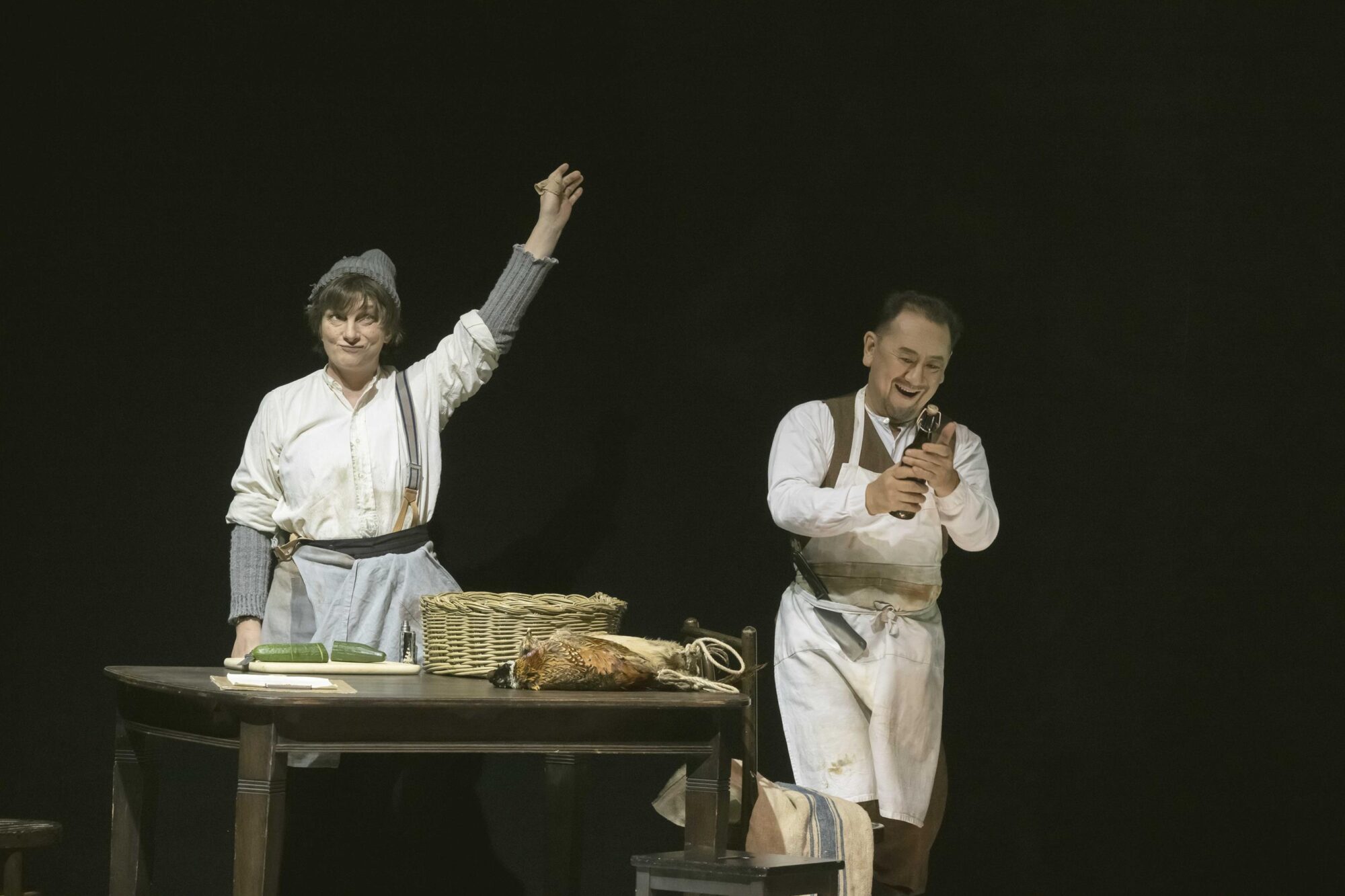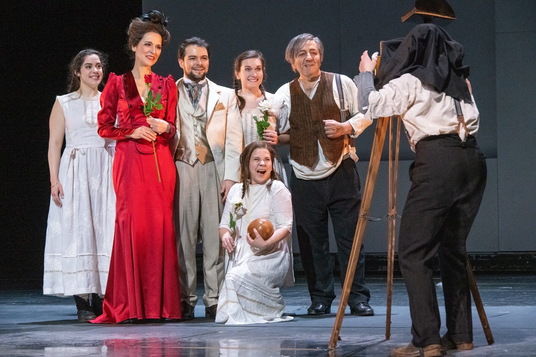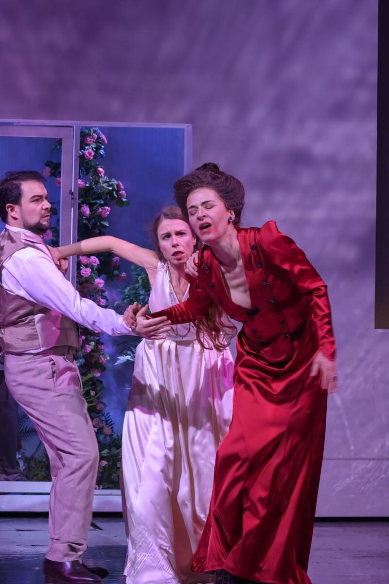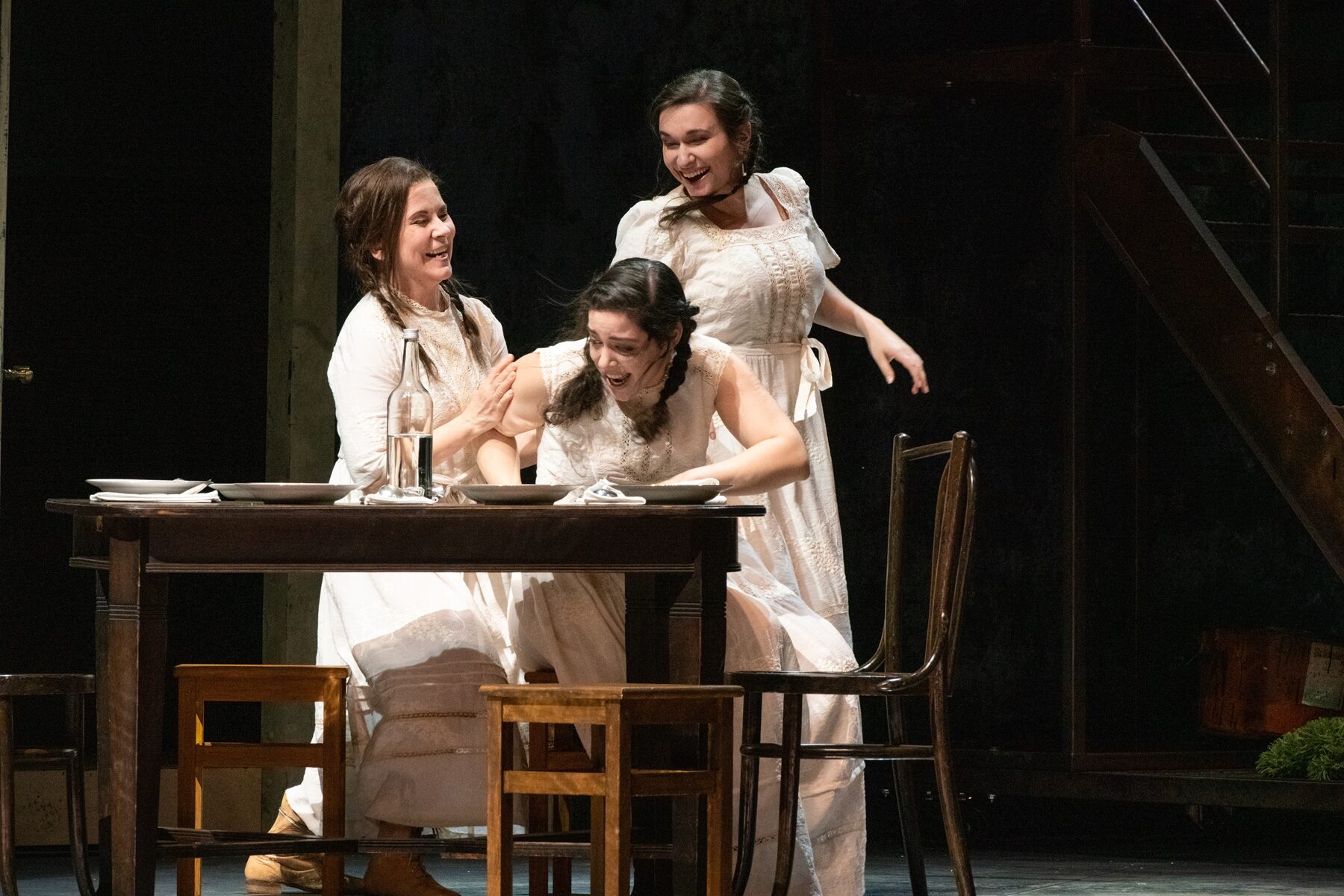 Der große Applaus gilt auch dem gut aufgestellten Chor, Chelsea Kolic, Gabriela Kuhn und Anne Heßling (die drei Schwestern) sowie Kairschan Scholdybajew (Heger) und Susanne Seefing (Küchenjunge).