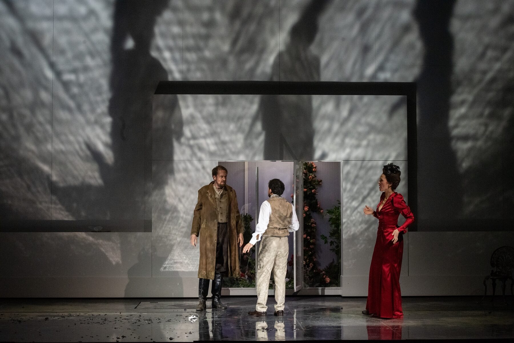 Das Bühnenbild Tatjana Ivschinas spiegelt die bedrückende Atmosphäre in der Familienkonstellation treffend wieder. Dass die Mutter dann doch ihrer Tochter durch alle möglichen Zaubermittel den Weg zu ihrem Prinzen ermöglicht, sie dafür aber zu Stummheit verdammt, erscheint in dieser Lesart des Märchenstoffes allerdings kaum schlüssig. Recht blass bleibt das Bühnenbild des zweiten Aktes. Der leere Raum wird von einer weißen Regalwand mit eingläsern und Weinflaschen begrenzt und weist mittig den Zugang zu einer Art Wintergarten mit Blumen auf. Vor diesem Hintergrund nimmt das Unheil seinen Lauf. […] Der Einfall der Verschmelzung beider Frauengestalten zu einer Person rettet zwar das Inszenierungskonzept Weigners, indem der perfide Machtanspruch der Mutter gegenüber ihrer Tochter die höchstmögliche Steigerung erfährt, mutet aber dem Zuschauer schon ein hohes Maß an Toleranz für überraschende Konstruktionen zu. Rusalkas Hilferuf an den Vater kann dieser nicht positiv beantworten, er ist nun ein am Stock gehender alter Mann, der sogar im Rollstuhl von seiner Frau geschoben werden muss, ein sinnfälliges Bild für die allumfassende Dominanz der Mutter in dieser Familientragödie. […]