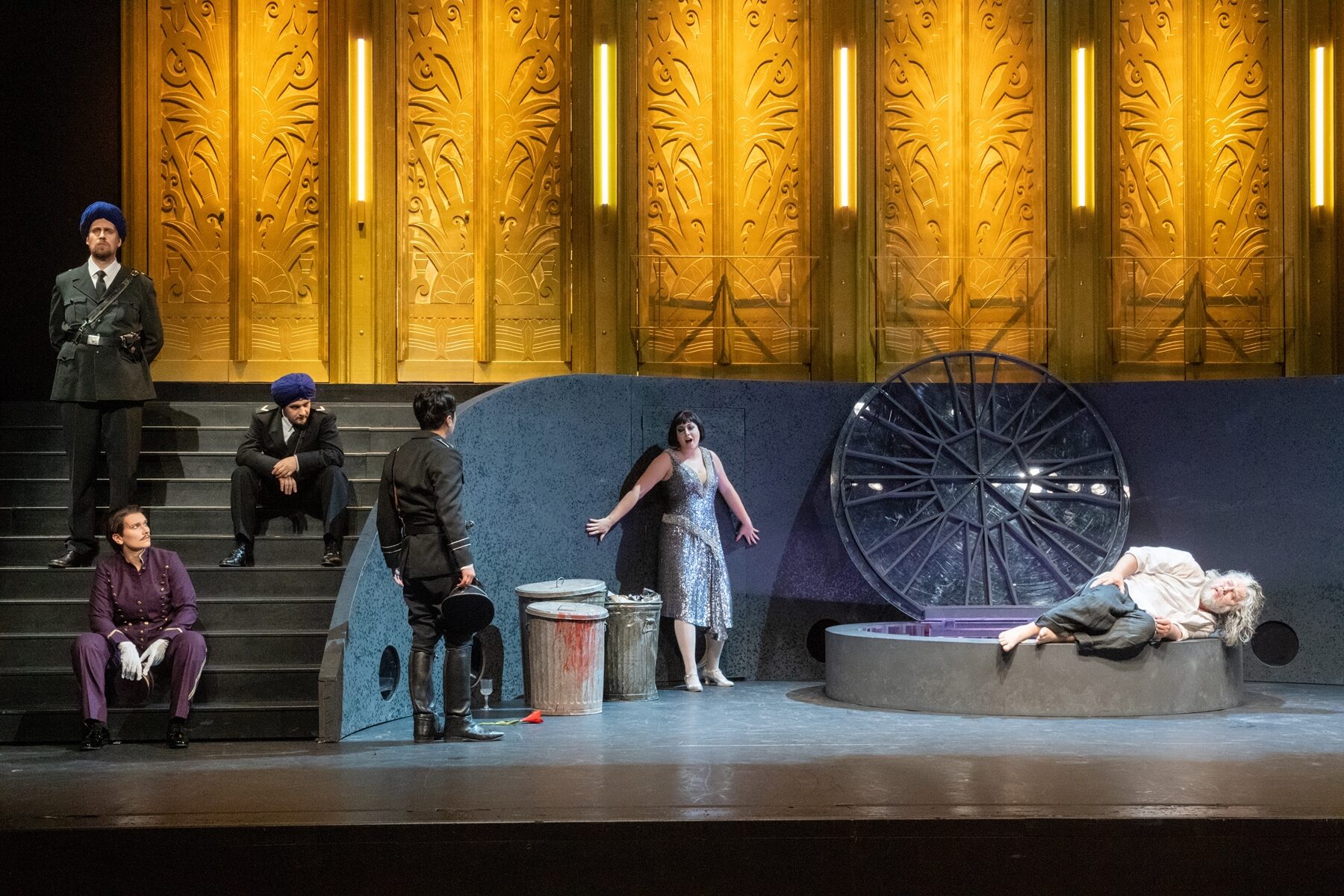 […] Für die grausame Geschichte hat Markus Meyer ein funktionelles, farblich sehr ansprechendes Bühnenbild geschaffen, das vom Bühnenboden, der von der mächtigen Abdeckung der Zisterne dominiert wird, über Treppen rechts und links zu sieben goldfarbenen, hohen Türen führt, die geöffnet den Blick in einen Festsaal freigeben. Durch Öffnen oder Schließen dieser Türen wird die Handlung immer wieder gut nachvollziehbar versinnbildlicht – ein gut durchdachter Einfall.