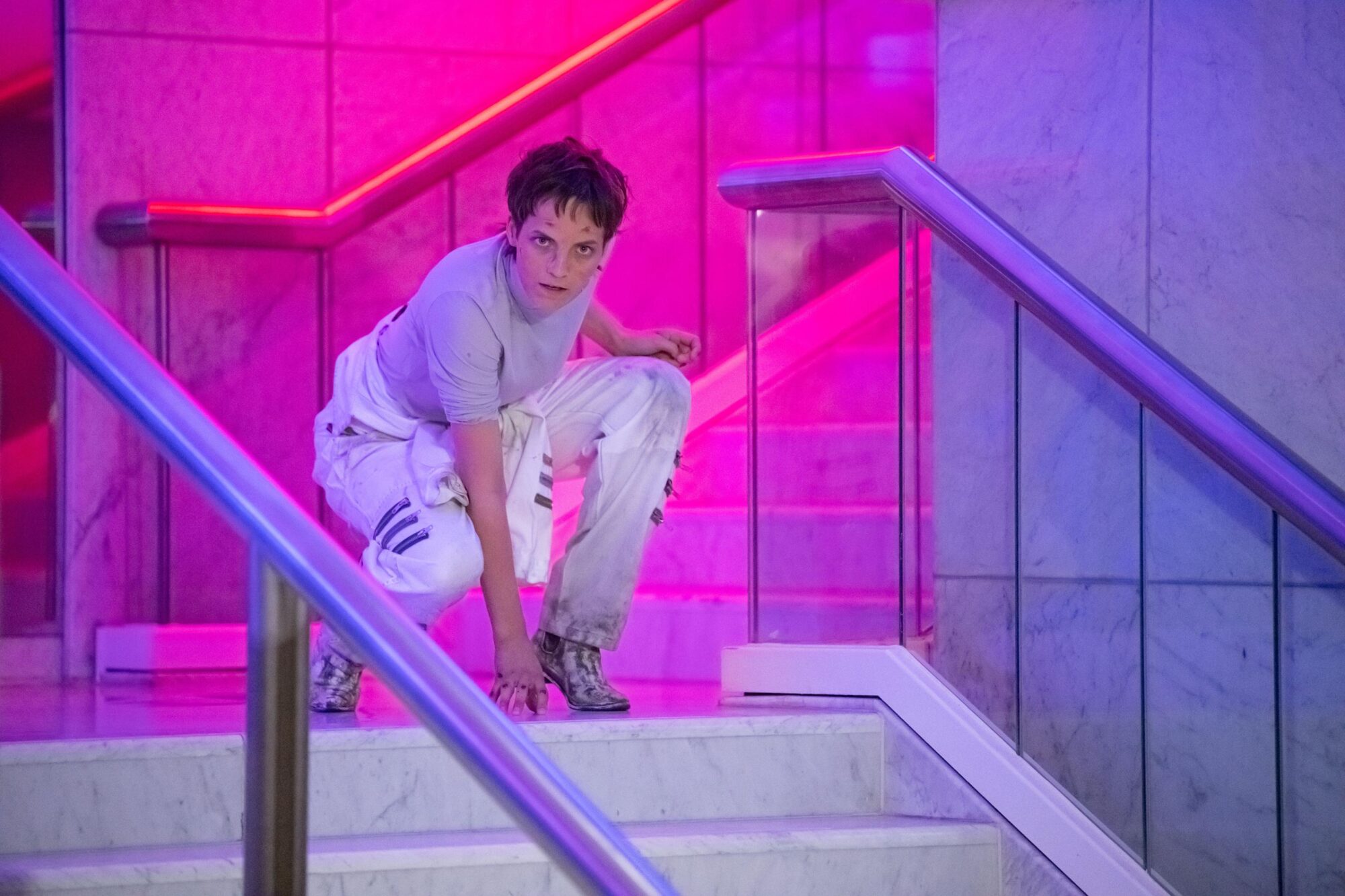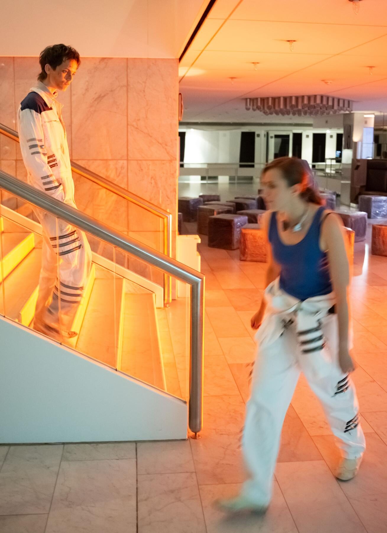 Hier ist alles anders als erwartet. Das Treppenhaus entpuppt sich als düsterer Korridor einer Planeten-Raumstation, die von zwei Sonnen – blau und rot – illuminiert wird. Zur Irritation tragen akustisch Gewitter und Naturlaute bei. Bin ich nun auf dem Weg ins Tiefgeschoss des Bühnenbaus oder Opfer einer Wahrnehmungsstörung? Eine Antwort geben András Dömötör und Meike Schmitz, die Lems Roman dramatisiert haben, nicht. Auch Schauspieler Bruno Winzen hat als Regisseur mitgearbeitet.”
