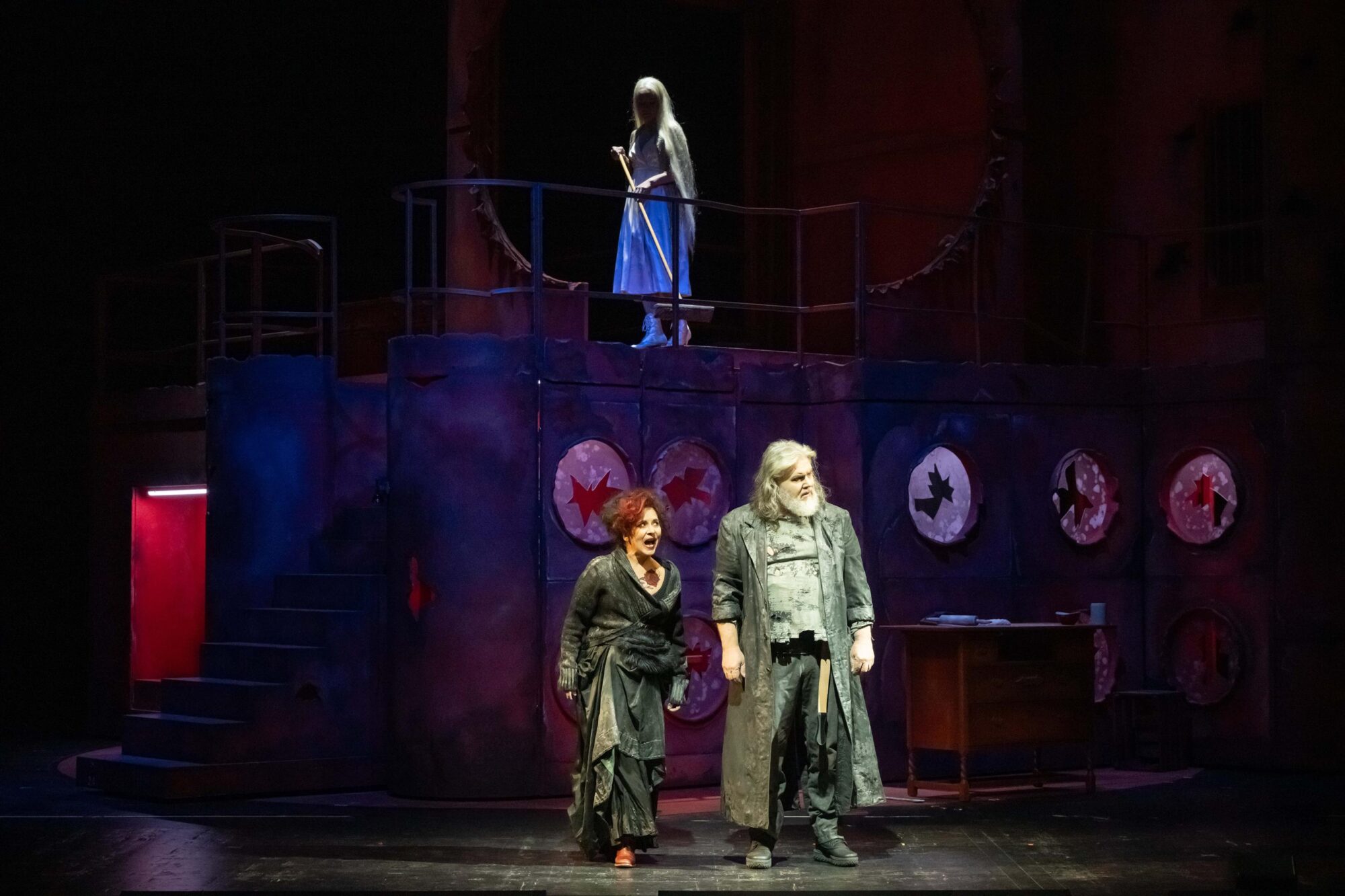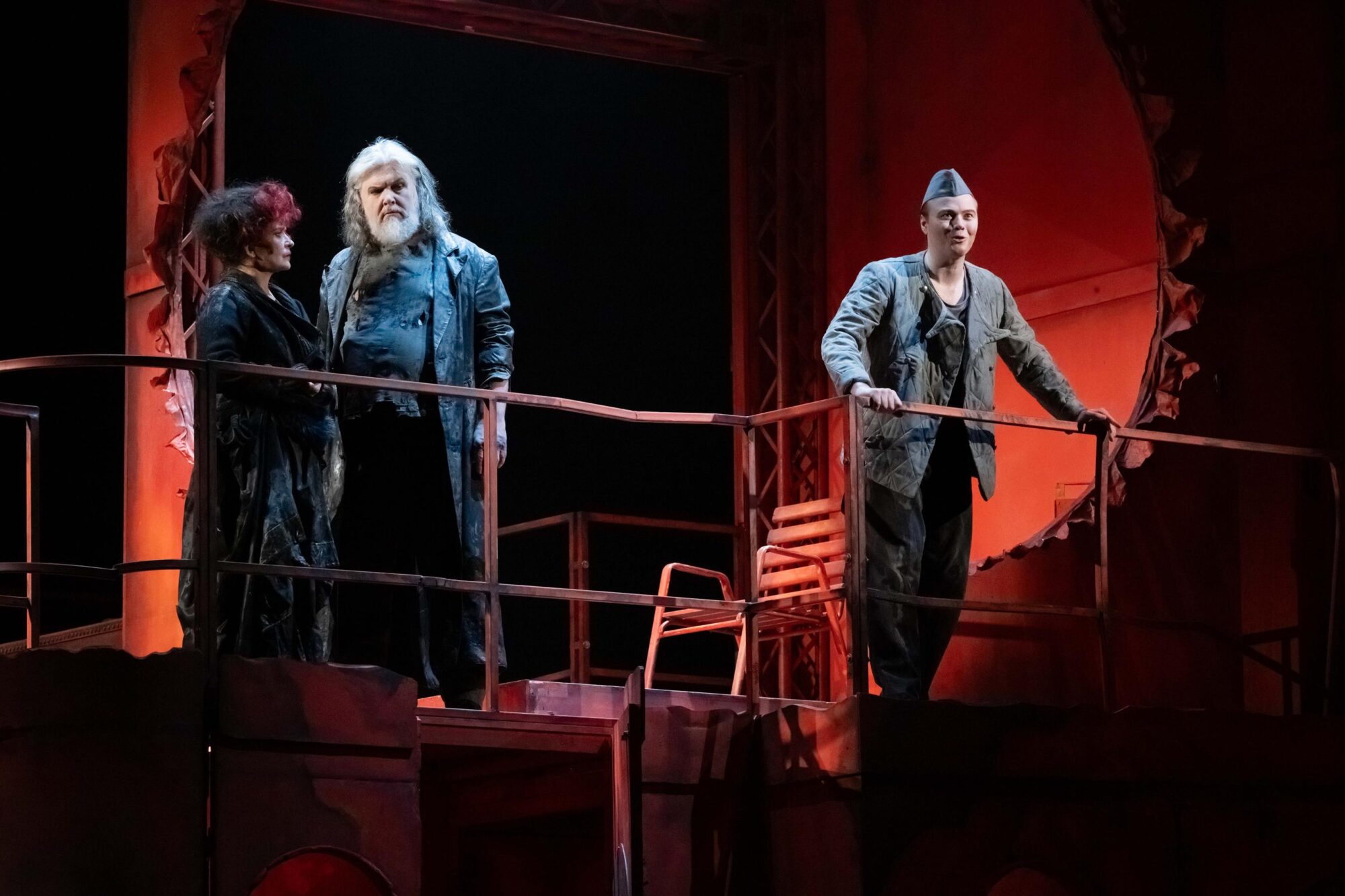 […] Lena Brexendorff hat auf der Drehbühne des Mönchengladbacher Theaters die schaurig-schöne Kulisse einer entkernten Burgruine errichtet. Schmutzig und in rotes Licht getaucht korrespondiert das morbide Setting mit der blutigen Story – aber auch mit den überwiegend in rötlichen Tönen gehaltenen Lumpen-Kostümen (ebenfalls Brexendorff) des Opernchors, der wie eine Mischung aus Trollen und Zombies durch die Szenerie wuselt.
