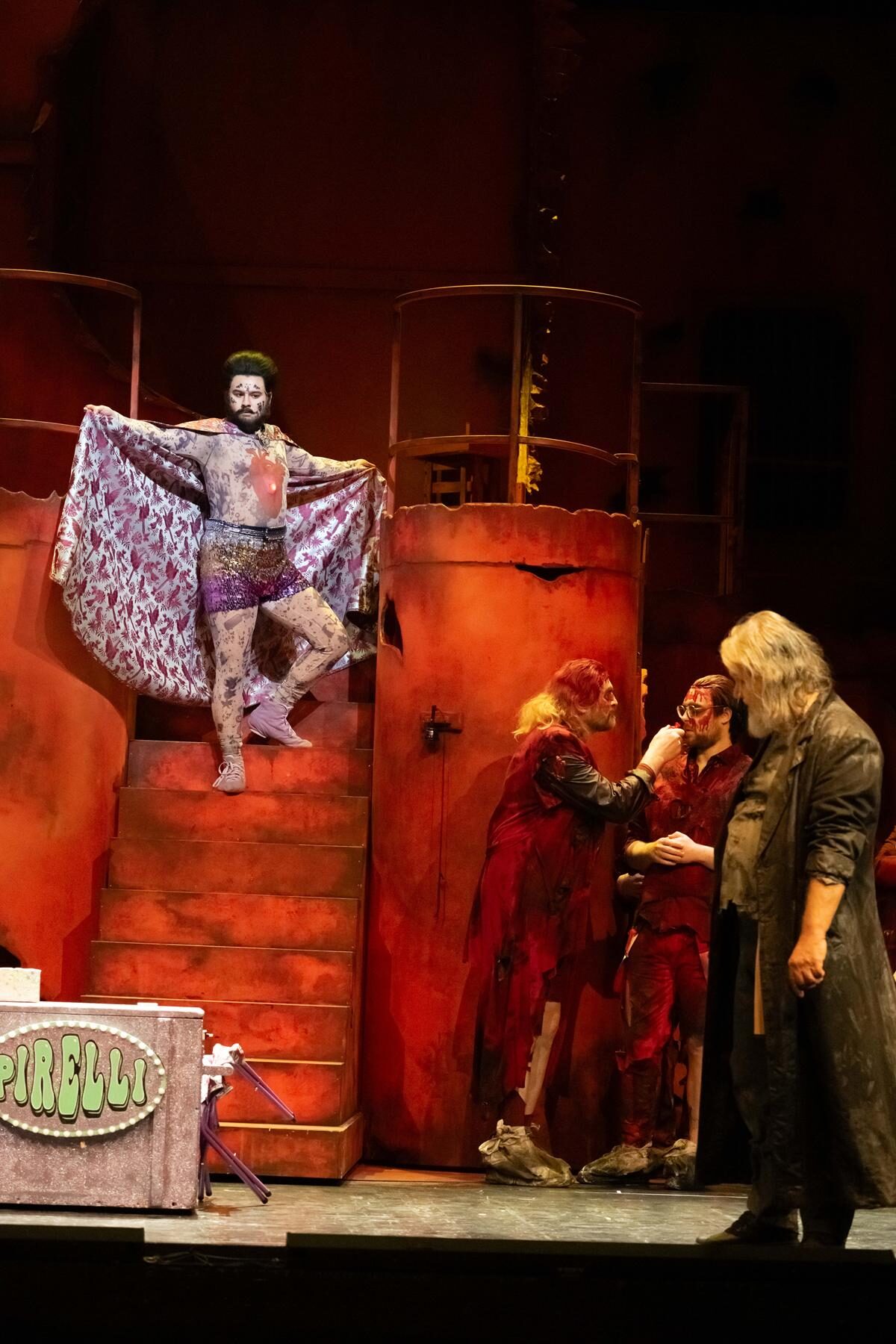 […] Auch bei den Kostümen setzt Brexendorff deutliche Akzente. Der Chor, der neben seiner musikalischen auch eine narrative Funktion einnimmt, ist in zerfetzte, blutrot verschmierte Lumpenkleidung gehüllt. Die Hauptfiguren sind ihrer sozialen Stellung und Gesinnung entsprechend ausgestattet. Wer mit dem Stück vertraut ist, erkennt die Rollen bereits beim Prolog „Vernehmt das Los von Sweeney Todd“. Todds blendender Rivale Pirelli tritt schillernd auf – im Ganzkörperanzug mit Tattoo-Look, Glitzerumhang und passender Geldbörse. Sweeney Todd und Mrs. Lovett erscheinen ärmlich und zerlumpt, in Schwarz gekleidet. Die Figuren außerhalb der Fleet Street tragen individuelle Kostüme: Turpin einen Anzug mit roten Akzenten, Anthony Hope Seemannskleidung, Johanna ein mit Blumen geschmücktes Kleid.