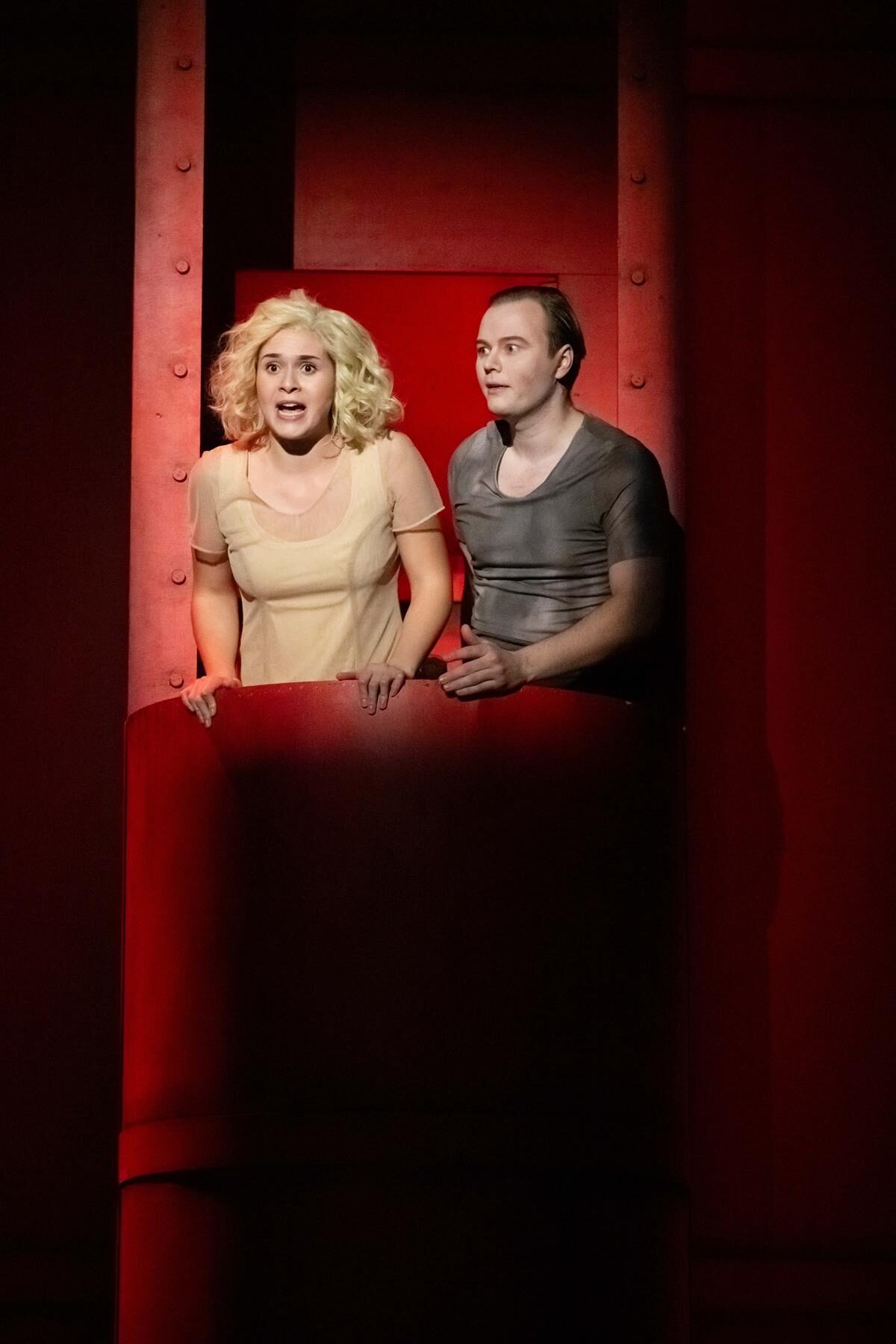angefangen beim wie in der antiken Tragödie und in modernem “epischen” Theater als Zombie-Schar in blutroten Fetzen Geschichte und Vorgeschichte reportierenden Chor (dessen Mitglieder auch in kleinen Formationen und Soli ihre Qualitäten zeigen dürfen). Diese ganz dem Publikum zugewandten Momente eines Heraustretens aus der Handlung à la Brecht – auch in der bei Burton gestrichenen Scena ultima mit kommentierenden Hauptpersonen – nutzt Regisseur Roland Hüve choreographisch geschickt: etwa eine Urteilsverkündung des Richters als direkte Verteilung aller im Saal oder die Synchronisierung der dank Dreh- und Vorderbühne gleichzeit erlebbaren Spielorte (Straße, Barbierstube, Lovetts Reich und die Front des Richterhauses mit Rapunzel-Balkon). Das alles trägt zu einer merklich anderen Stimmung bei, in der man sich stärker vom Geschehen distanziert und auch überraschend schöne und lustige Momente genießen kann. Als lichtender Kontrapunkt begeistert besonders das bei Burton völlig getilgte, hinreißende “Küss mich”-Duett des hoffnungsvoll in die von Turpin eingesperrte Tochter Johanna verliebten Seemanns Anthony. James Park glänzt in dieser tenoralen Rolle mit klarer Diktion und perfekten Musical-Portamenti (Ansingen kleiner Melodiesprünge von unten) mit viel Schmelz in der Stimme. Antonia Busse als Johanna irritiert zwar in ihrer Auftrittsarie mit opernhaft fast zu breitem Vibrato, das angesichts des metaphorischen Wunsches eines Vogels im Käfig nach freiem Gesang und Flug aber hier ganz gezielt als Ausdrucksmittel einsetzbar erscheint (Jayne Wiesener macht das bei Burton mit viel schwächerer Stimme übrigens genauso); in den Duetten ist sie ganz eine nicht nur gesangstechnisch perfekte, sondern auch wie Anthony einzig liebenswerte natürliche Partnerin. Überhaupt besitzt die vollständige Fassung viele offenere komödiantische Momente, das Stück lässt sich gegenüber dem Film gerade in der wohl von Regie und Ausstattung beabsichtigten Mischung aus Referenzen und Differenzen neu entdecken (und der Film im nachmaligen Wiederanschauen auch). Zwar hat generell der Film als “Gesamtkunstwerk” inzwischen der Idee des “musikalischen Dramas” nach Richard Wagner und dem Verismo den Rang abgelaufen; Sondheim gelingt es jedoch, seine dunkle “Operette” (so sein Versuch einer Genre-Bestimmung) in der Verschachtelung der großen alten Themen Rache und Liebe mit ebenso komplexer, polyphon und klangfarbenschwelgerisch instrumentierten Musik einen in sich geschlossenen ästhetischen Kosmos zu generieren, dem das Premierenpublikum in Mönchengladbach – auch dank des stimmigen Gesamtkonzepts dieser ihre Figuren mitfühlend bedenkenden Inszenierung – wohl zwangsläufig verfiel.