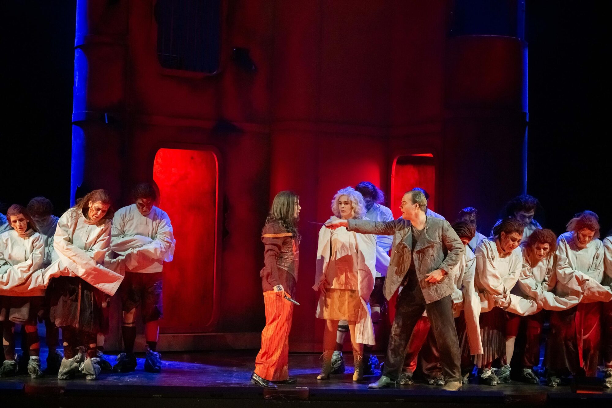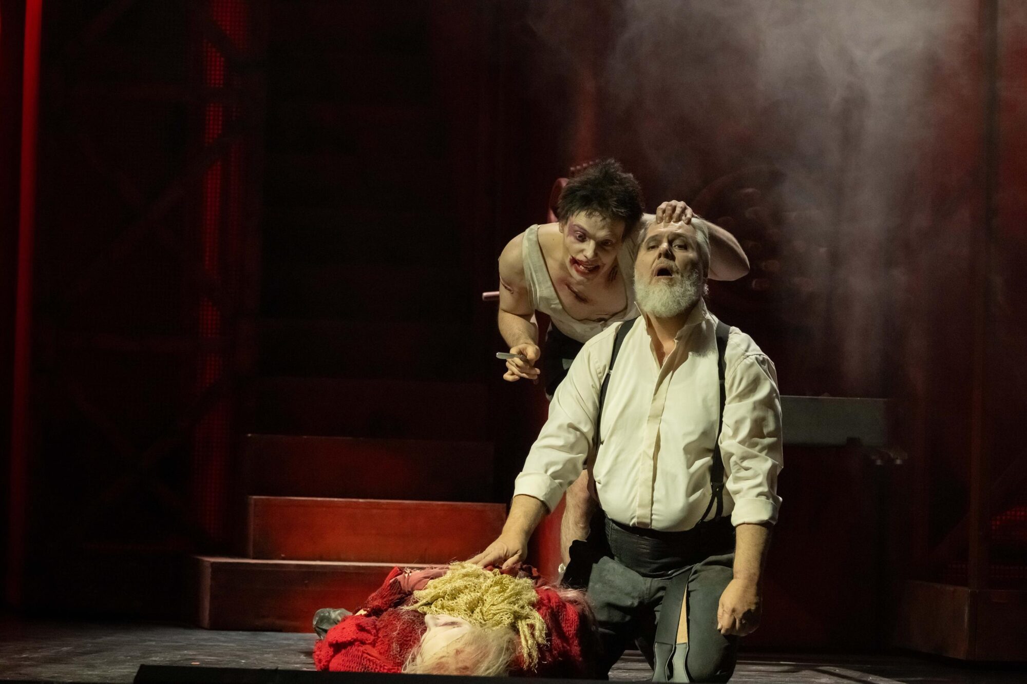 Ein Rasiermesser ist das wichtigste Requisit in dem Musical. Bevor der unschuldig verurteilte, aus fast 15-jähriger Verbannung nach London heimkehrende Barbier Benjamin Barker unter neuem Decknamen seinen Salon wieder betreten kann, recken die Mitglieder des Opernchors allegorisch je zwei Finger in die Höhe, die sie dann ruckartig quer vor ihre Kehlen ziehen – die wohl primitivste, aber weltweit wirkungsvolle Drohgeste in kriminellen Milieus. Ihre blutverschmierten Gesichter und Fantasiekostüme weisen sie als Untote aus, ihr ernster Gesang zieht tief in Bann. Das hat Opernchordirektor Michael Preiser in effizienten Proben erreicht.