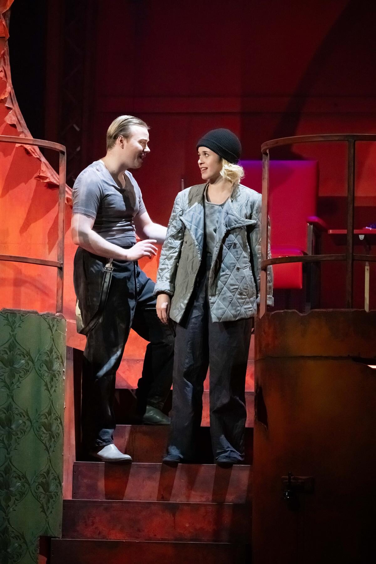 Auf Splatter-Blut wird in Roland Hüves Inszenierung allerdings bewusst verzichtet“, was auch Zuschauerin Esther Hegyaljai gefällt. „Ich habe den Film gesehen, in dem ziemlich viel Blut spritzte und war gespannt, wie das Thema auf der Bühne inszeniert wird. Das Ergebnis finde ich sehr gelungen“, betont sie. Wie das gesamte Publikum erfreut Hegyaljai sich an den düster-prächtigen Kostümen und dem atmosphärischen, immer wieder in blutrotes Licht getauchten Bühnenbild — beides gestaltet von der aus Berlin stammenden Bühnen- und Kostümbildnerin Lena Brexendorff. Esther Hegyaljais und ihre Begleiterin Silke Beyer sind begeistert, wie es der Bühneninszenierung gelungen ist, aus der blutrünstigen Geschichte einen unterhaltsamen Theaterabend mit tiefschwarzem Humor zu machen – so zum Beispiel in der Szene, in der Sweeney Todd und Mrs. Lovett darüber diskutieren, welche Berufsgruppe das zarteste Fleisch hat.