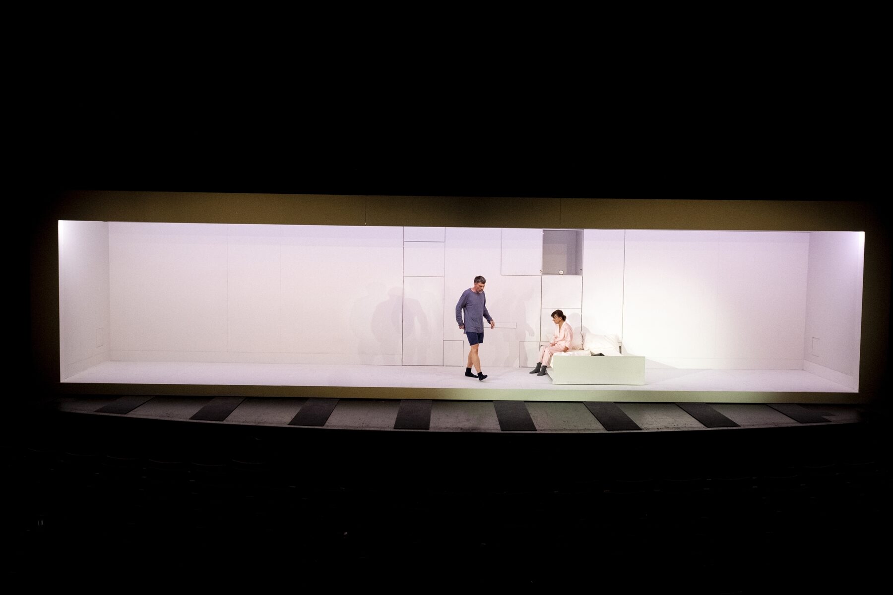 Denn Ingmar Bergmans „Szenen einer Ehe“ der als Film (mit der unvergleichlichen Liv Ullmann) fest im kollektiven Gedächtnis der heutigen Ü60-Generation verwurzelt ist, pikst auch in der Theaterfassung noch jene Probleme auf, die eine institutionalisierte Zweierbeziehung so mit sich bringt. Gerade wenn sie in die Jahre kommt. Schauspieldirektor Matthias Gehrt entscheidet sich […] ein Zweipersonenstück im Großen Haus zu spielen. Diesmal baut ihm Gabriele Trinczek einen schicken, weißen, kühlen Schubladen Guckkasten nah an die Rampe, damit die von Esther Keil und Bruno Winzen als Marianne und Johan verhandelten Intimitäten auch den in den hinteren […] Reihen sitzenden Zuschauern unter die Haut gehen. Die Urgesteine des Ensembles entwickeln in den Dialogen, den Momenten des Schweigens, den leeren und den beredten Gesten, auch in den dramatischen von Sex und Gewalt geprägten Ausbrüchen eine beeindruckende Kraft. Die Entwicklung der Marianne vom Heimchen zur starken Frau die des Johan vom selbstgefälligen Prof zum Jammerlappen findet in all ihren verletzenden, tragischen, notwendigen Aspekten das Mitgefühl des Publikums. Gehrt stilisiert die Schnitte, spielt Vivaldi und Pärt, endet happy in einem Südsee-Video. Dabei ist, was war, kaputt. Viel Beifall.