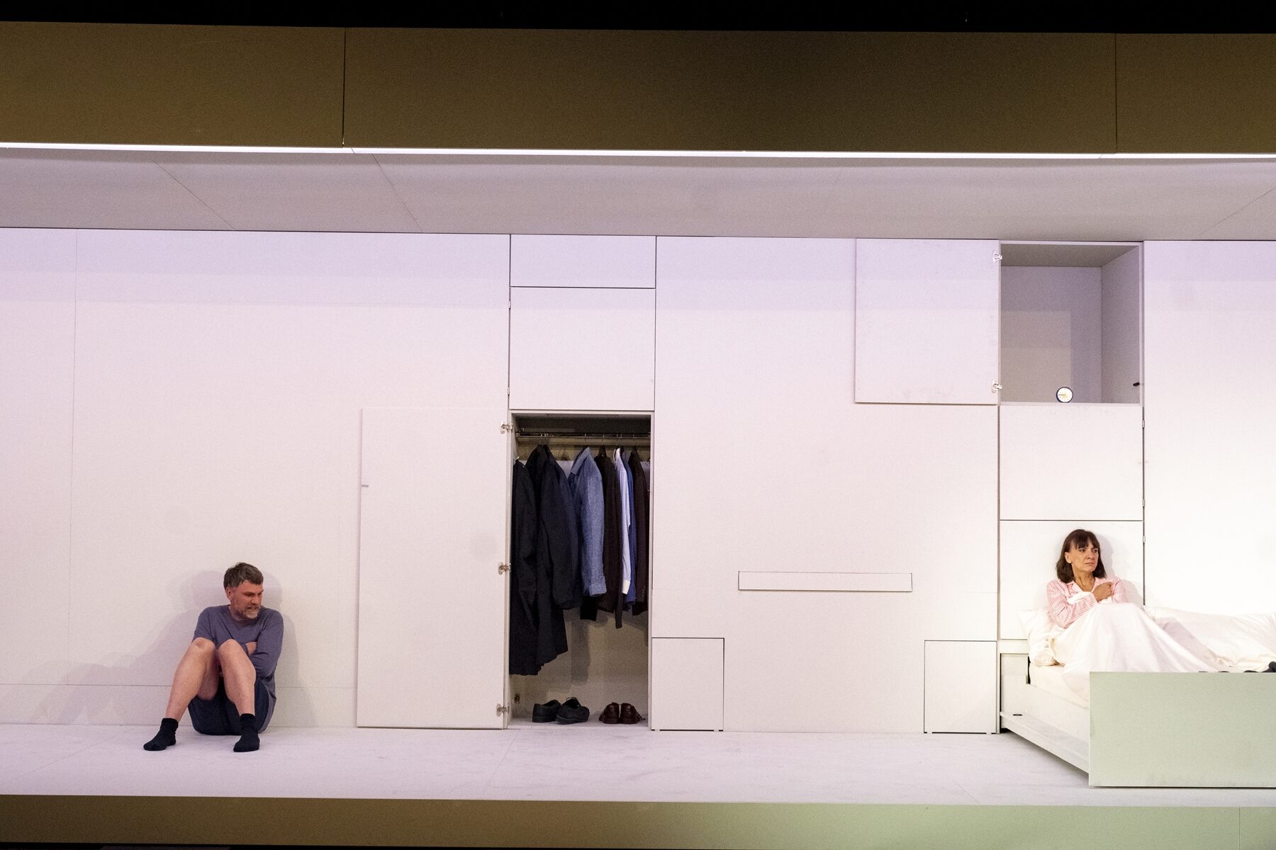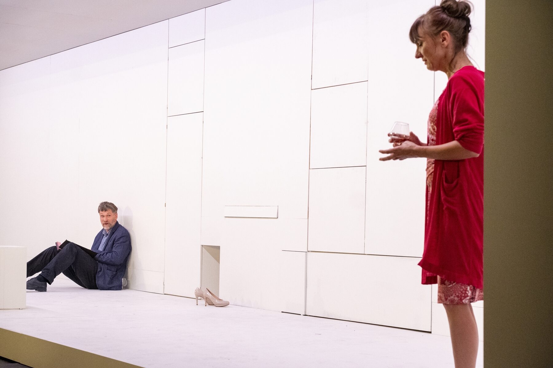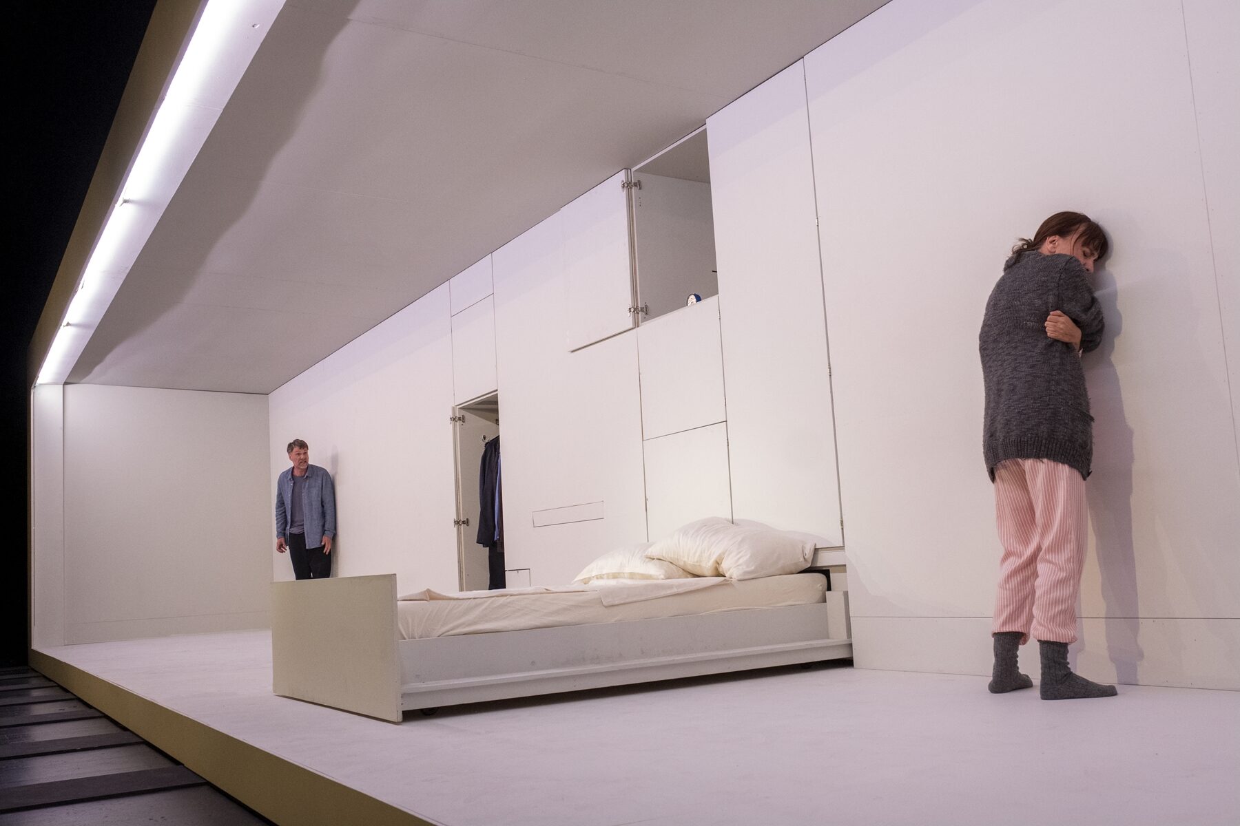 Das Paar hat sich eingerichtet mit weißen Einbaumöbeln, in denen alles verschwindet, was zum Leben gerade nicht gebraucht wird. Marianne (Esther Keil) und Johan (Bruno Winzen) sind Leute von nebenan, die im gehobenen Allerwelts-Chic gekleidet sind (Kostüme: Petra Wilke). Beide sind geübt in der Kunst des Untern-Teppich-Kehrens. Beim gemütlichen Kaminabend lässt er eine Tirade seiner Vorzüge los, während ihr zur eigenen Beschreibung nur einfällt, dass sie mit ihm verheiratet ist und sich nach nichts sehnt außer nach dem Sommer. Kurz darauf sagt sie zum ersten Mal, dass sie gar nicht genau weiß, wer sie ist. Gabriele Trinczeks Bühnenbild ist für das komplexe Gefühlschaos maßgeschneidert: Alles, was stört, lässt sich wegsperren und wird unsichtbar. Es ist ein minimalistisch designter, geräumiger weißer Kasten auf der großen Bühne – ohne Tür und ohne Fluchtöffnung für die Akteure. Regisseur Matthias Gehrt lässt den Schauspielern Raum, den sie in jedem Moment füllen. Unpathetisch und doch leidenschaftlich, wütend, verzweifelnd und kämpferisch demonstrieren sie die Zerbrechlichkeit ihrer Welt. Sie können nicht mehr mit und noch nicht ohne einander. Johans Liebe zu einer anderen Frau ist der Wendepunkt. Esther Keil zeigt alle Windungen der verratenen Frau, die sich erniedrigt, um am Mann festzuhalten und dabei gleichzeitig einen letzten Funken Würde wahren will. Das ist so untheatralisch traurig, dass man auf ihrer Seite sein muss. Doch auch Winzen zieht alle Gefühlsregister, wütet, um sich aus zu lang ausgehaltener Starre zu befreien, biegt und windet sich zwischen dem Reiz des Neuen und der Angst, das Vertraute zu verlieren. Die andere Frau bringt kein Glück. Nach einem Jahr ist Johan privat und beruflich gestrandet, aber Marianne hat inzwischen den Geschmack von Freiheit erfahren. Die Gewichtung in der Beziehung kippt. Fast unmerklich hat derweil die angestaute Aggression den letzten Rest gegenseitigen Respekts gefressen. Jetzt wird es auch physisch brutal. Erst nach Jahren der Trennung reden beide wieder miteinander und erlangen ein fragiles Gleichgewicht. Vielleicht eine vorsichtige Annäherung. Der Abend ist Schauspielertheater von höchster Qualität und macht deutlich, warum Bergmans Verfilmung ein Straßenfeger war. Auch nach 47 Jahren zieht der Stoff noch.