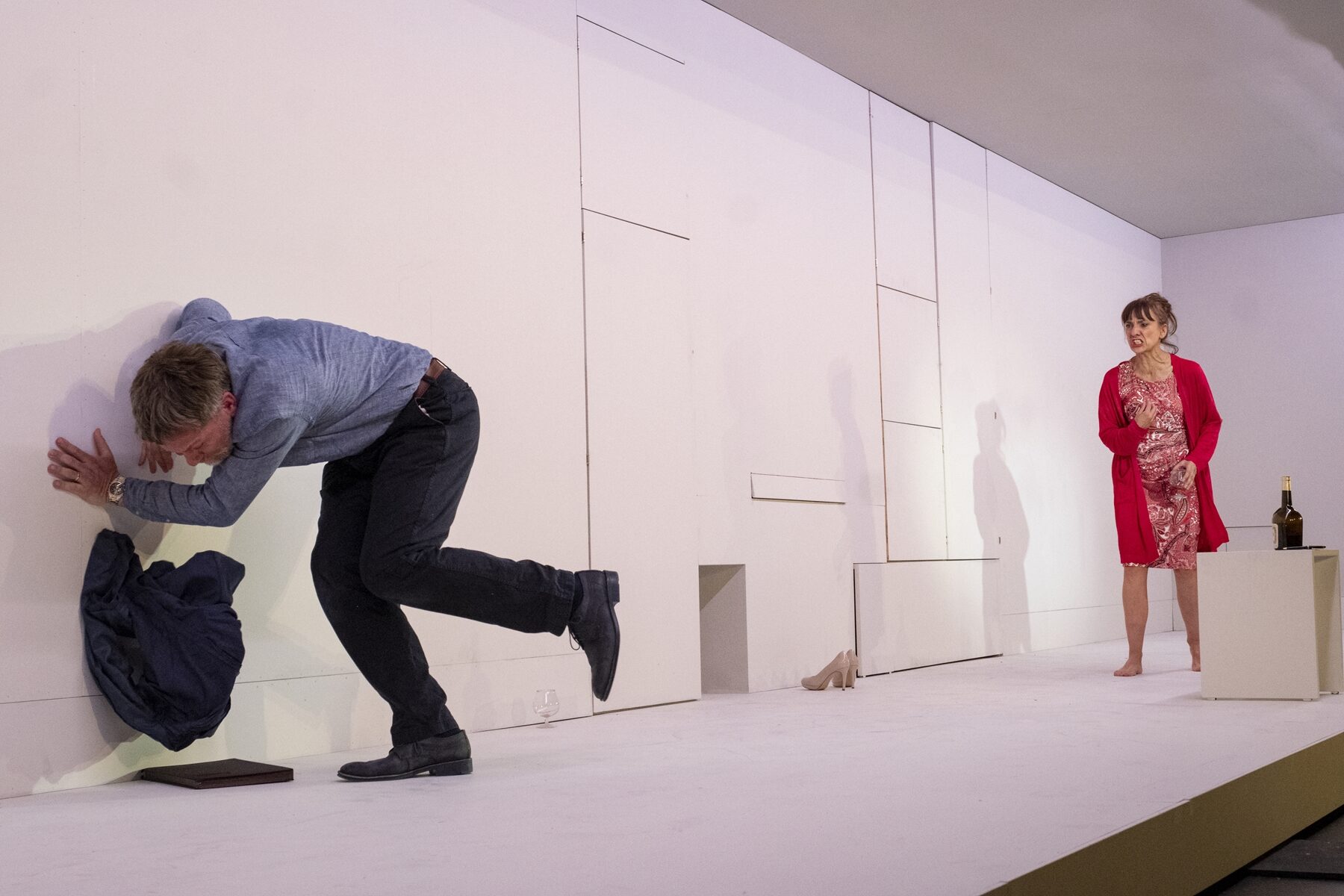 Hinter der gut situierten bürgerlichen Fassade breitet sich lähmende Alltagsroutine aus, bis sich plötzlich Abgründe auftun und alles Bisherige in Frage stellen. […] Die jetzt in Krefeld aufgeführte Bühnenfassung hat das Werk aus den 1970er-Jahren in die heutige Zeit geholt. Das beginnt bereits mit der geschmackvoll reduzierten Ausstattung (Bühne Gabriele Trinczek, Kostüme Petra Wilke). Ein weißer, nur nach vorne geöffneter Kubus nimmt die gesamte Bühnenbreite ein. Ein klinischer Raum, aus dem es scheinbar kein Entrinnen gibt. Bereits in der ersten Szene, als beide entspannt bei einem Glas Wein sitzen, werden feine Risse sichtbar. Während Johan sehr viel über ihr gemeinsames Leben und seine Qualitäten spricht, weiß Marianne nur ganz wenig dazu zu sagen.[…] Passend dazu ist auf der eingeblendeten Überschrift „Die Kunst des Unter-den-Teppich-Kehrens“ zu lesen. Diese Überschriften leiten jedes neue Kapitel des Dramas ein, begleitet von den Klängen barocker Musik. Als die Überschrift „Paula“ lautet, wird sofort klar, was folgt. Johan hat eine Andere kennengelernt und eines Abends stellt er Marianne vor vollendete Tatsachen. Der Dozent will mit Paula, einer jungen Studentin, ein neues Leben beginnen. Doch der harte Schnitt, den er macht, bedeutet noch lange nicht das Ende seiner Beziehung zu Marianne. Vor allem im zweiten Teil des zweistündigen Abends kommt es bei verschiedenen Begegnungen der beiden zu einem ständigen Hin und Her. Motor ist eine nach wie vor bestehende erotische Anziehungskraft. Sie scheint, wo man die Routine des Ehealltags hinter sich gelassen hat, sogar stärker denn je zu sein. Zugleich sucht jeder Stabilität in seinem neuen Leben. Vor allem Marianne macht eine Entwicklung zu einer eigenständigen Frau durch. Doch kurz bevor die Scheidung dann endlich vollzogen wird, eskaliert die Situation zu einer verbalen und körperlich verletzenden Schlammschlacht. Winzen und Keil überzeugen in diesen fast ans Groteske grenzenden Szenen ebenso wie in den stilleren Momenten. Auf faszinierende Art und Weise jonglieren sie mit dem Auf und Ab der Beziehung und tragen damit den Abend. Das Ende führt sie auch bildlich in ruhigere Fahrwasser. Fazit: Ein emotional packender und teilweise amüsanter Abend, bei dem jeder Eheerfahrene Bekanntes entdecken wird. Die Reaktionen des begeisterten Premierenpublikums ließen jedenfalls darauf schließen.