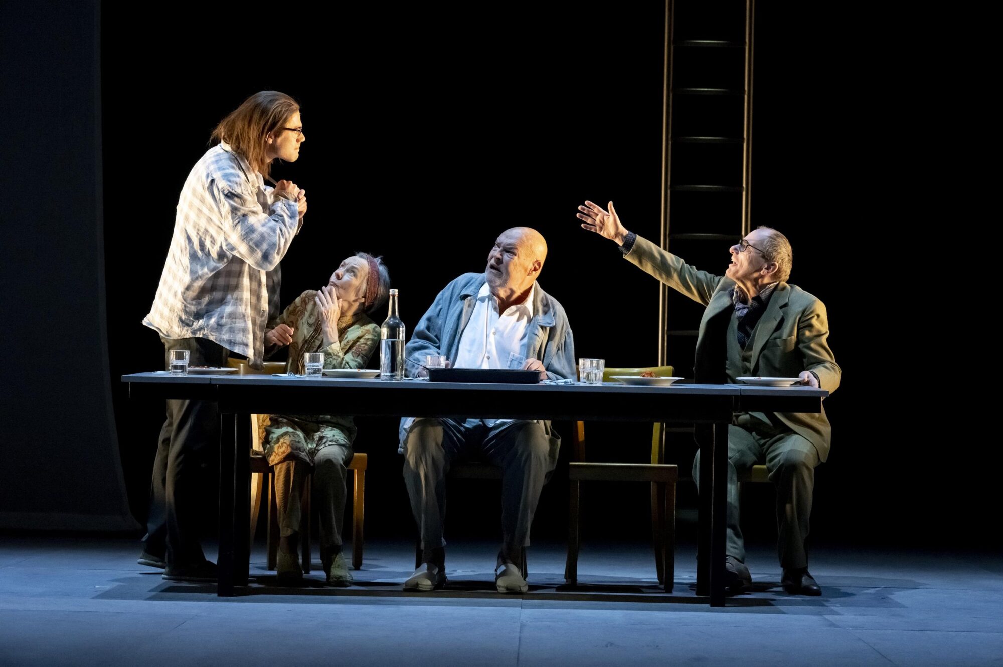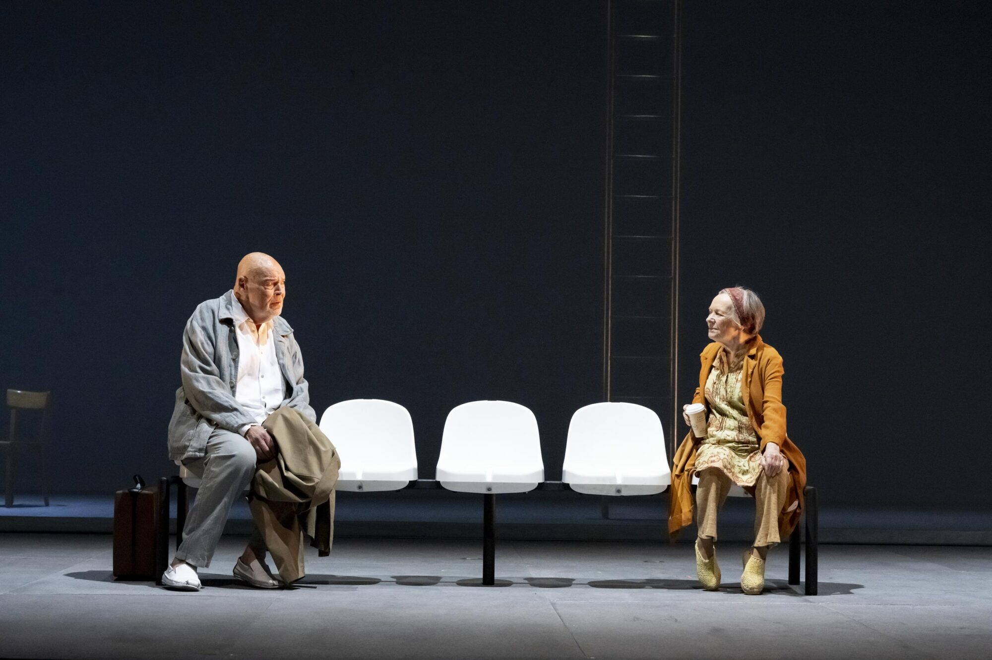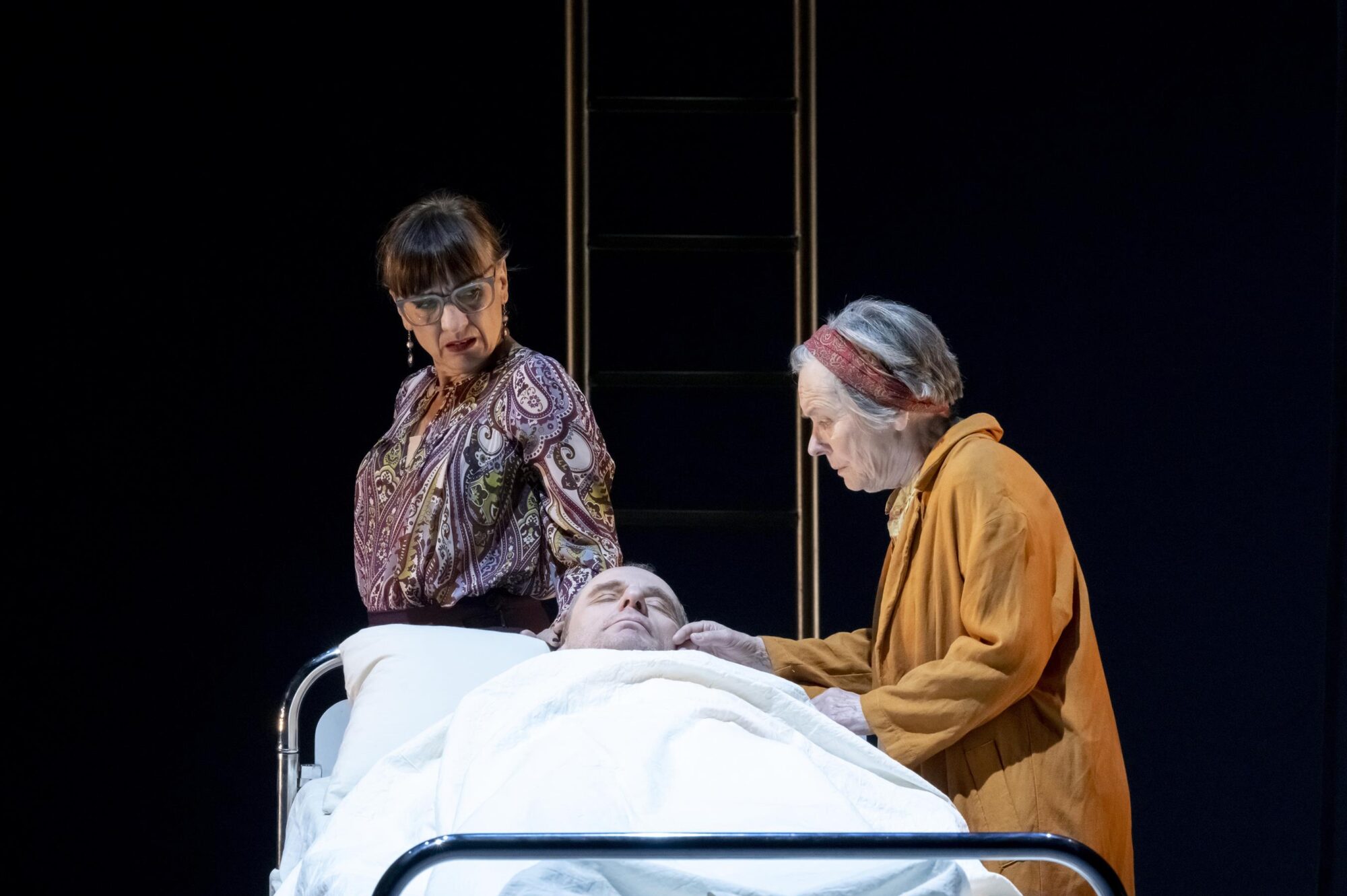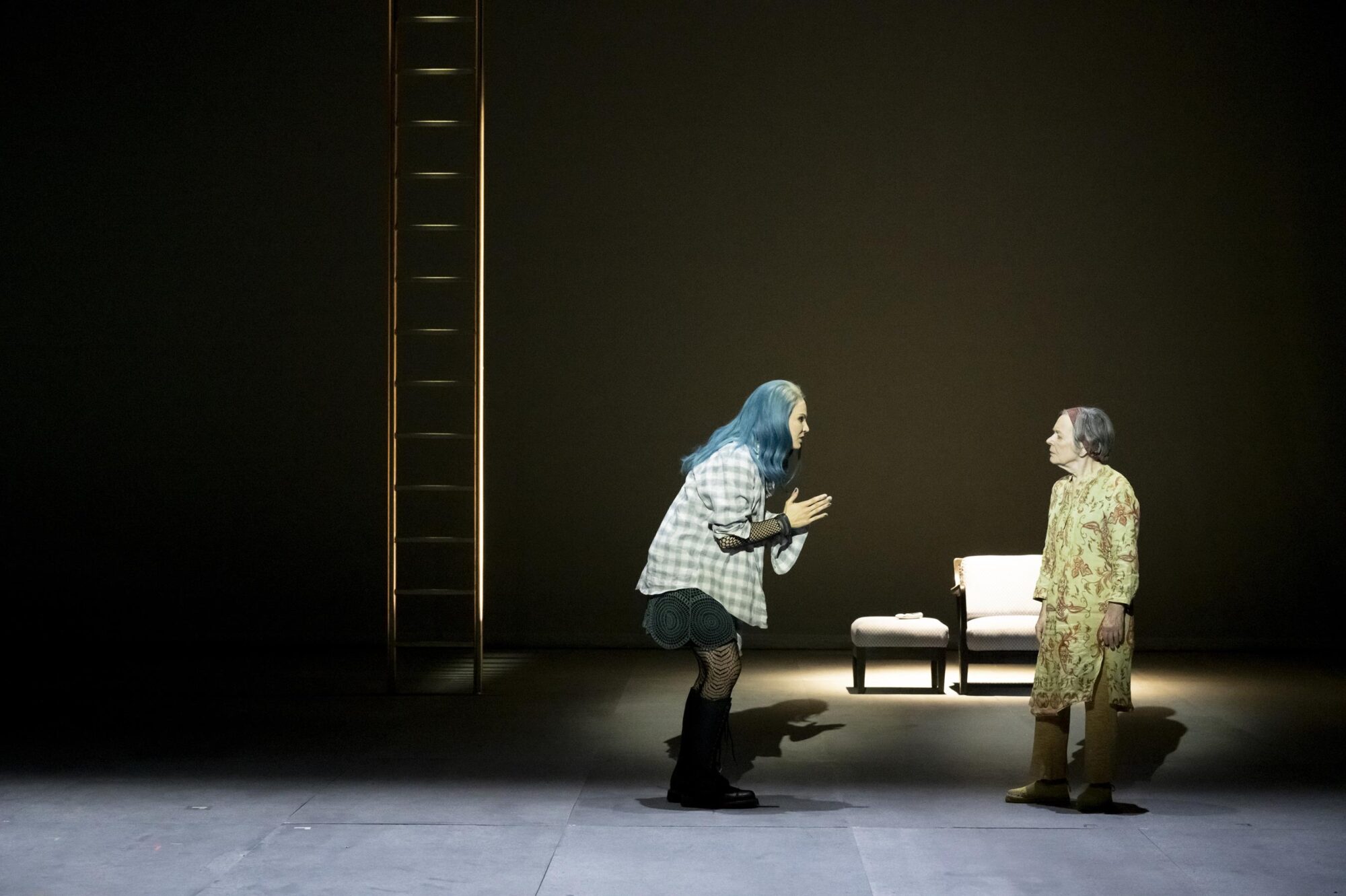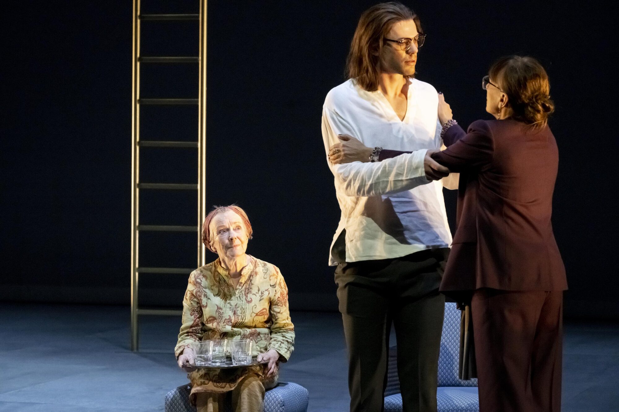 In der Mitte der Bühne (Gabriele Trinczek) ragt eine Leiter in die Höhe. Sie wird in der Krefelder Inszenierung von Wajdi Mouawads „Vögel“ nur einmal bespielt. Kurz nachdem sich Eitan (David Kösters) und Wahida (Katharina Kurschat) in einer New Yorker Bibliothek kennengelernt haben, tanzen sie frisch verliebt in einem Club um die Leiter herum […]. In den folgenden zweieinhalb Stunden spielt die Himmelsleiter keine Rolle mehr – und doch bleibt sie ein starkes Zeichen für ungenutzte Auswege aus dem irdischen Klein-Klein von Hass, Misstrauen und der Unfähigkeit zu ehrlichen Neuanfängen. Das Drama des gebürtigen Libanesen Wajdi Mouawad verbindet mit geschickter Seriendramaturgie die Geschichte des israelisch-palästinensischen Konflikts mit einer jüdischen Familie. Eitans Großmutter wird von Monika Lennartz schlagfertig, kratzbürstig und zugleich sensibel gespielt. Der Gast aus Berlin nutzt in einem bemerkenswert ausgeglichenen Ensemble die Rolle am Rande der Familie für so intensives wie leichtfüßiges Spiel. An ihrer Seite spielt der langjährige lokale Star Joachim Henschke zum Ende seiner Krefelder Karriere ihren ehemaligen Mann als einen Fels in der Brandung, den so leicht nichts aus der Fassung bringt. […] All das ist glänzend in Dialoge gefasst, allerdings überlädt „Vögel“ […] die Figuren nicht nur an dieser Stelle ein wenig mit der realen konfliktreichen Geschichte im Nahen Osten samt Vorgeschichte im Holocaust. Im zweiten Teil wirken die Personen auf der Krefelder Bühne vor den Bildern von Kriegsopfern dann nicht nur optisch zuweilen etwas klein. Insgesamt gelingt dem scheidenden Schauspieldirektor Matthias Gehrt jedoch eine überzeugende Abschiedsinszenierung. Nicht nur wegen der ukrainischen Schauspielerin Kateryna Nazemtseva in der Rolle der Krankenschwester und des aus Syrien stammenden Raafat Daboul als dem arabischen Gelehrten Al-Hasan Al Waazan, einem kulturellen Grenzgänger im 15. Jahrhundert, ist die Aktualität dieses Dramas um Gewalt zwischen Völkern und Kulturen schlagend. Die Inszenierung ist ein würdiger Abschluss einer Schauspieldirektion, die den Blick des Schauspiels in Krefeld und Mönchengladbach seit vielen Jahren auch in Richtung außereuropäischen Theaters öffnet. […]