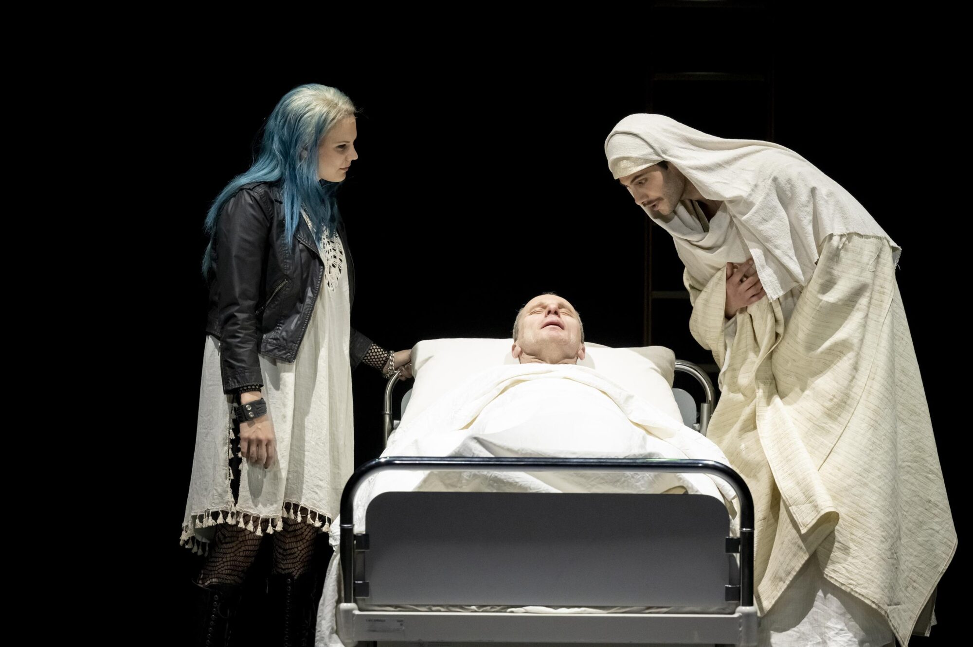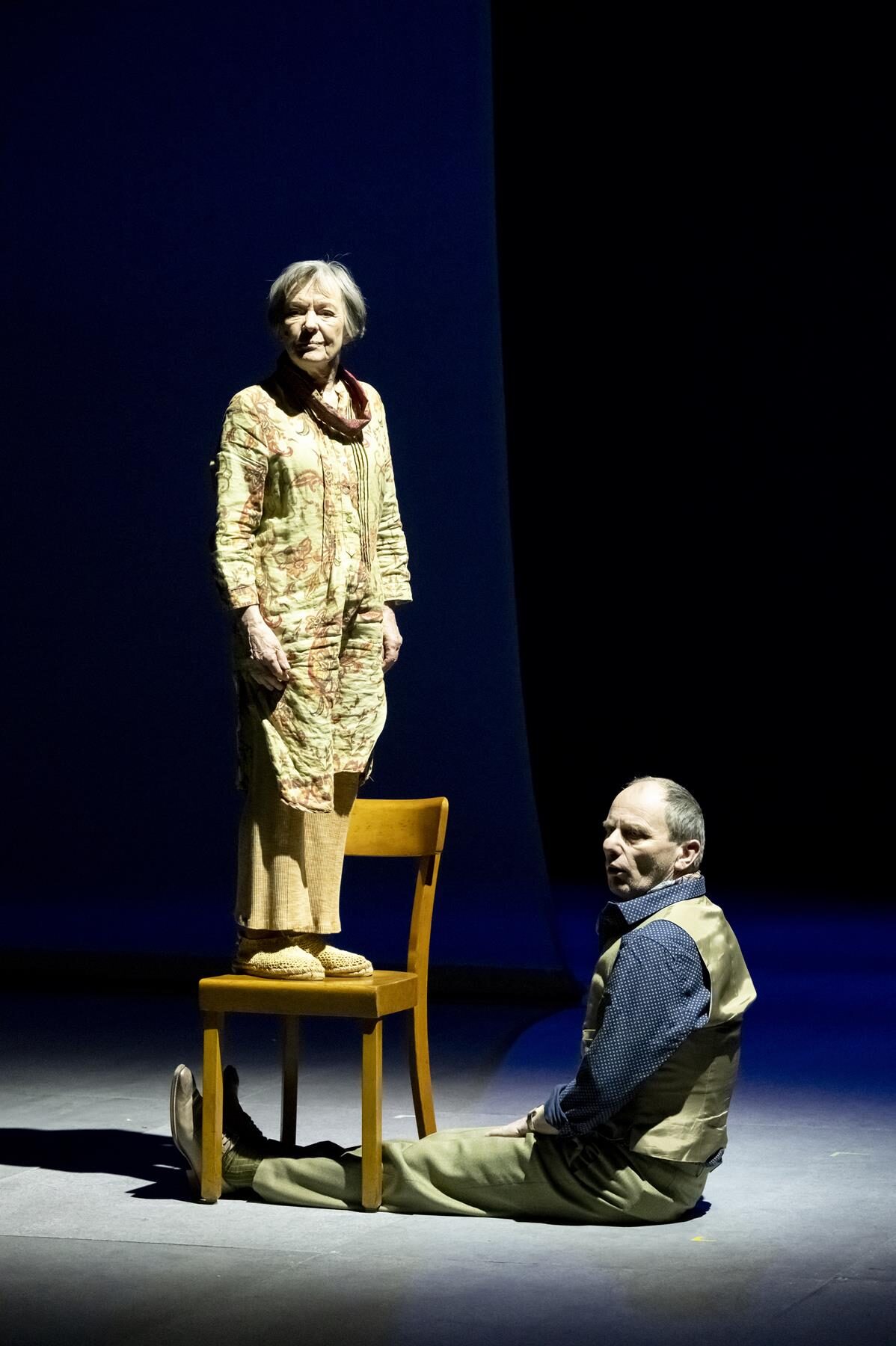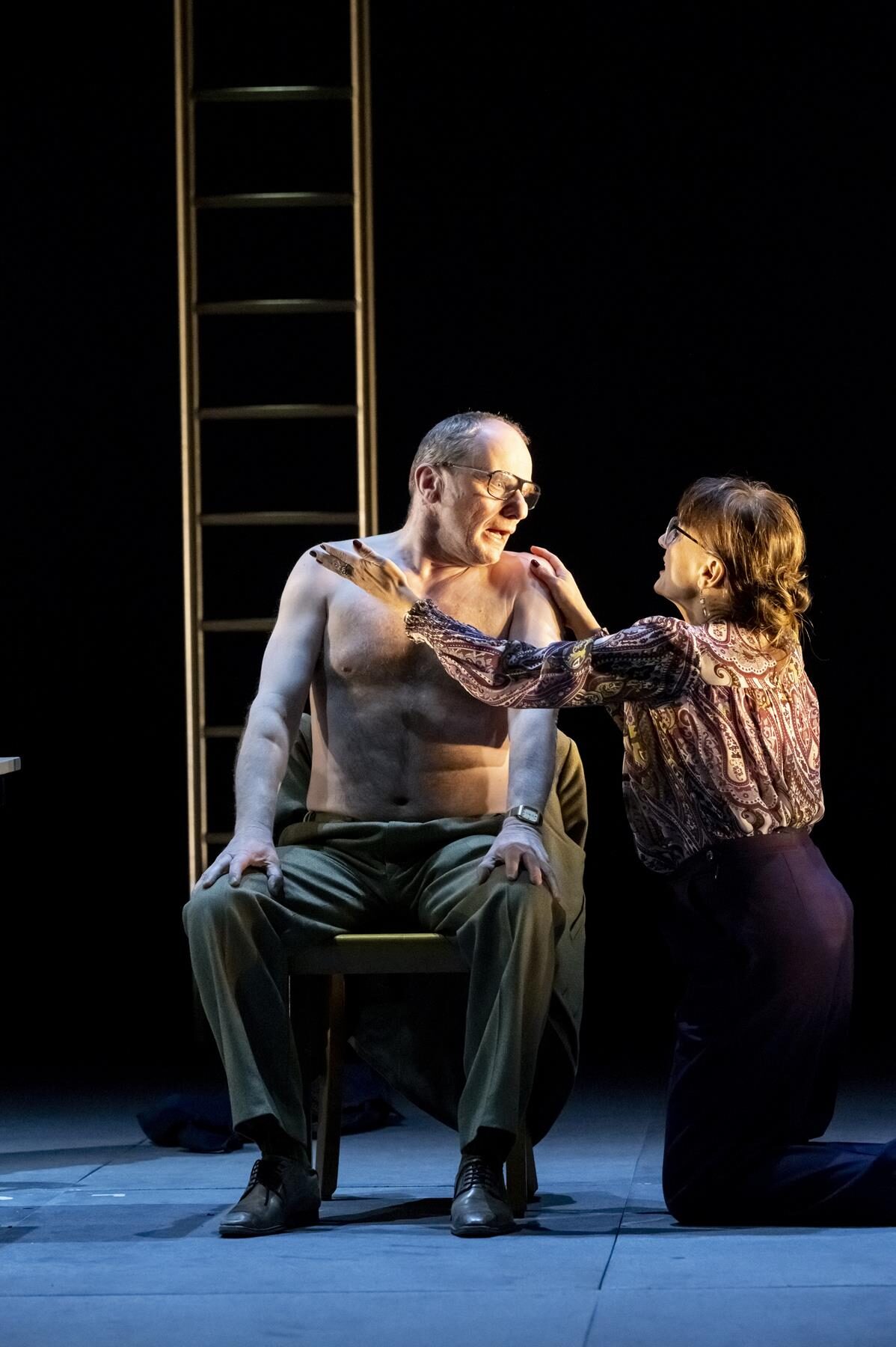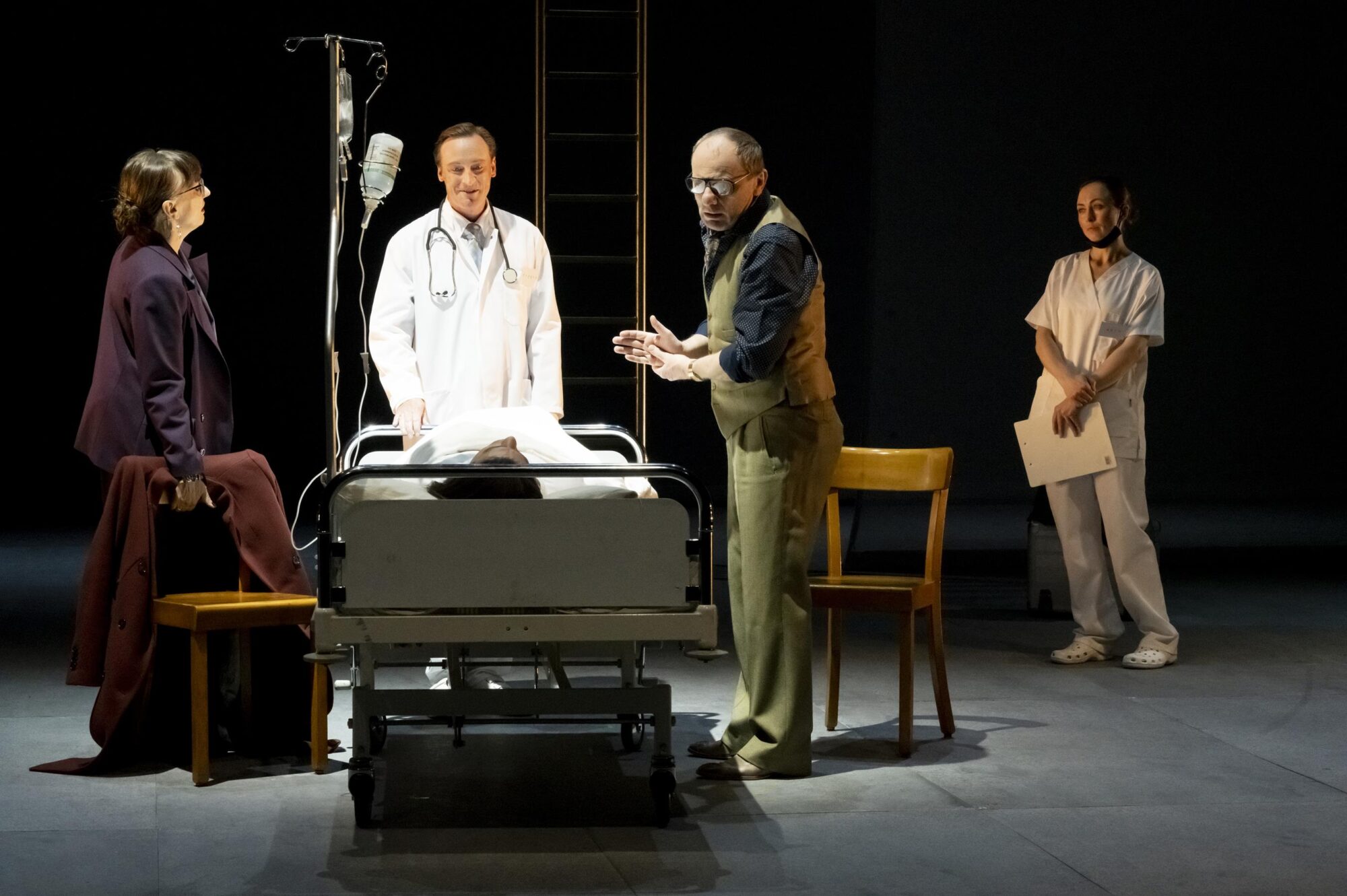 In der Mitte der Bühne (Gabriele Trinczek) ragt eine Leiter in die Höhe. Sie wird in der Krefelder Inszenierung von Wajdi Mouawads „Vögel“ nur einmal bespielt. Kurz nachdem sich Eitan (David Kösters) und Wahida (Katharina Kurschat) in einer New Yorker Bibliothek kennengelernt haben, tanzen sie frisch verliebt in einem Club um die Leiter herum […]. In den folgenden zweieinhalb Stunden spielt die Himmelsleiter keine Rolle mehr – und doch bleibt sie ein starkes Zeichen für ungenutzte Auswege aus dem irdischen Klein-Klein von Hass, Misstrauen und der Unfähigkeit zu ehrlichen Neuanfängen. Das Drama des gebürtigen Libanesen Wajdi Mouawad verbindet mit geschickter Seriendramaturgie die Geschichte des israelisch-palästinensischen Konflikts mit einer jüdischen Familie. Eitans Großmutter wird von Monika Lennartz schlagfertig, kratzbürstig und zugleich sensibel gespielt. Der Gast aus Berlin nutzt in einem bemerkenswert ausgeglichenen Ensemble die Rolle am Rande der Familie für so intensives wie leichtfüßiges Spiel. An ihrer Seite spielt der langjährige lokale Star Joachim Henschke zum Ende seiner Krefelder Karriere ihren ehemaligen Mann als einen Fels in der Brandung, den so leicht nichts aus der Fassung bringt. […] All das ist glänzend in Dialoge gefasst, allerdings überlädt „Vögel“ […] die Figuren nicht nur an dieser Stelle ein wenig mit der realen konfliktreichen Geschichte im Nahen Osten samt Vorgeschichte im Holocaust. Im zweiten Teil wirken die Personen auf der Krefelder Bühne vor den Bildern von Kriegsopfern dann nicht nur optisch zuweilen etwas klein. Insgesamt gelingt dem scheidenden Schauspieldirektor Matthias Gehrt jedoch eine überzeugende Abschiedsinszenierung. Nicht nur wegen der ukrainischen Schauspielerin Kateryna Nazemtseva in der Rolle der Krankenschwester und des aus Syrien stammenden Raafat Daboul als dem arabischen Gelehrten Al-Hasan Al Waazan, einem kulturellen Grenzgänger im 15. Jahrhundert, ist die Aktualität dieses Dramas um Gewalt zwischen Völkern und Kulturen schlagend. Die Inszenierung ist ein würdiger Abschluss einer Schauspieldirektion, die den Blick des Schauspiels in Krefeld und Mönchengladbach seit vielen Jahren auch in Richtung außereuropäischen Theaters öffnet. […]