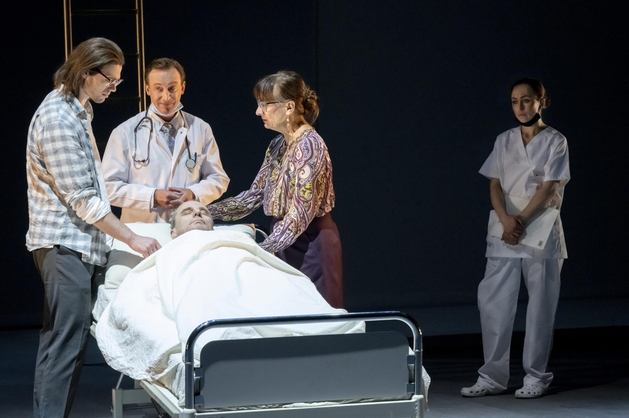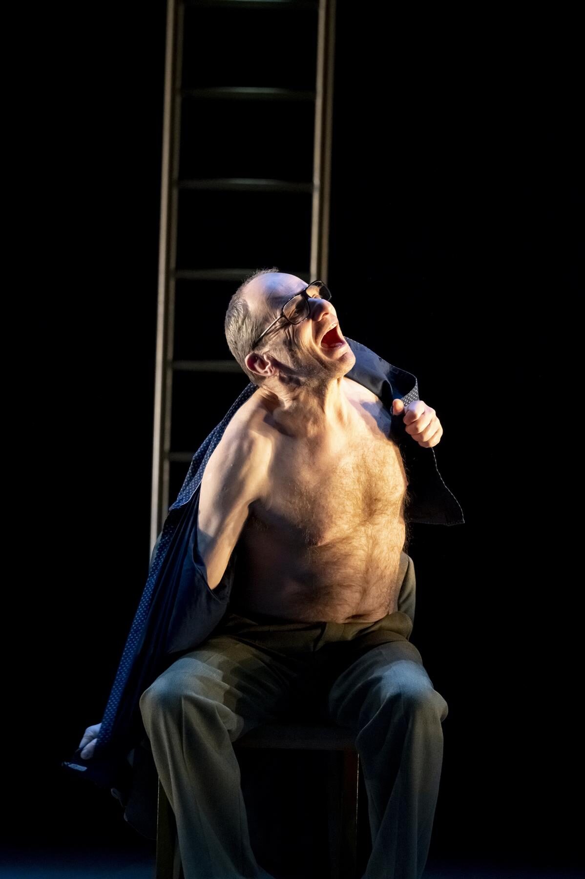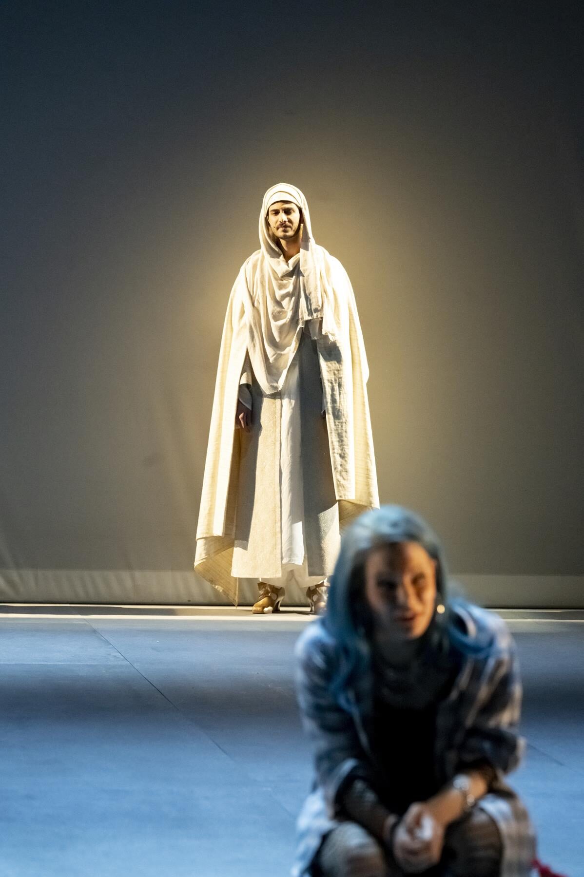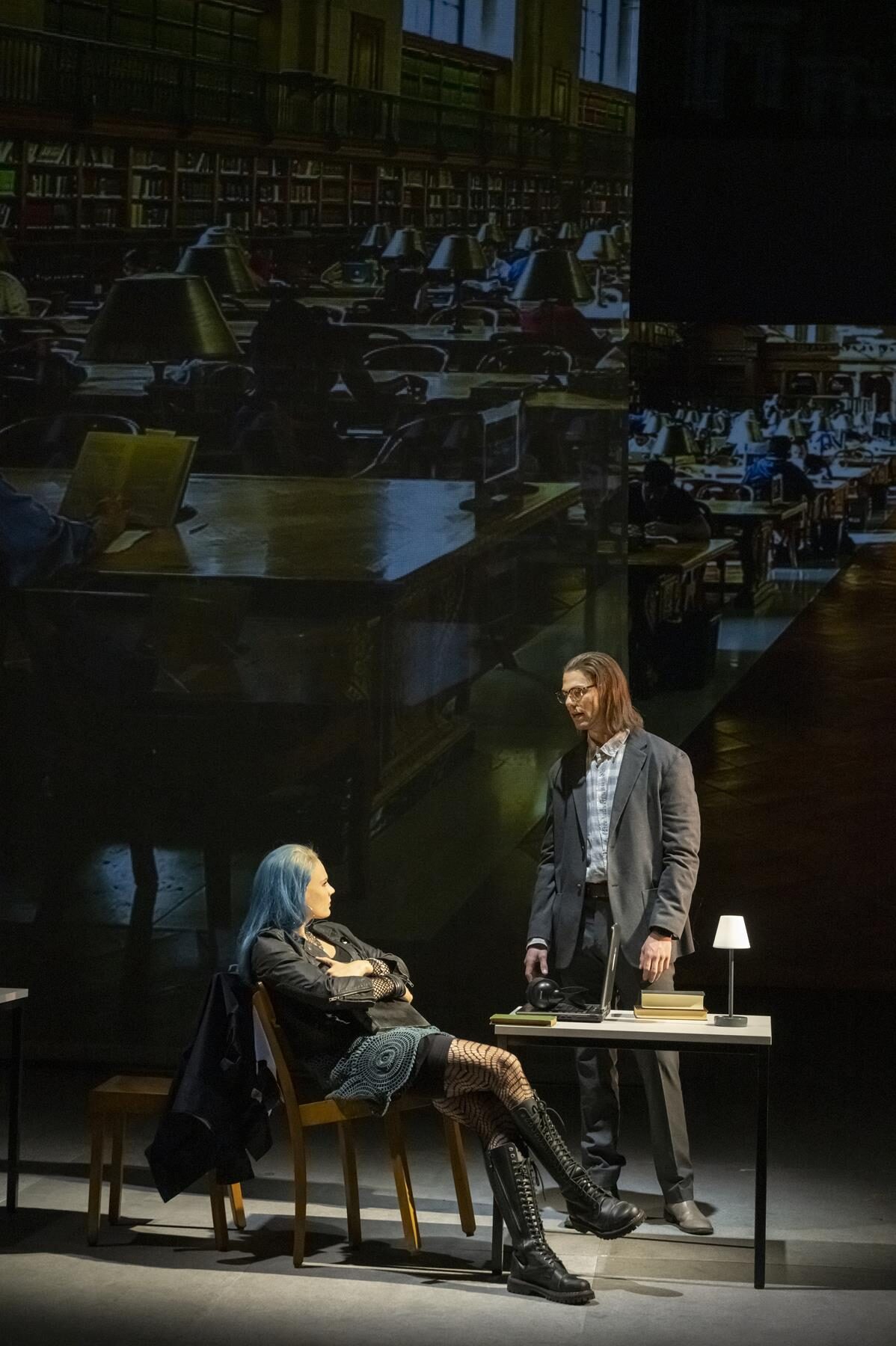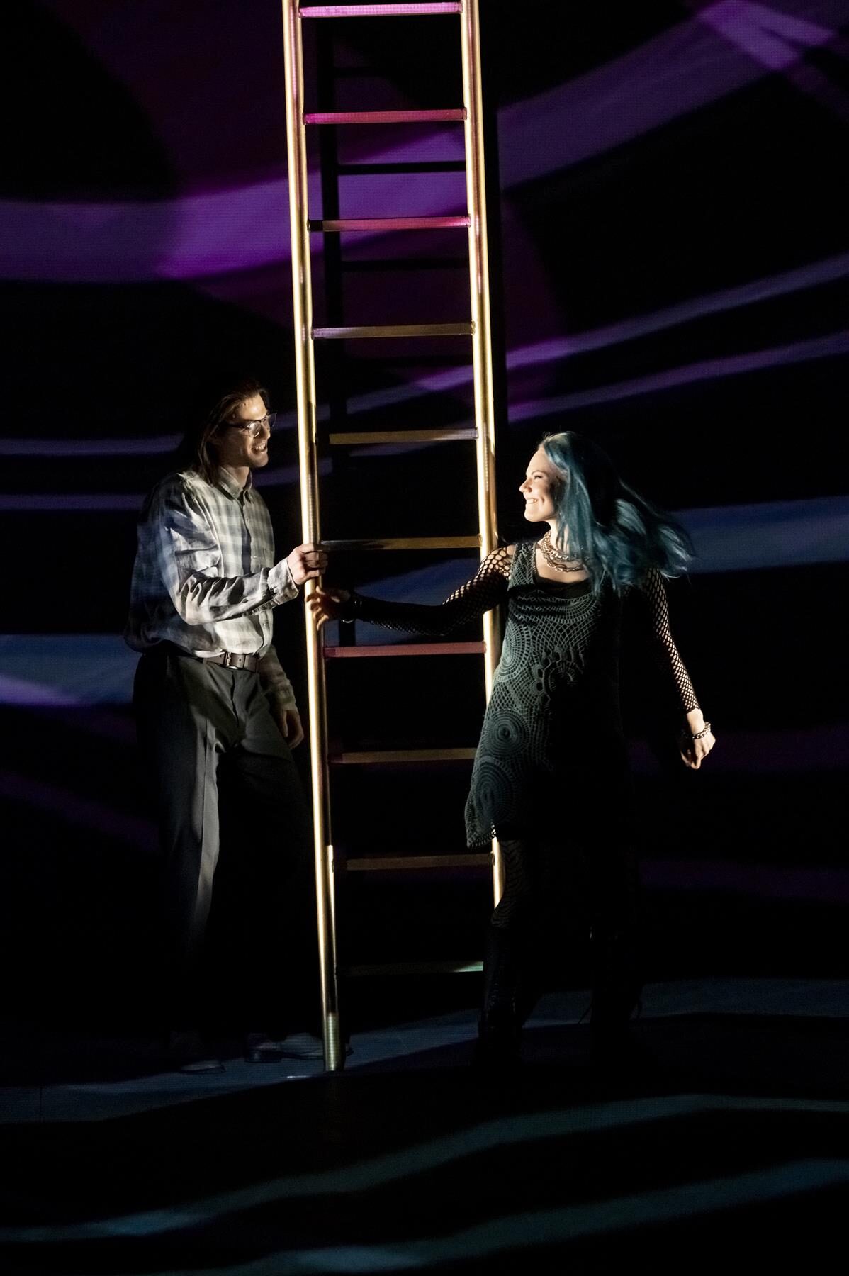 In der Mitte der Bühne (Gabriele Trinczek) ragt eine Leiter in die Höhe. Sie wird in der Krefelder Inszenierung von Wajdi Mouawads „Vögel“ nur einmal bespielt. Kurz nachdem sich Eitan (David Kösters) und Wahida (Katharina Kurschat) in einer New Yorker Bibliothek kennengelernt haben, tanzen sie frisch verliebt in einem Club um die Leiter herum […]. In den folgenden zweieinhalb Stunden spielt die Himmelsleiter keine Rolle mehr – und doch bleibt sie ein starkes Zeichen für ungenutzte Auswege aus dem irdischen Klein-Klein von Hass, Misstrauen und der Unfähigkeit zu ehrlichen Neuanfängen. Das Drama des gebürtigen Libanesen Wajdi Mouawad verbindet mit geschickter Seriendramaturgie die Geschichte des israelisch-palästinensischen Konflikts mit einer jüdischen Familie. Eitans Großmutter wird von Monika Lennartz schlagfertig, kratzbürstig und zugleich sensibel gespielt. Der Gast aus Berlin nutzt in einem bemerkenswert ausgeglichenen Ensemble die Rolle am Rande der Familie für so intensives wie leichtfüßiges Spiel. An ihrer Seite spielt der langjährige lokale Star Joachim Henschke zum Ende seiner Krefelder Karriere ihren ehemaligen Mann als einen Fels in der Brandung, den so leicht nichts aus der Fassung bringt. […] All das ist glänzend in Dialoge gefasst, allerdings überlädt „Vögel“ […] die Figuren nicht nur an dieser Stelle ein wenig mit der realen konfliktreichen Geschichte im Nahen Osten samt Vorgeschichte im Holocaust. Im zweiten Teil wirken die Personen auf der Krefelder Bühne vor den Bildern von Kriegsopfern dann nicht nur optisch zuweilen etwas klein. Insgesamt gelingt dem scheidenden Schauspieldirektor Matthias Gehrt jedoch eine überzeugende Abschiedsinszenierung. Nicht nur wegen der ukrainischen Schauspielerin Kateryna Nazemtseva in der Rolle der Krankenschwester und des aus Syrien stammenden Raafat Daboul als dem arabischen Gelehrten Al-Hasan Al Waazan, einem kulturellen Grenzgänger im 15. Jahrhundert, ist die Aktualität dieses Dramas um Gewalt zwischen Völkern und Kulturen schlagend. Die Inszenierung ist ein würdiger Abschluss einer Schauspieldirektion, die den Blick des Schauspiels in Krefeld und Mönchengladbach seit vielen Jahren auch in Richtung außereuropäischen Theaters öffnet. […]