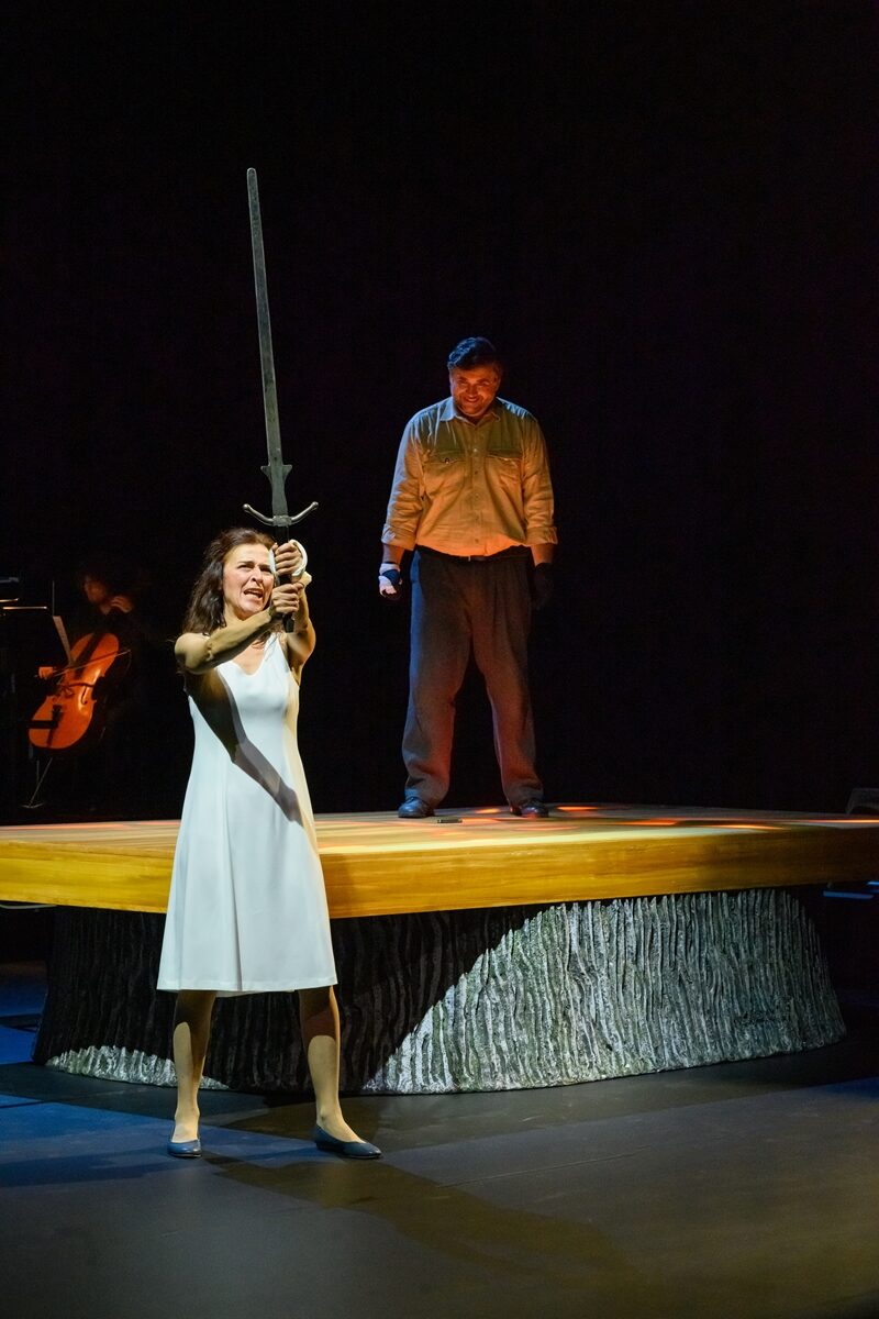 (…) Ulrich Proschkas szenisches Arrangement lodert in schönsten Farben, und das Publikum ist schnell entflammt. Denn die musikalische Qualität hat großes Wagnerformat. Die Begegnungen von Siegmund und Sieglinde strotzen vor Sexappeal, gerade, weil sie ständig ausgebremst werden. Und das Publikum darf nach Herzenslust hören, sehen, deuten. Ulrich Proschka schwebte eine „musikalische Nahaufnahme des Geschwisterpaares“ vor, eine Ibsen-artige Darstellung einer freudlosen, erzwungenen Ehe. Das ist gelungen. (…) Die Akteure sind grandios: Dorothea Herbert ist eine Sieglinde, vor der man niederknien möchte. Mit großer, warm-timbrierter Stimme und innigem Spiel entzieht sie sich den Ansprüchen ihres Mannes. (…) Das Leuchten, das der fremde Gast ihr entlockt, und das Strahlen, als sie in ihm den verlorenen Bruder erkennt, setzt sie mit stimmlichem Glanz um. Markus Wippich ist ein dezent unterkühlter Hunding, der sich seiner Autorität bewusst ist und in seinem Haus per Fingerschnipps und Kopfnicken Befehle erteilt. Sein markiger Bass ist eine Bank. Düsteres Drohen hüllt er in satten Klang Als Siegmund macht Markus Petsch eine stattliche Figur. Sein Tenor hat Brillanz. Wenn er mit großem Atem zu „Wälse, Wälse, wo ist mein Schwert“ anhebt, füllt er den Theaterraum bis unters Dach. In Krefeld wabert Hügel-Atmosphäre. (…) Andreas Fellner dirigiert nur vier Musiker, doch die erfüllen ihre Orchesterfunktion: Markus Preiser und Erik Alvarez je an einem Flügel, Cellist Konrad Philipp und Günther Schaffer (Pauke) lassen es gewittern, das Liebesmotiv schillern oder Verhängnis dräuen. Eine Lichtwand wetterleuchtet im Hintergrund, grünt zum Frühling der Gefühle, wird blutrot in der Schwertszene und öffnet sich zum Finale symbolträchtig. – Viele Bravi und langer Beifall des Publikums danken für einen großen Wagner-Abend im Kleinformat.